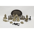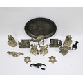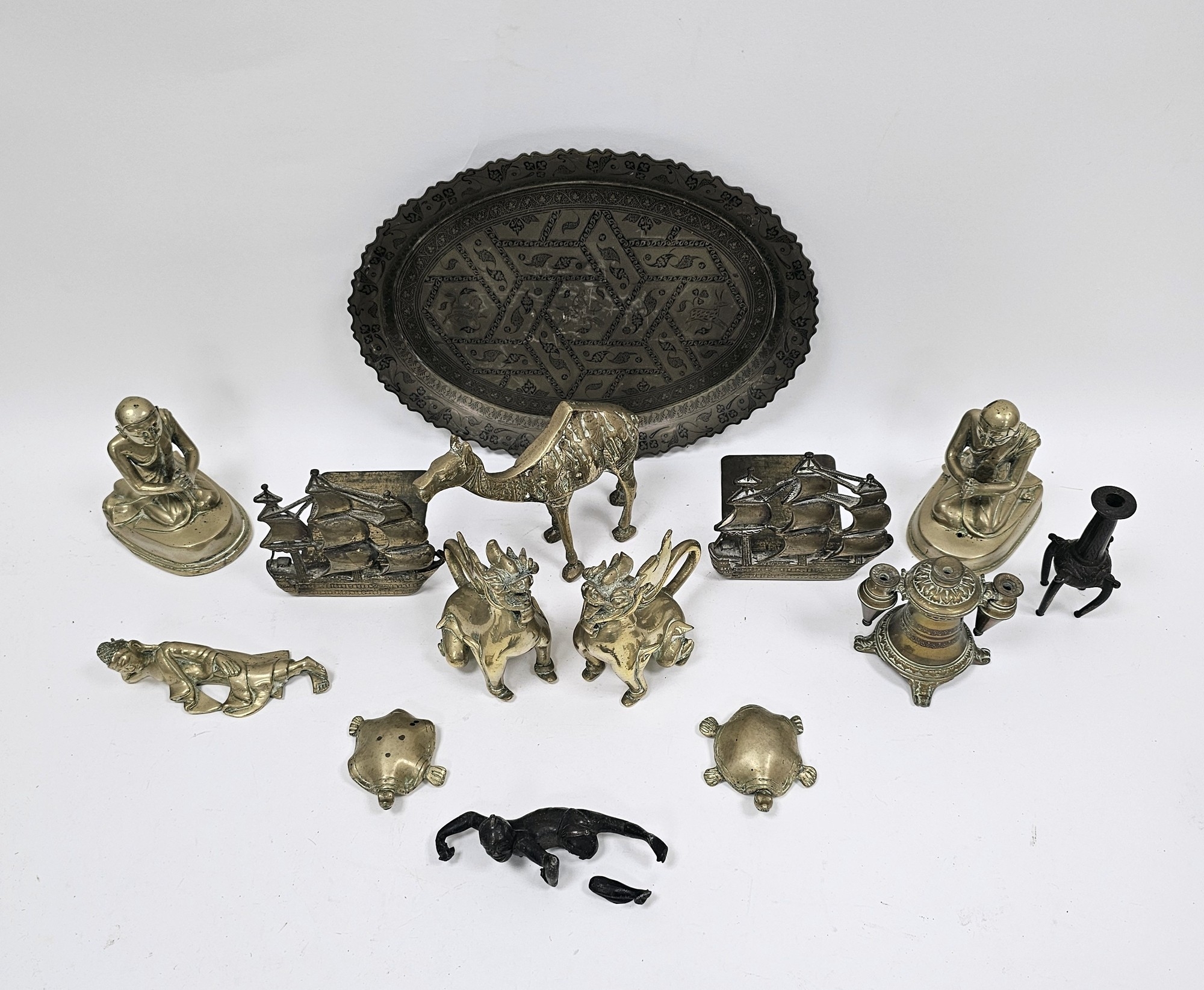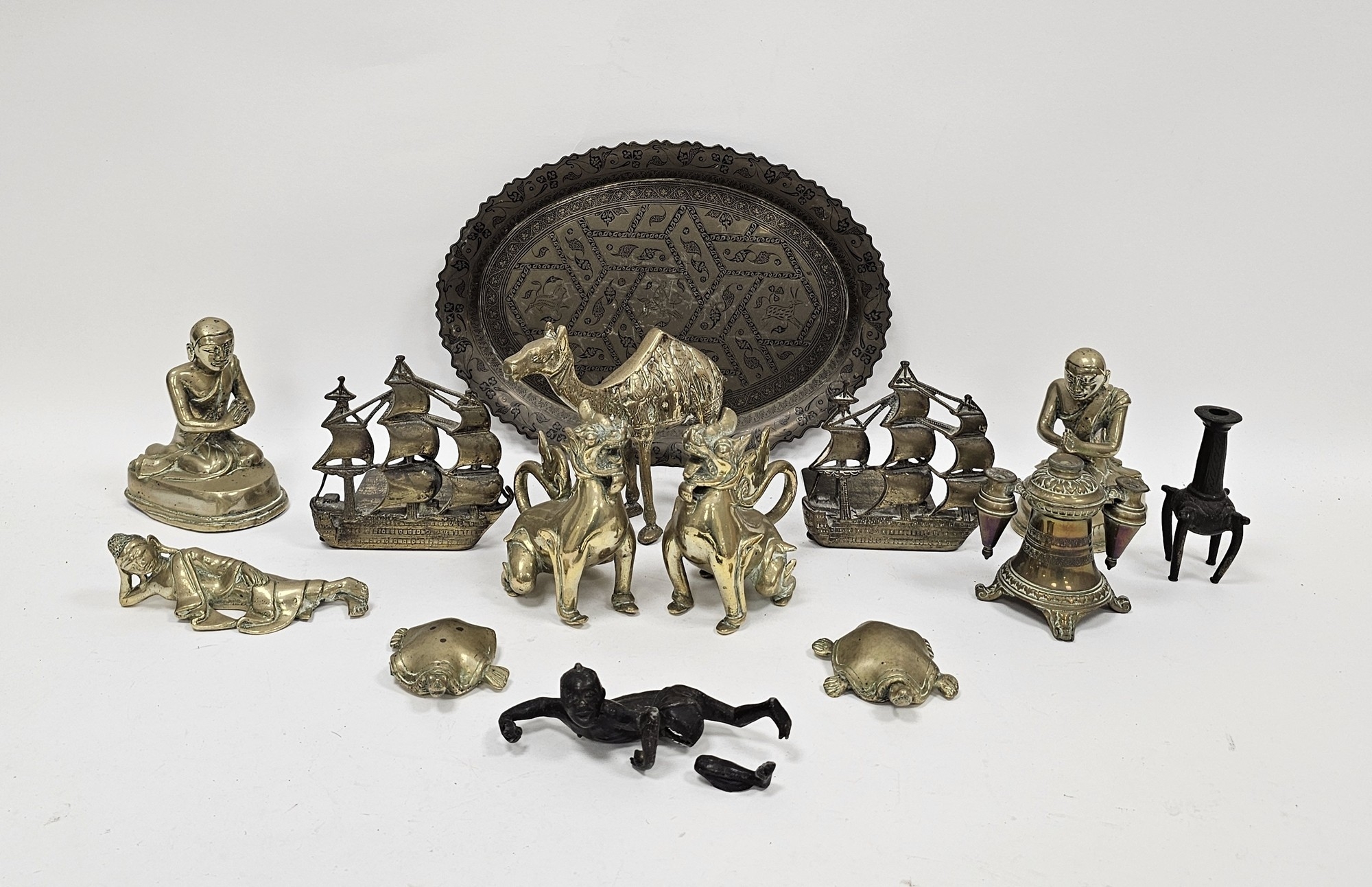 Collection of mainly Asian metalware including pair of brass foo dogs, 12cm high, pair of brass praying monks,13cm high, bronze incense burner, pair of brass ship bookends, brass trays and other figures and models