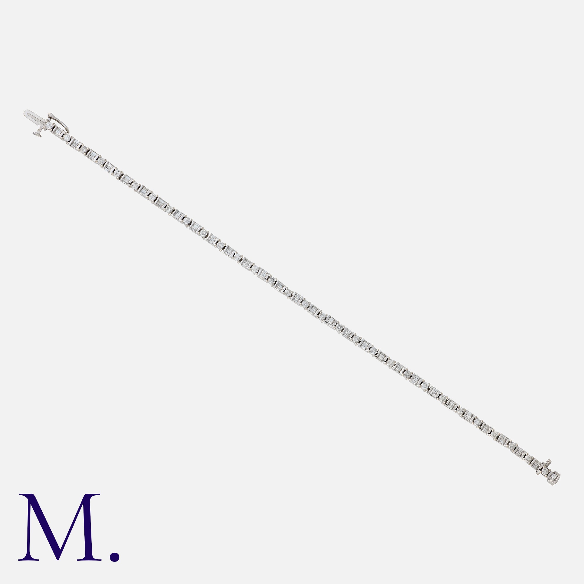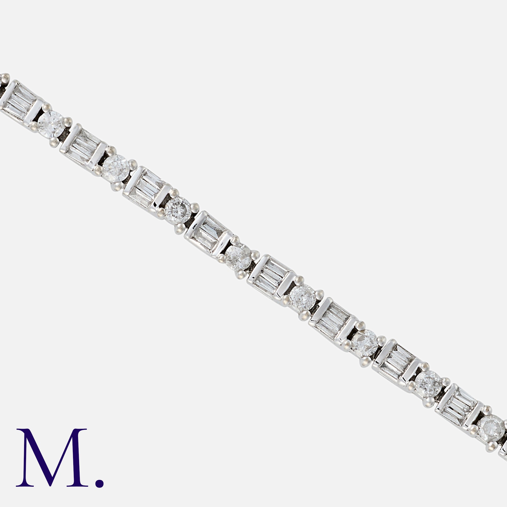 A Diamond Bracelet in white gold, set with round cut and baguette-cut diamonds weighing approx. 3.0ct in total. Stamped 14K indicating 14ct gold.