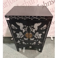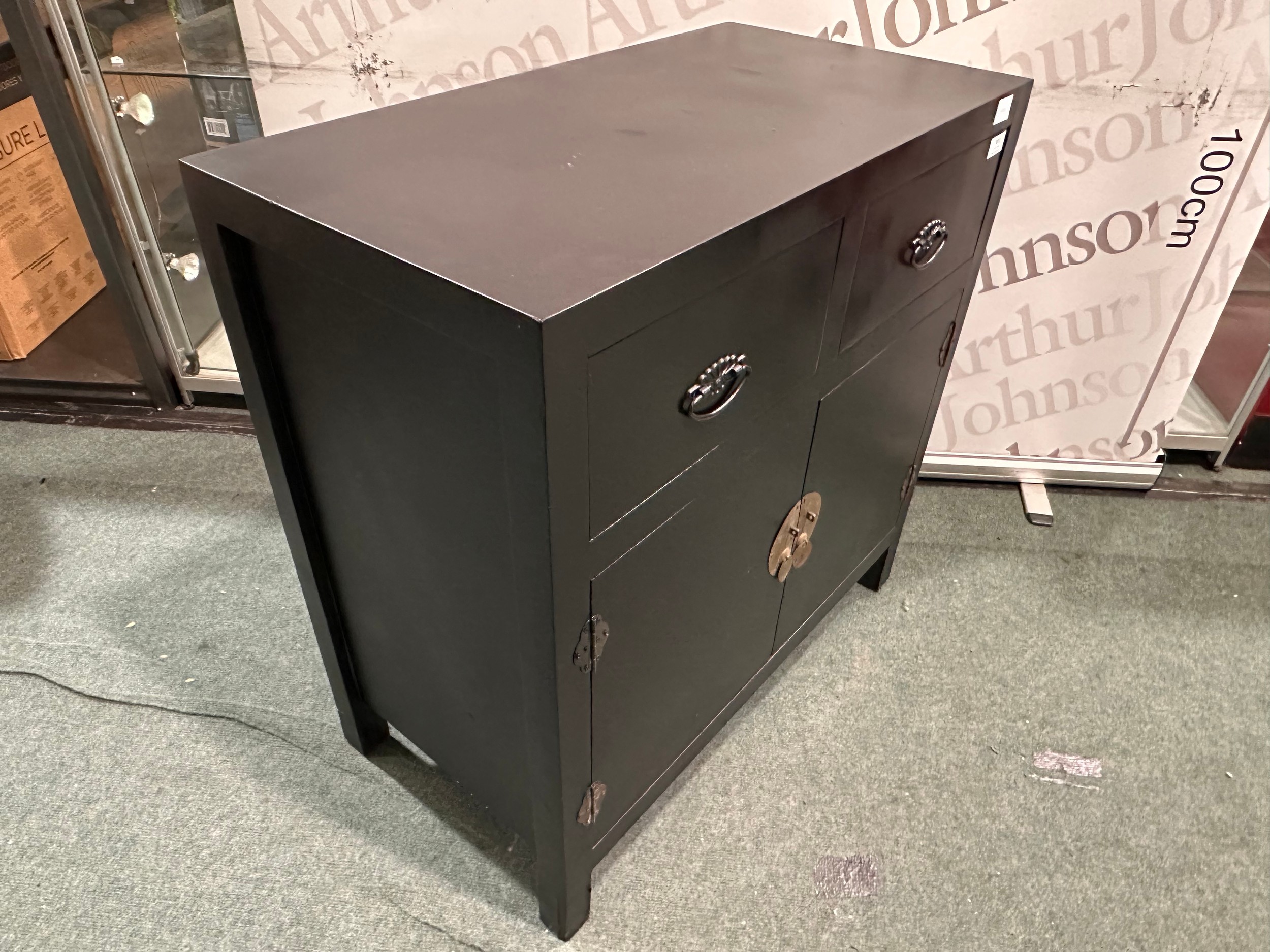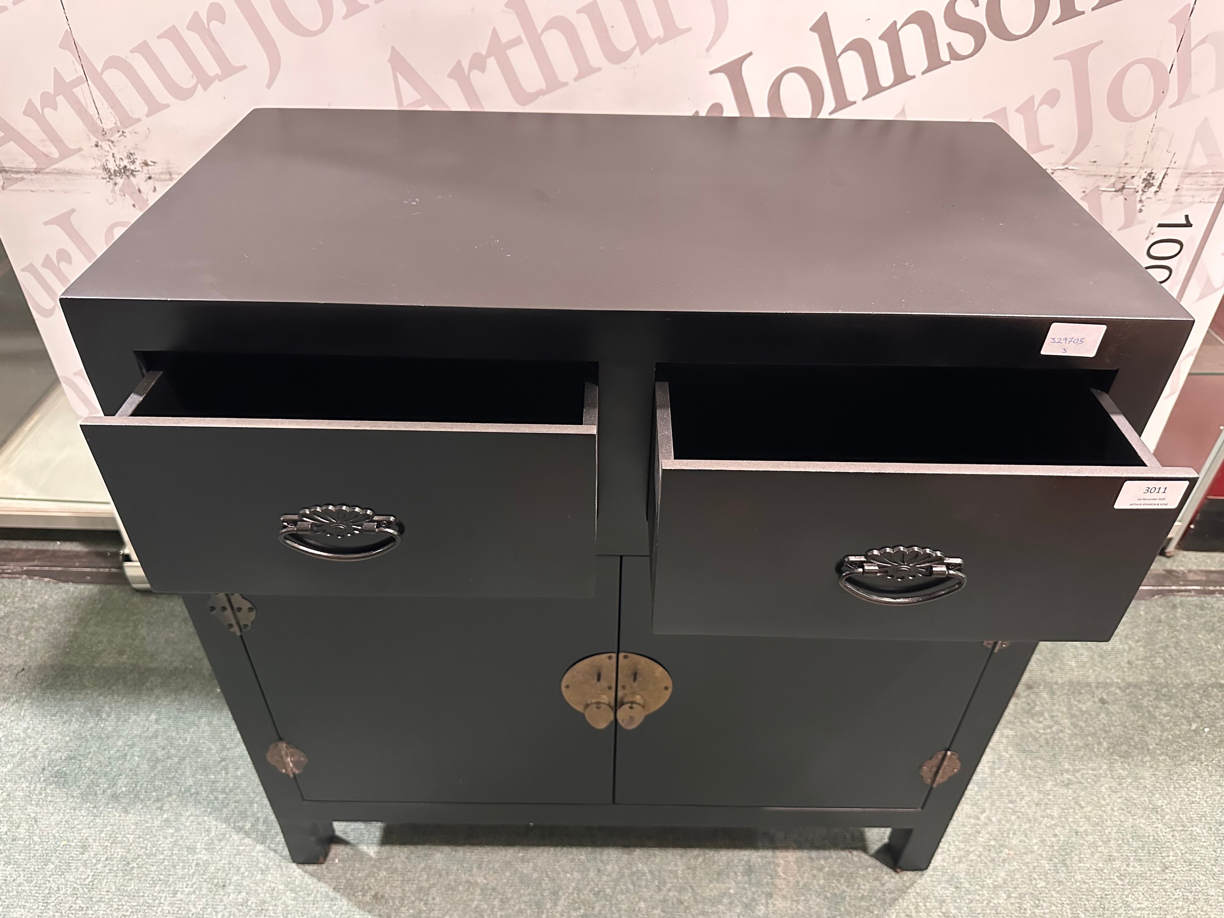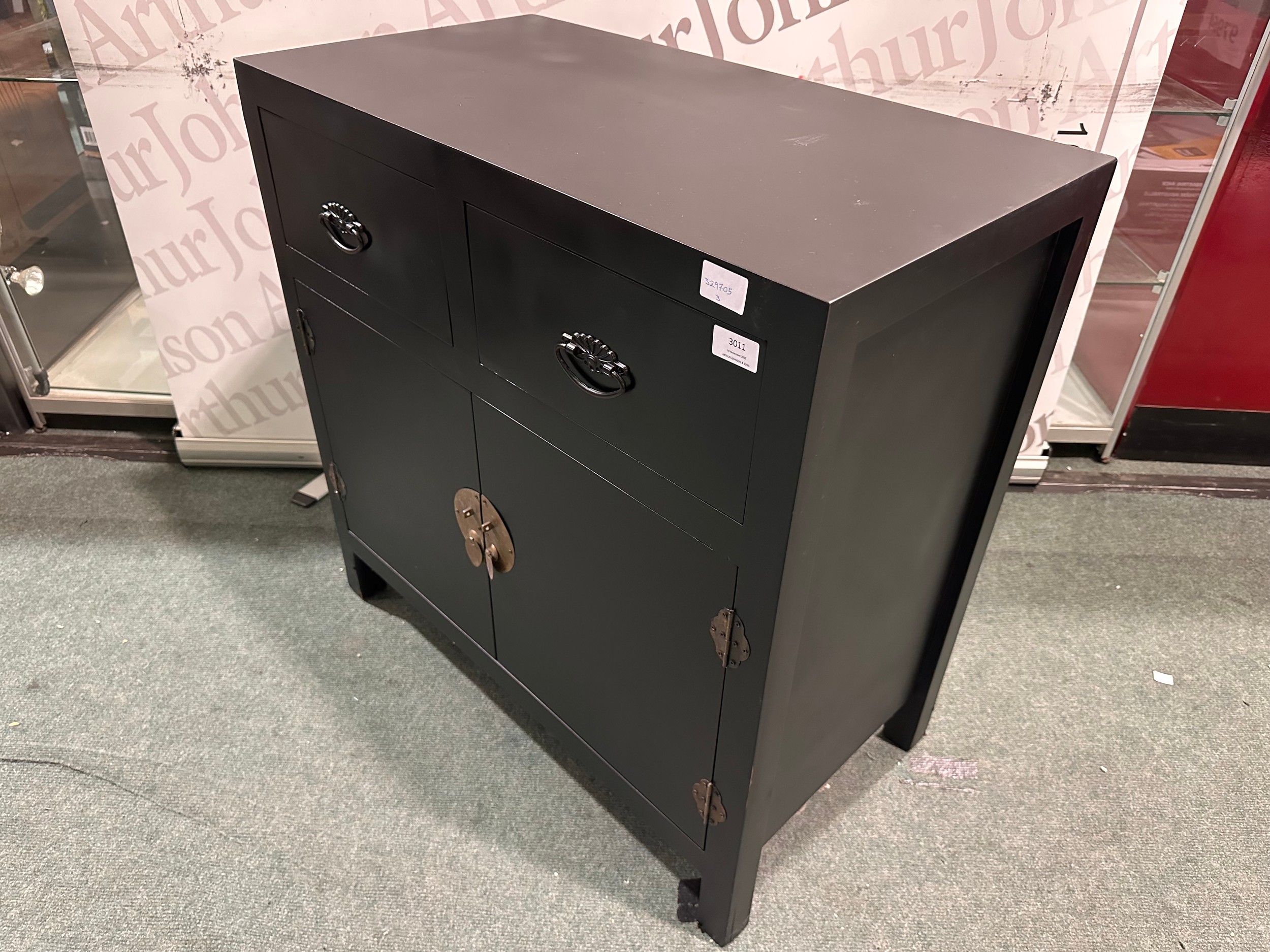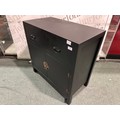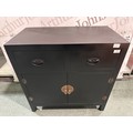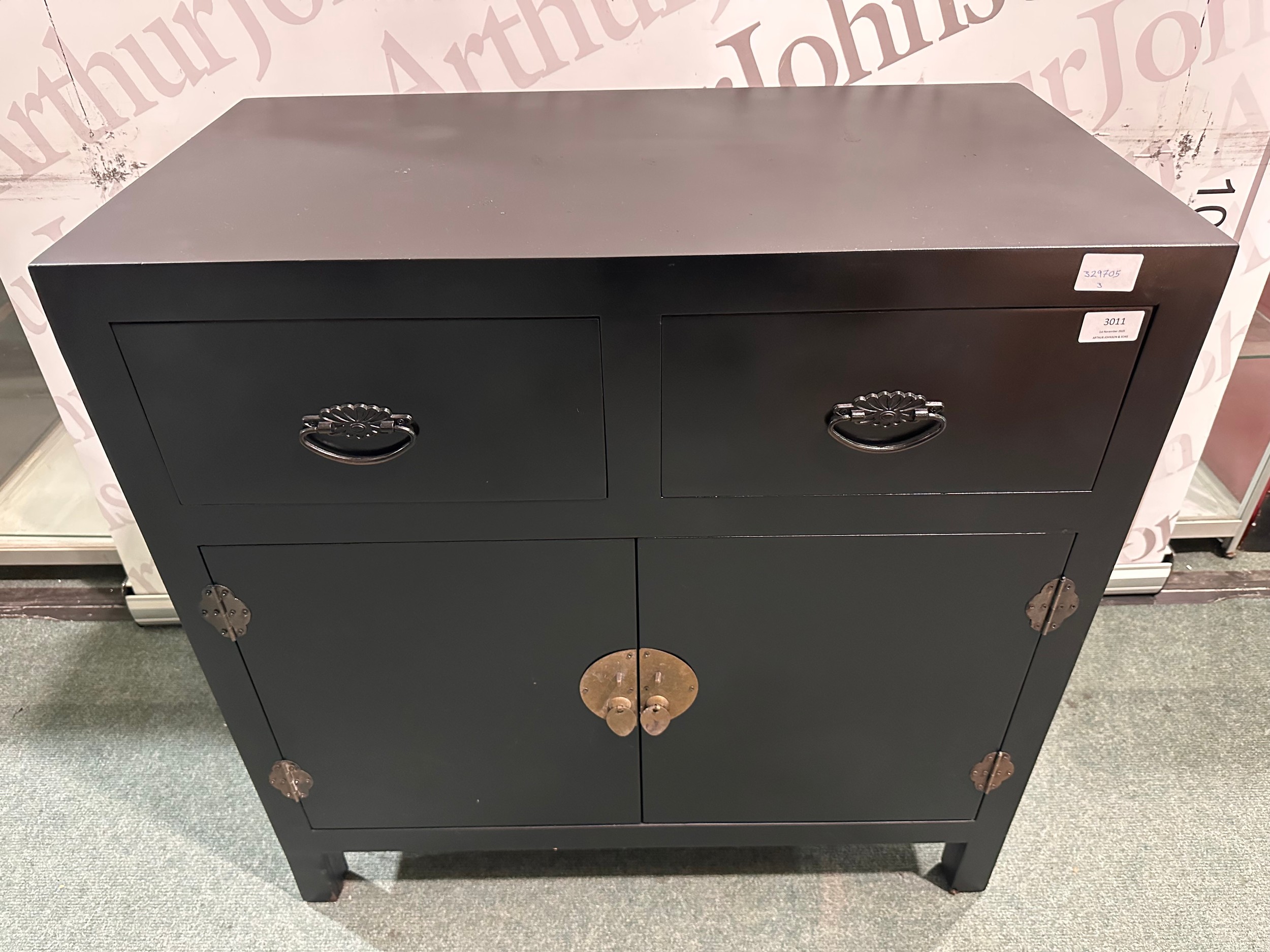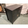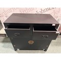 A black painted two drawer two door cabinet