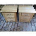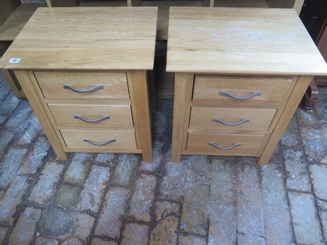 A pair of oak effect three drawer bedside chests, 57cm tall x 50cm x 40cm, generally good some marks to the top of one
