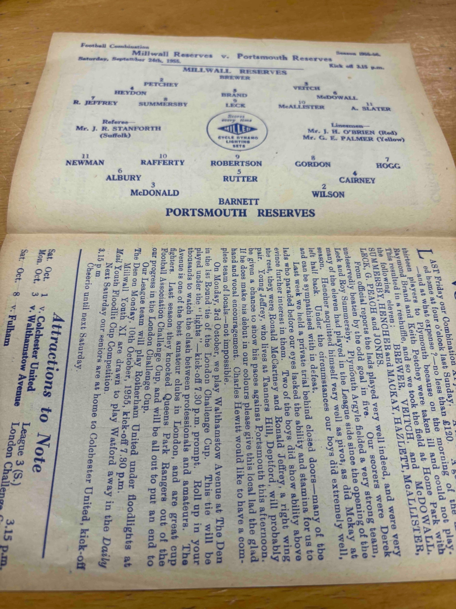 55/56 Millwall Reserves v Portsmouth Res, 4 page, sl tr.