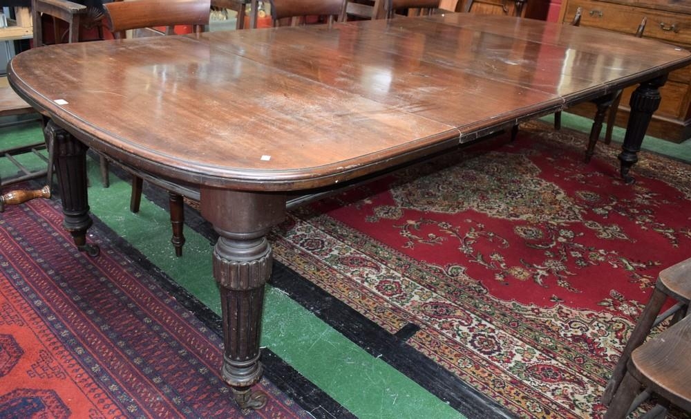 A Victorian mahogany extending dining table, moulded top with wind-out mechanism above a half-bowed frieze, tapered turned, reeded and fluted legs, ceramic casters, extends to 298cm