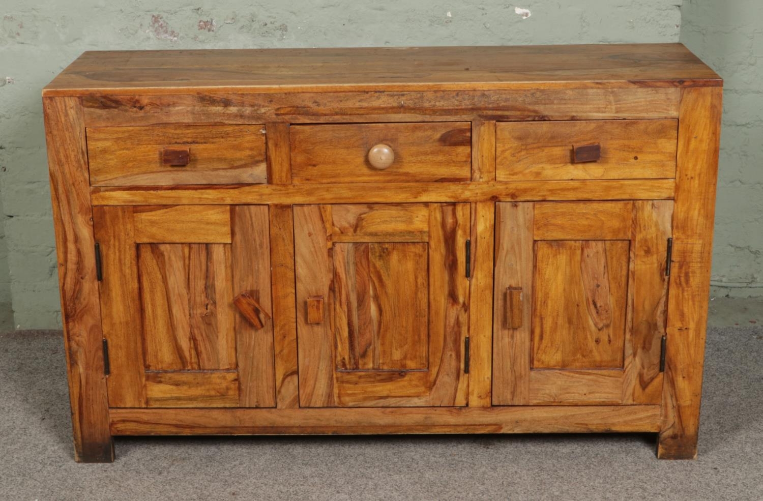 A contemporary mango wood sideboard with three upper drawers and three cupboards below. L131cm.
