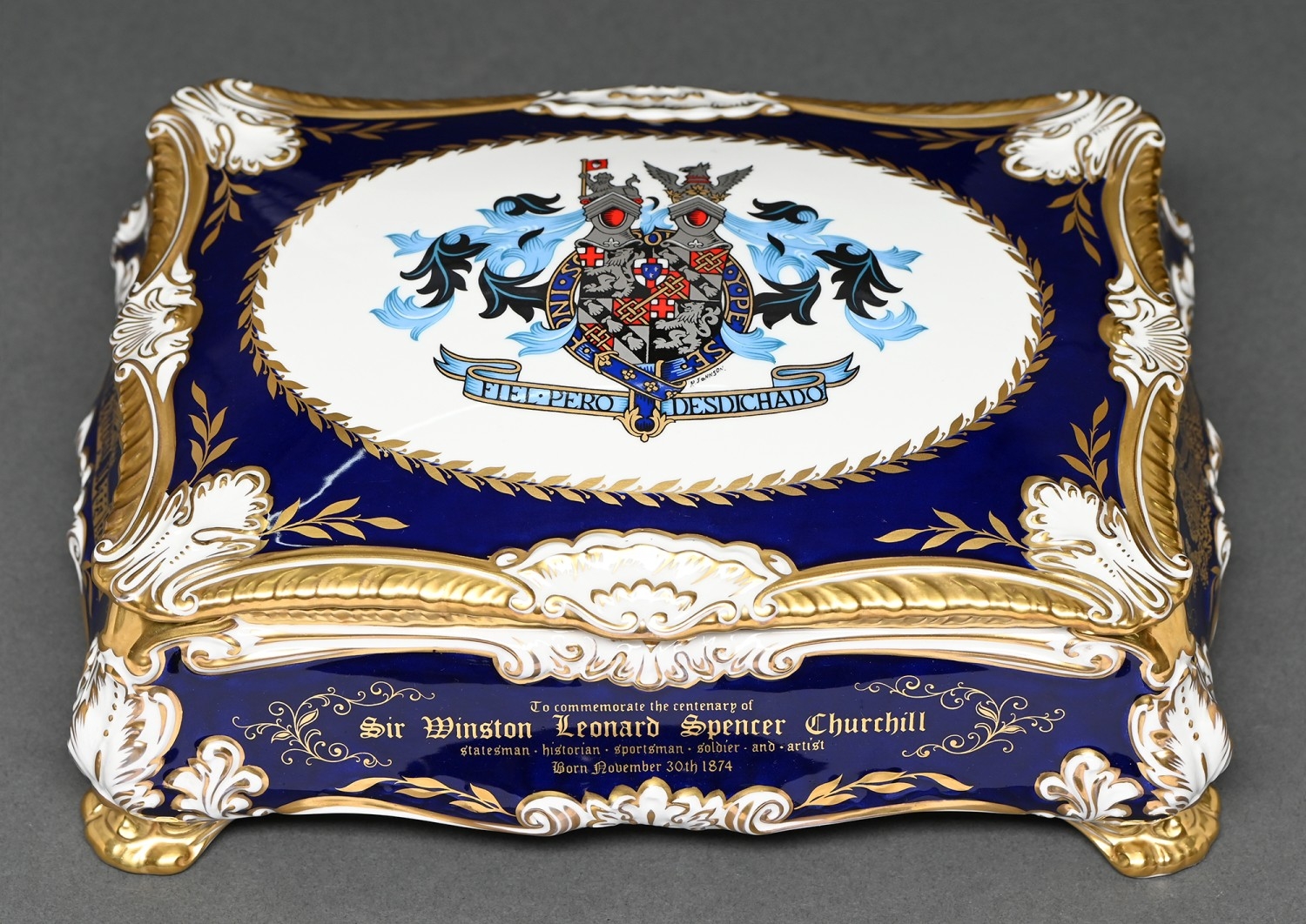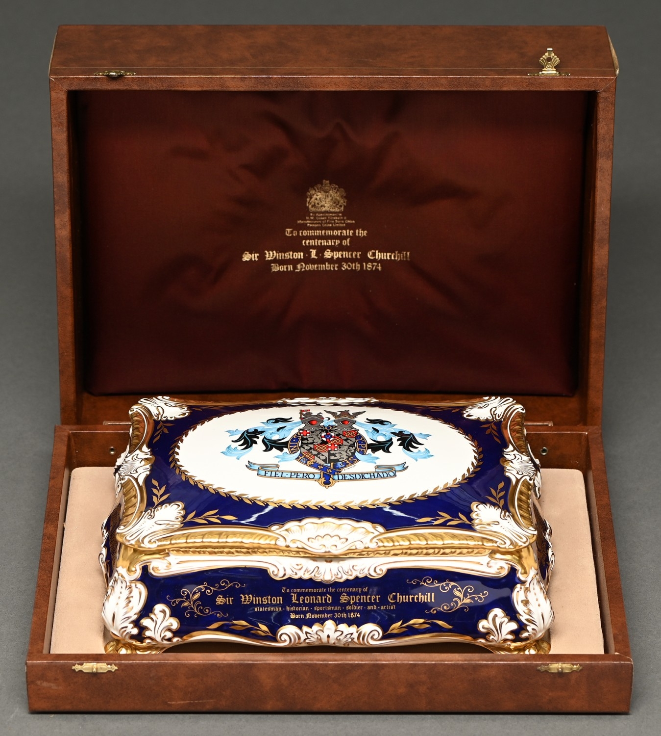 Winston Churchill. A Paragon bone china commemorative cigar casket for the centenary of Sir Winston Leonard Spencer Churchill, 1974, 10cm h; 18.5 x 24.5cm, boxed with certificate