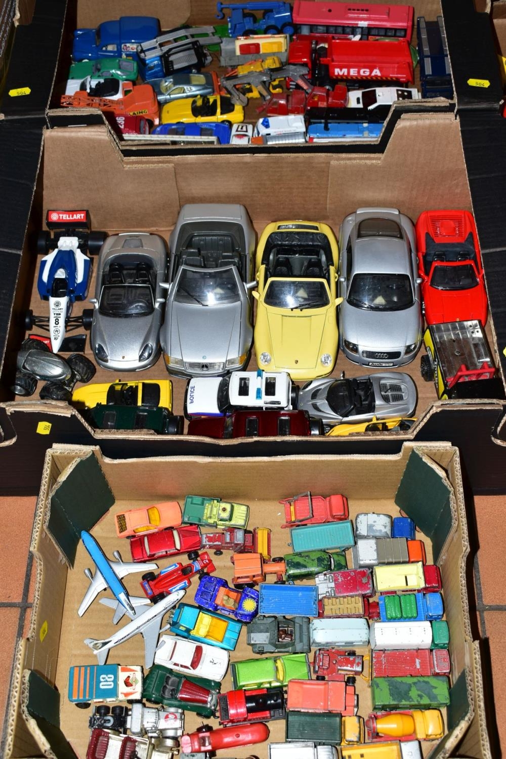 A QUANTITY OF UNBOXED AND ASSORTED PLAYWORN DIECAST VEHICLES, to include Matchbox, Corgi, Burago, Maisto etc (three boxes)
