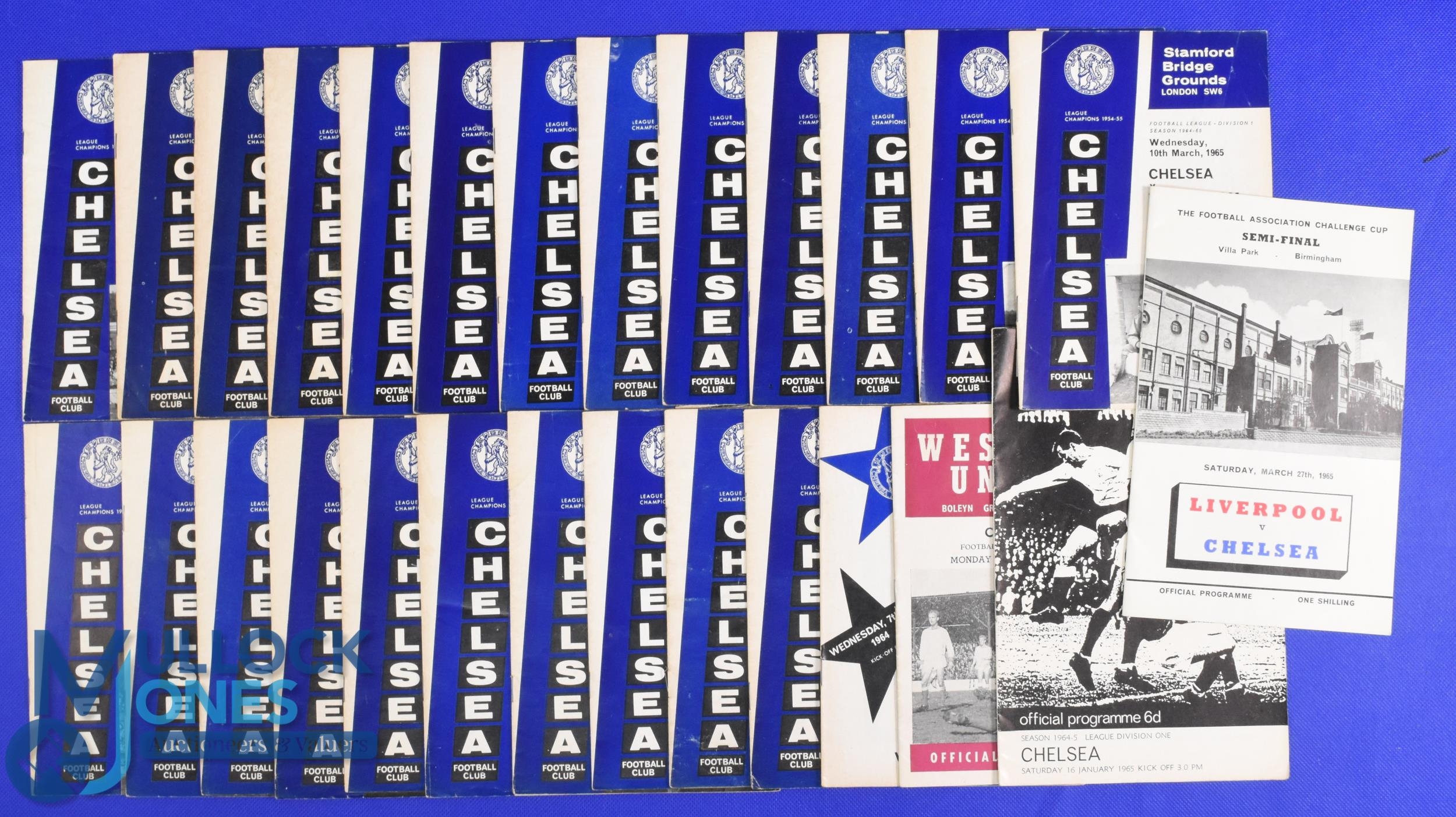 1964/65 Chelsea home match programmes league (17), FAC matches Northampton Town, Spurs, Peterborough Utd; FLC Swansea Town, Workington (attendance 8000), Aston Villa (FLC s/f); Benfica (friendly); aways at WHU, Fulham, Liverpool (FAC s/f at Villa Park); fair. (27)