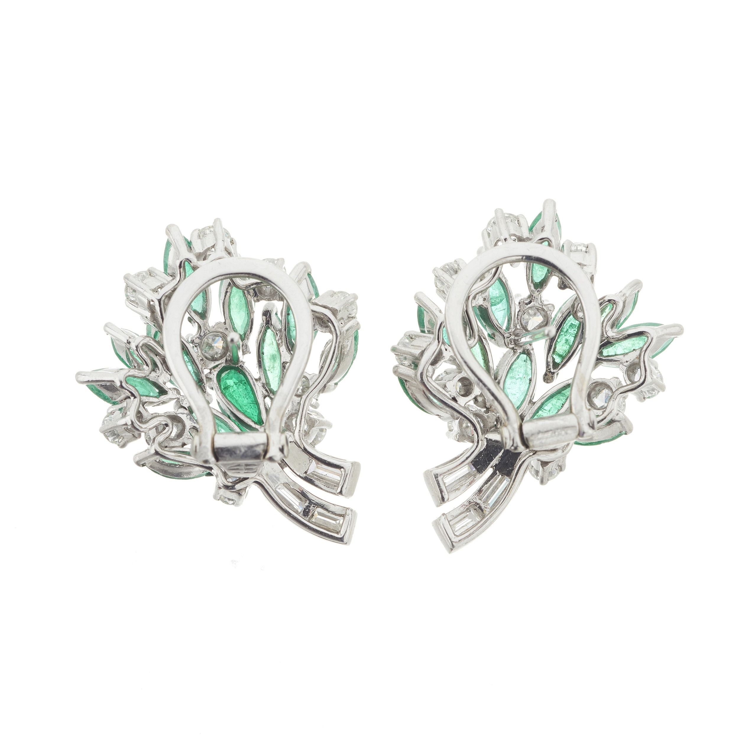 Overall good condition Light to moderate wear Post fittings for pierced ears with hinged backs Diamonds bright, lively and well matched Emeralds are predominantly well matched, a few are slightly darker green, emeralds are a medium to vivid green hue, generally well saturated, fair to poor clarity, all show inclusions, some with surface reaching fractures Clients are advised to view and inspect items before bidding and they must satisfy themselves as to the condition of every lot For enquiries about this lot please contact David Pregun at david@kinghamsauctioneers.com