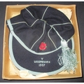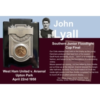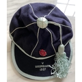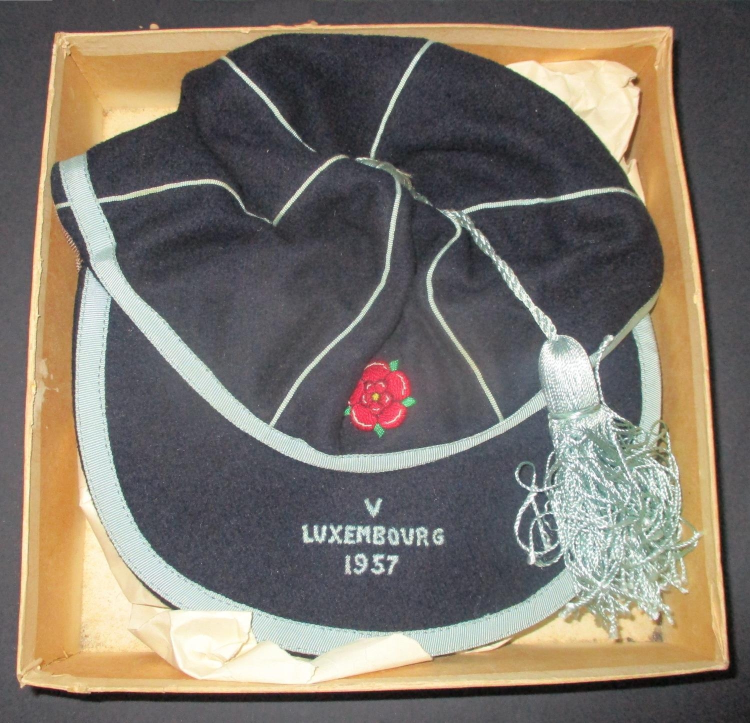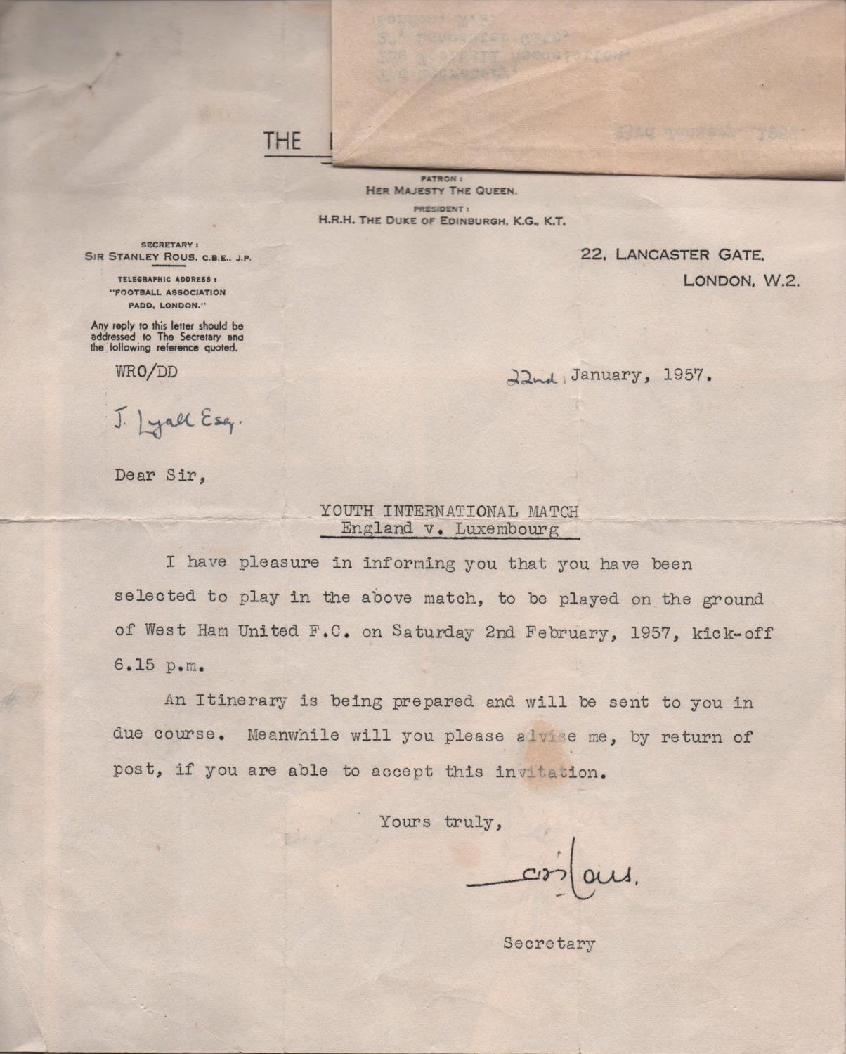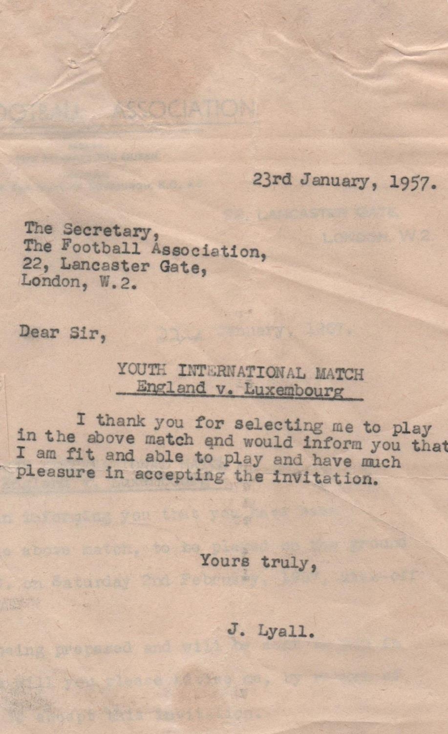 1957 John Lyalls England Youth Cap: Stunning cap in original box awarded to Lyall for playing v Luxembourg. This lot comes with a letter from the FA letting him know of his call up and the acceptance from him. Also included is a photo of Lyall aged 17 when he signed his professional contract which is signed Best Wishes John Lyall.