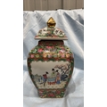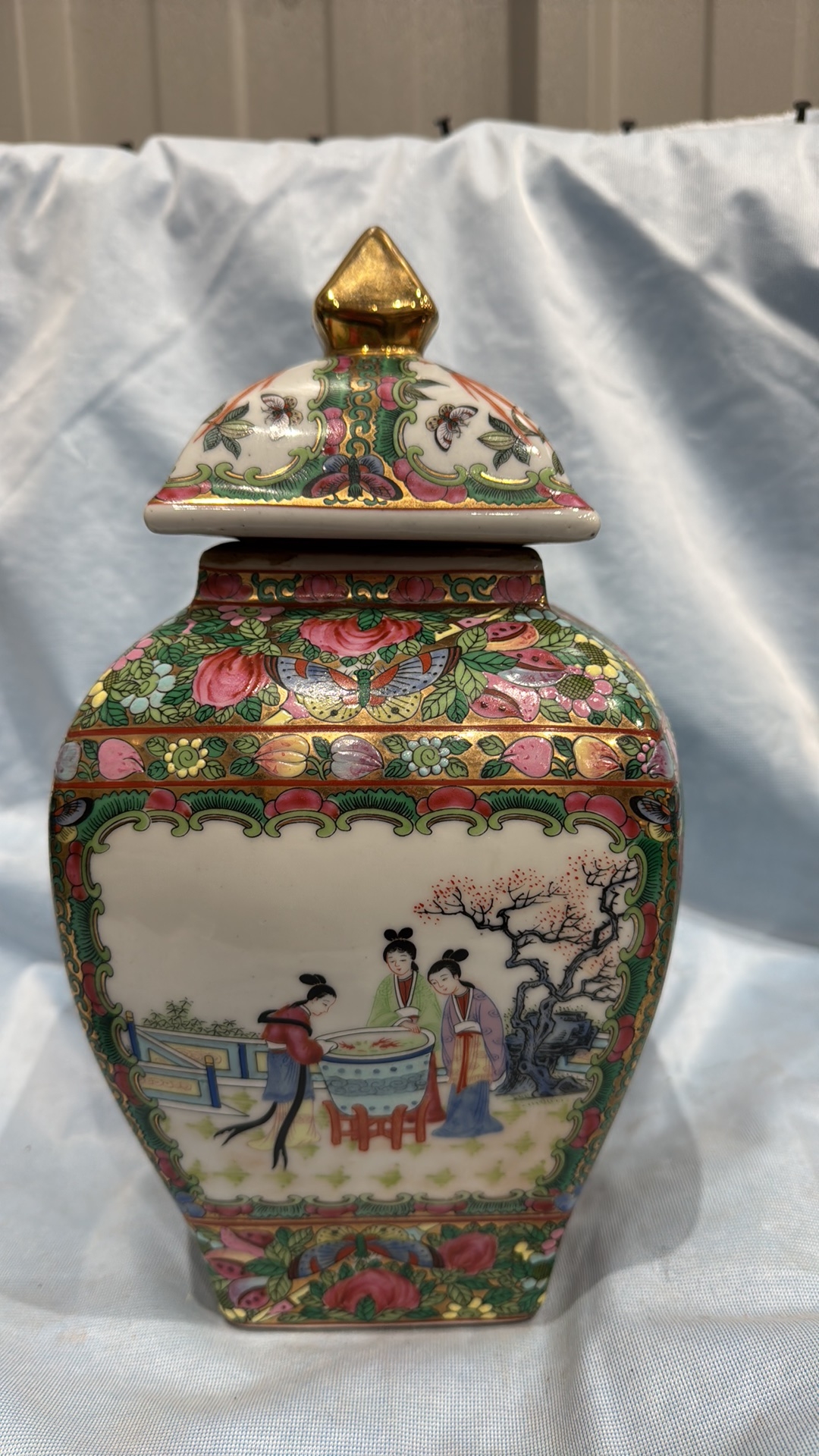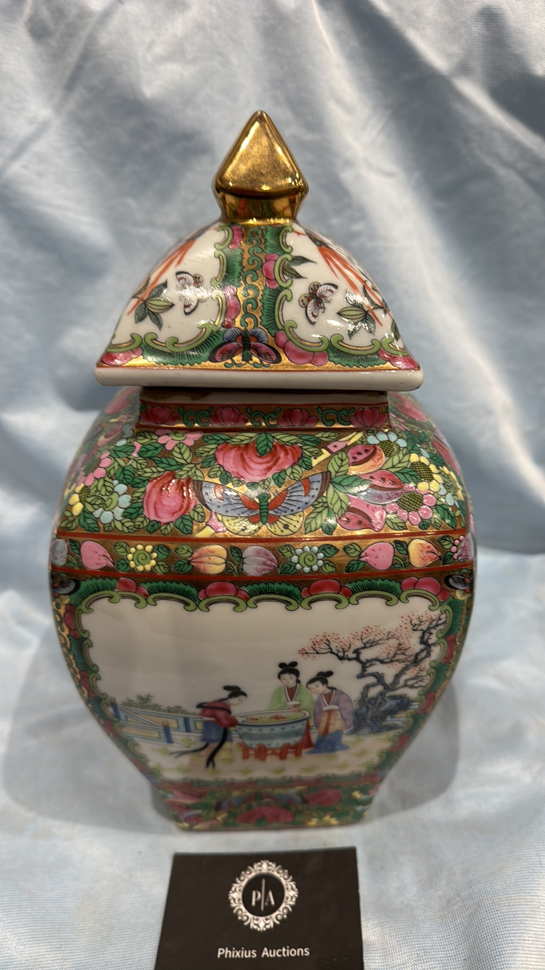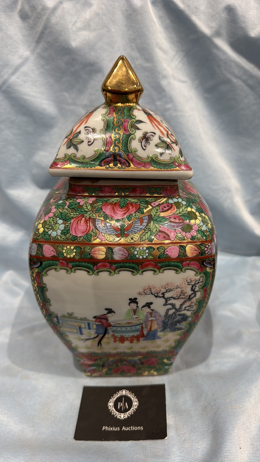 Square Chinese porcelain ginger jar and cover, famille rose palette with courtly figures, birds and peony panels, peach and butterfly reserves, gilt pyramid finial; apocryphal red seal mark to base.