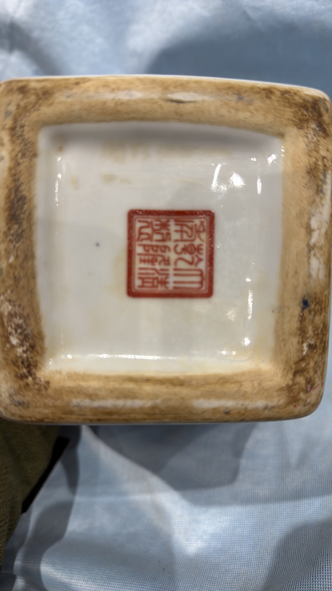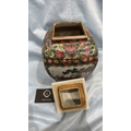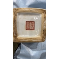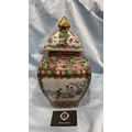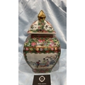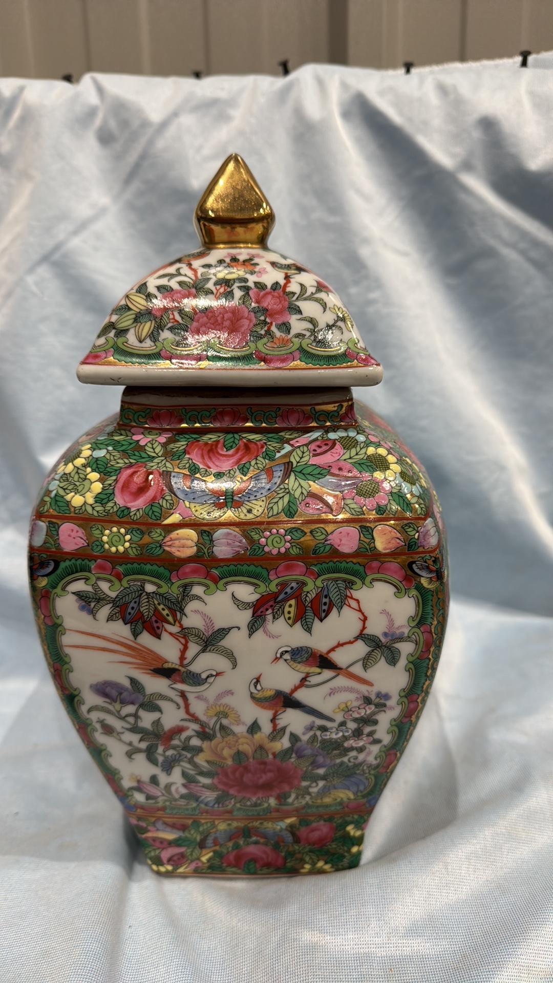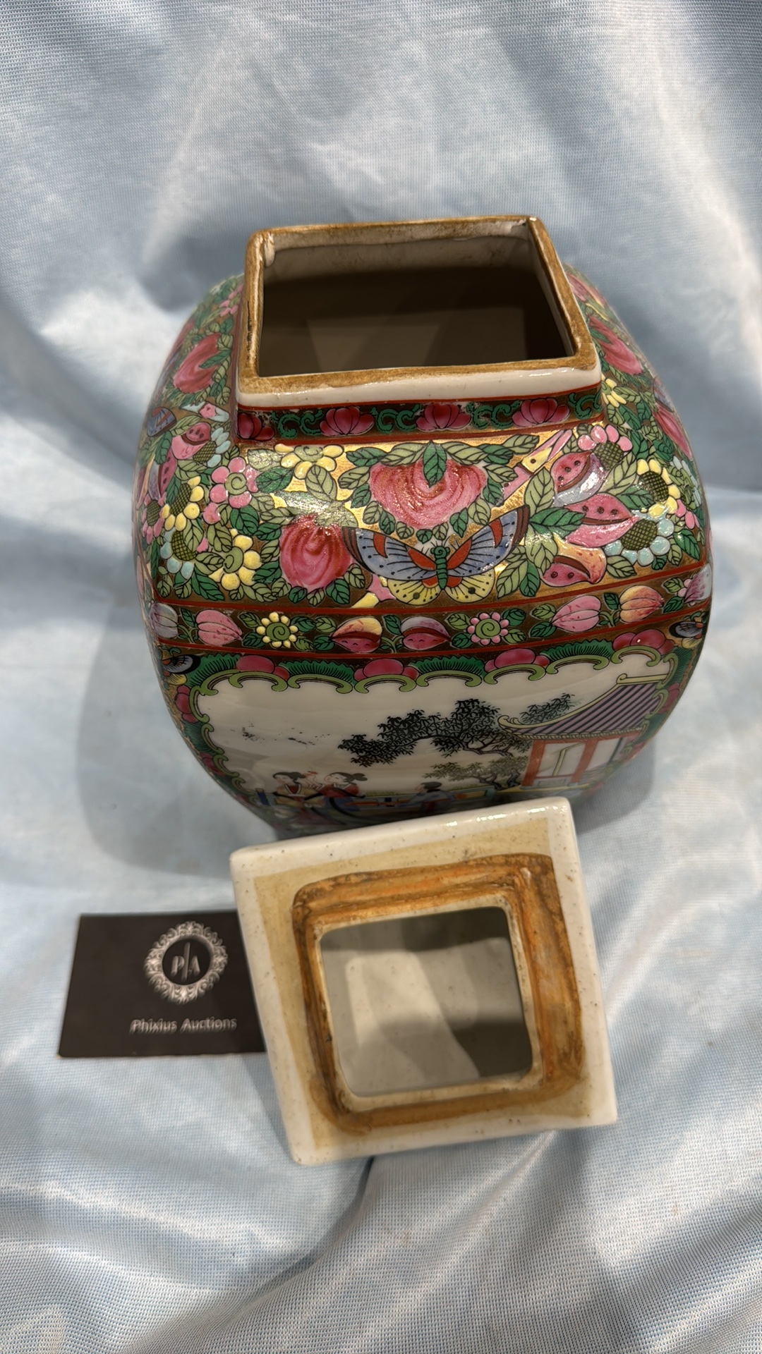 Square Chinese porcelain ginger jar and cover, famille rose palette with courtly figures, birds and peony panels, peach and butterfly reserves, gilt pyramid finial; apocryphal red seal mark to base.