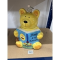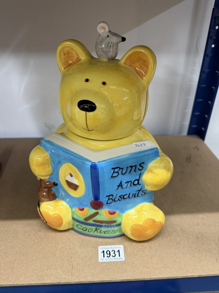 A vintage Rayware novelty cookie jar featuring a teddy bear & a mouse reading a Buns & Biscuits book