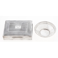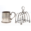 A George V five hoop silver toast rack, 10cm h, by The Goldsmiths and Silversmiths Co, London 1912 and a silver christening mug with beaded rims, by another, Birmingham 1996, 8ozs 8dwts (2)