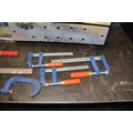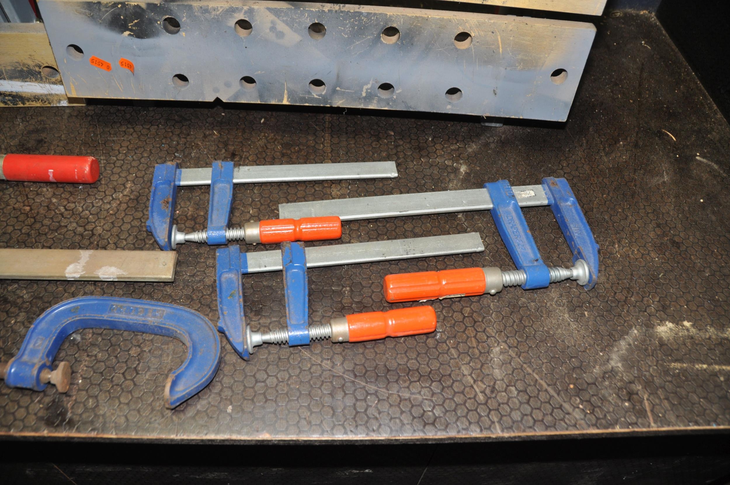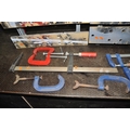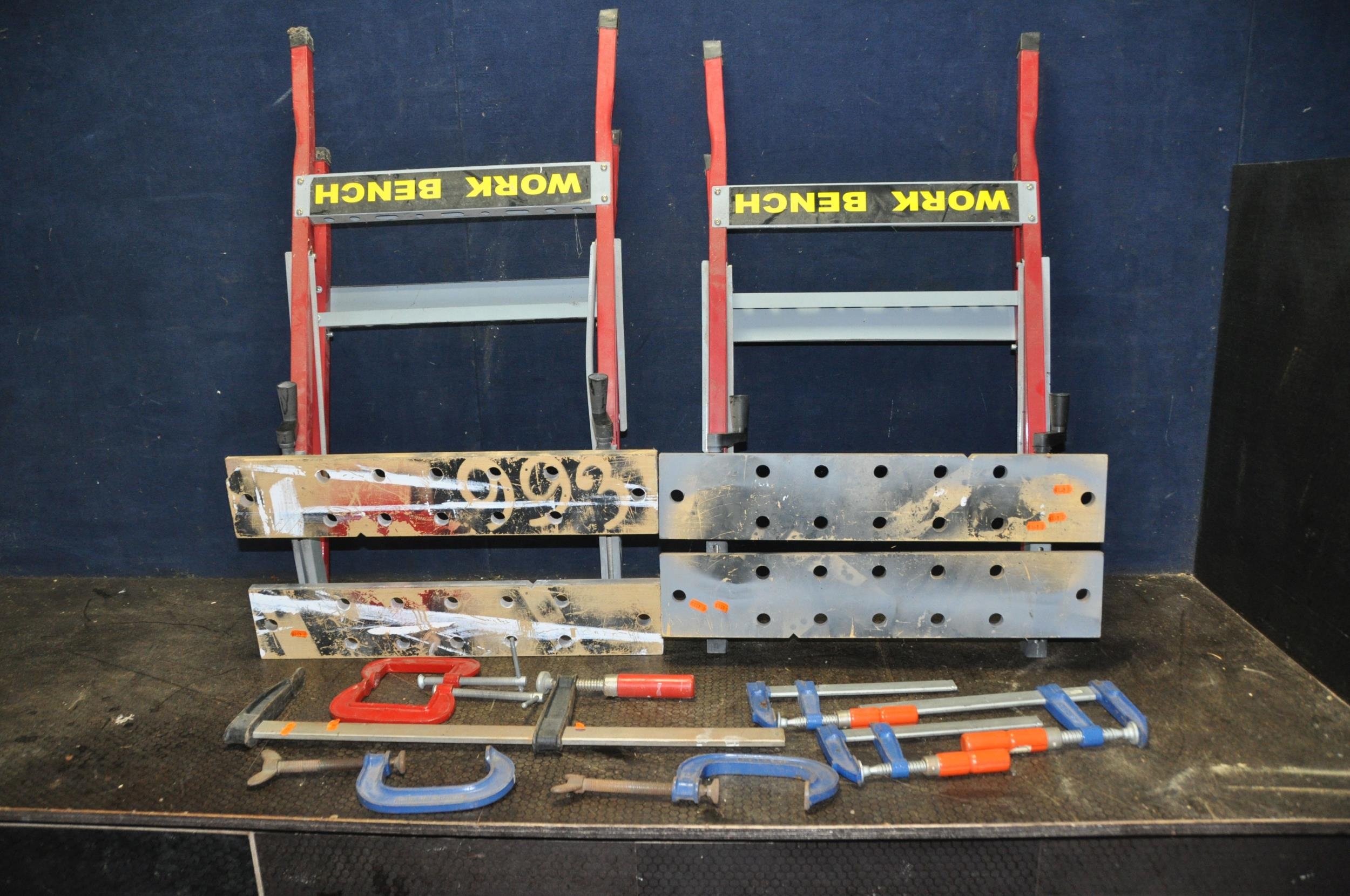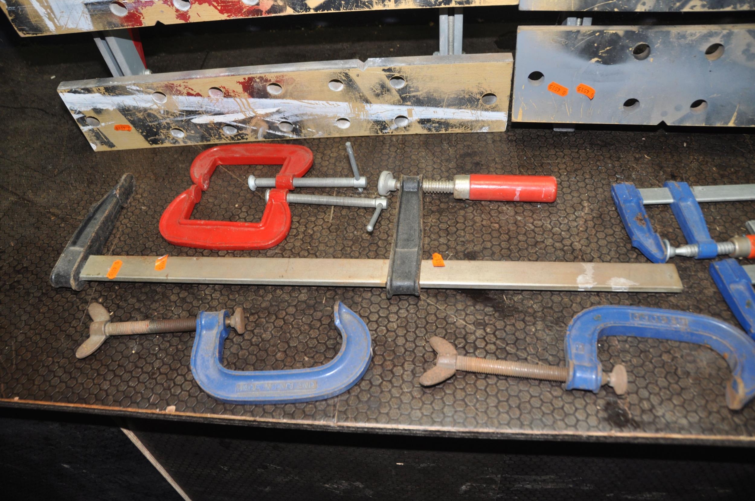 TWO RECORD 4 G CLAMPS, THREE DRAPER CLAMPS, a large clamp, two other g clamps and two work benches (10)