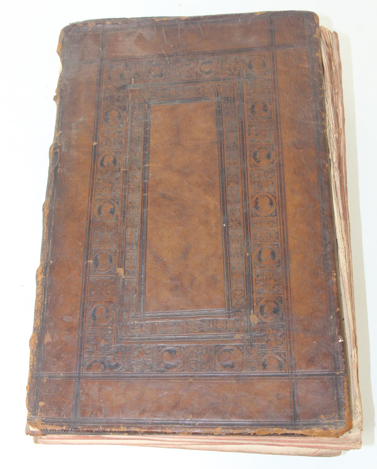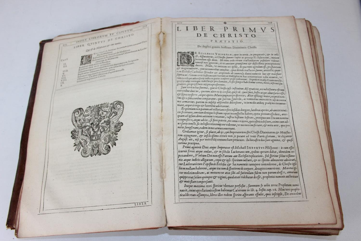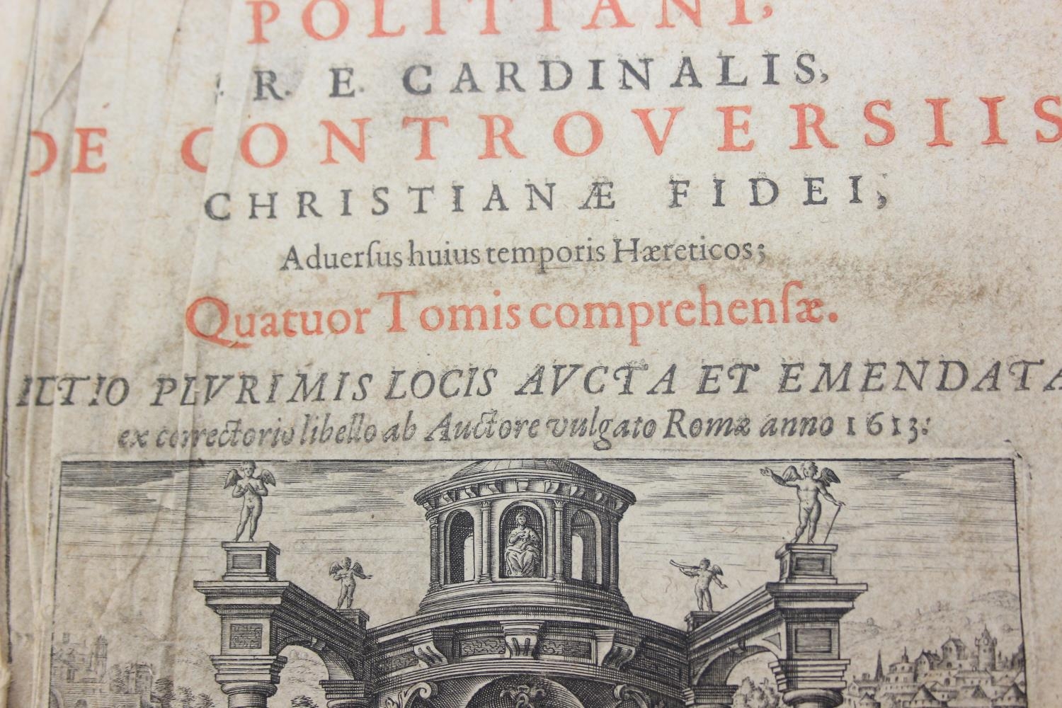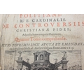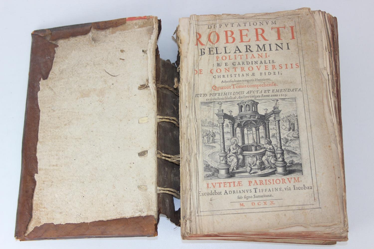 1620 edition of 'Dispvtationvm Roberti Bellarmini Politiani, S.R.E. Cardinalis, de Controversiis Christianae Fidei' [Disputation of Robert Bellarmine, Society of Jesus Cardinal, on the Controversies of the Christian Faith]; original full leather binding including front tooling, but with damages, hand cut pages, appears complete