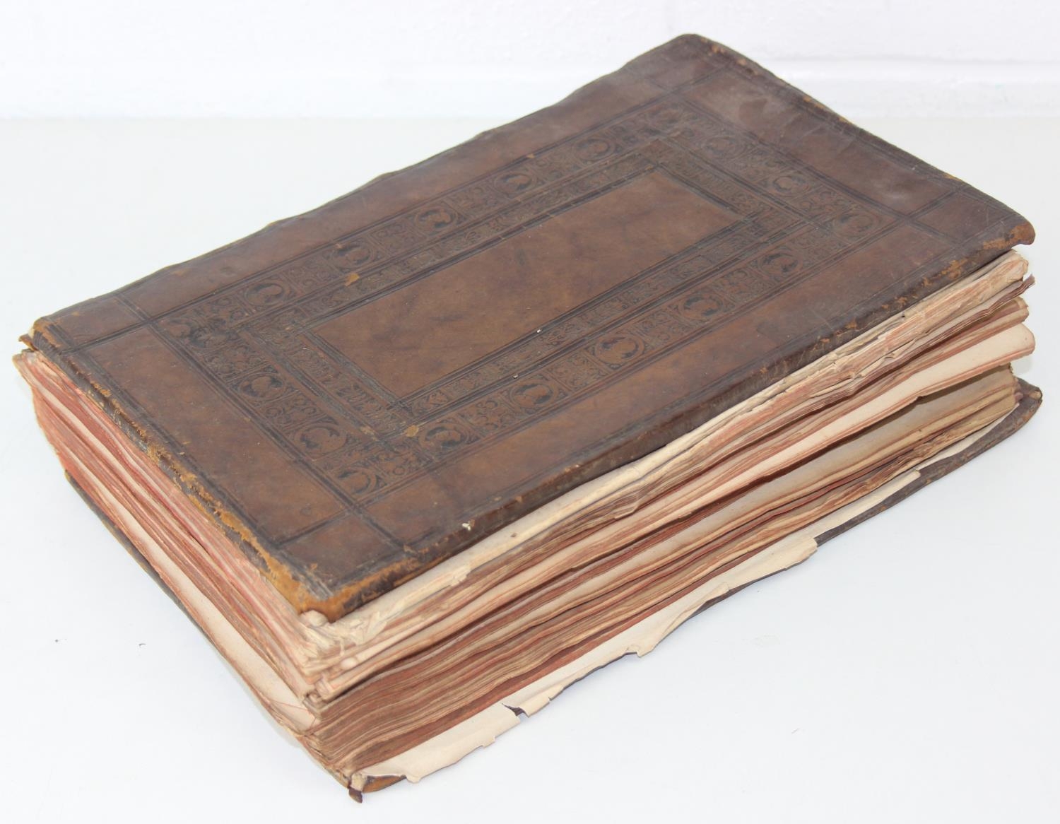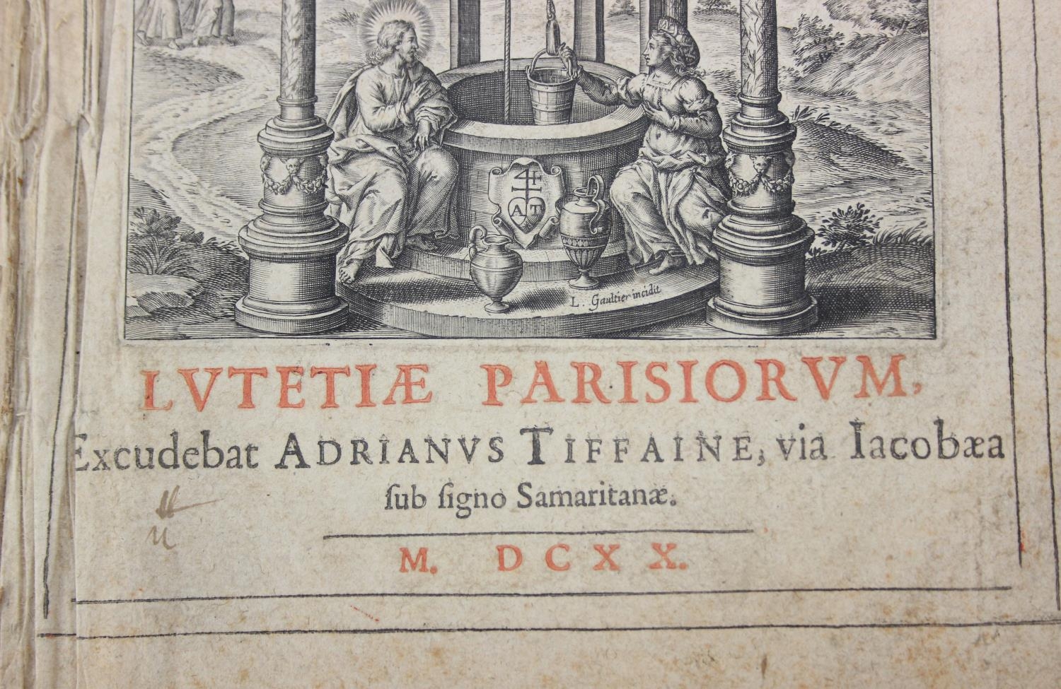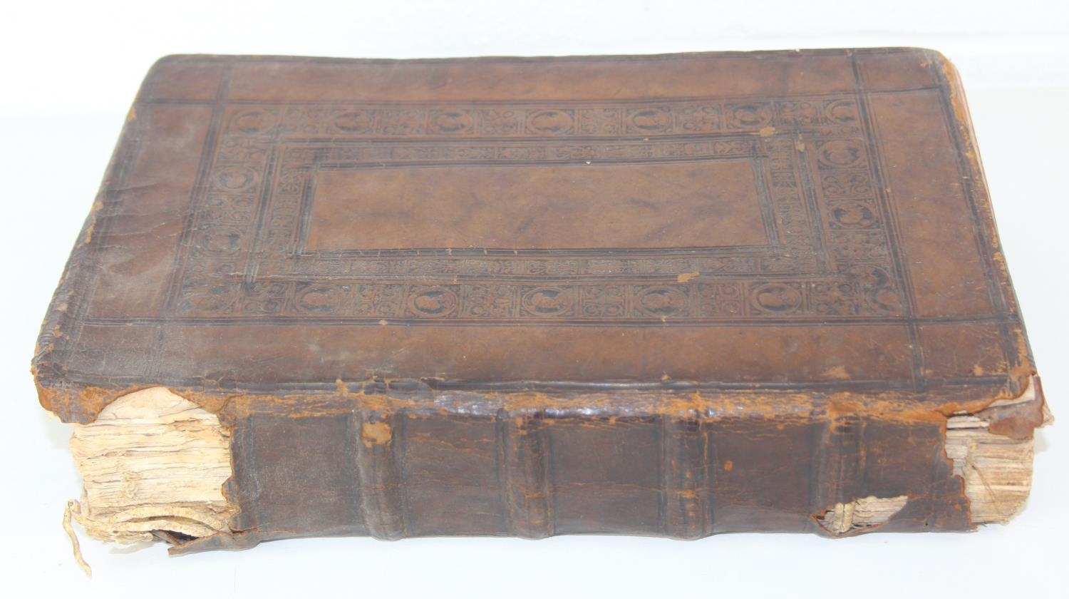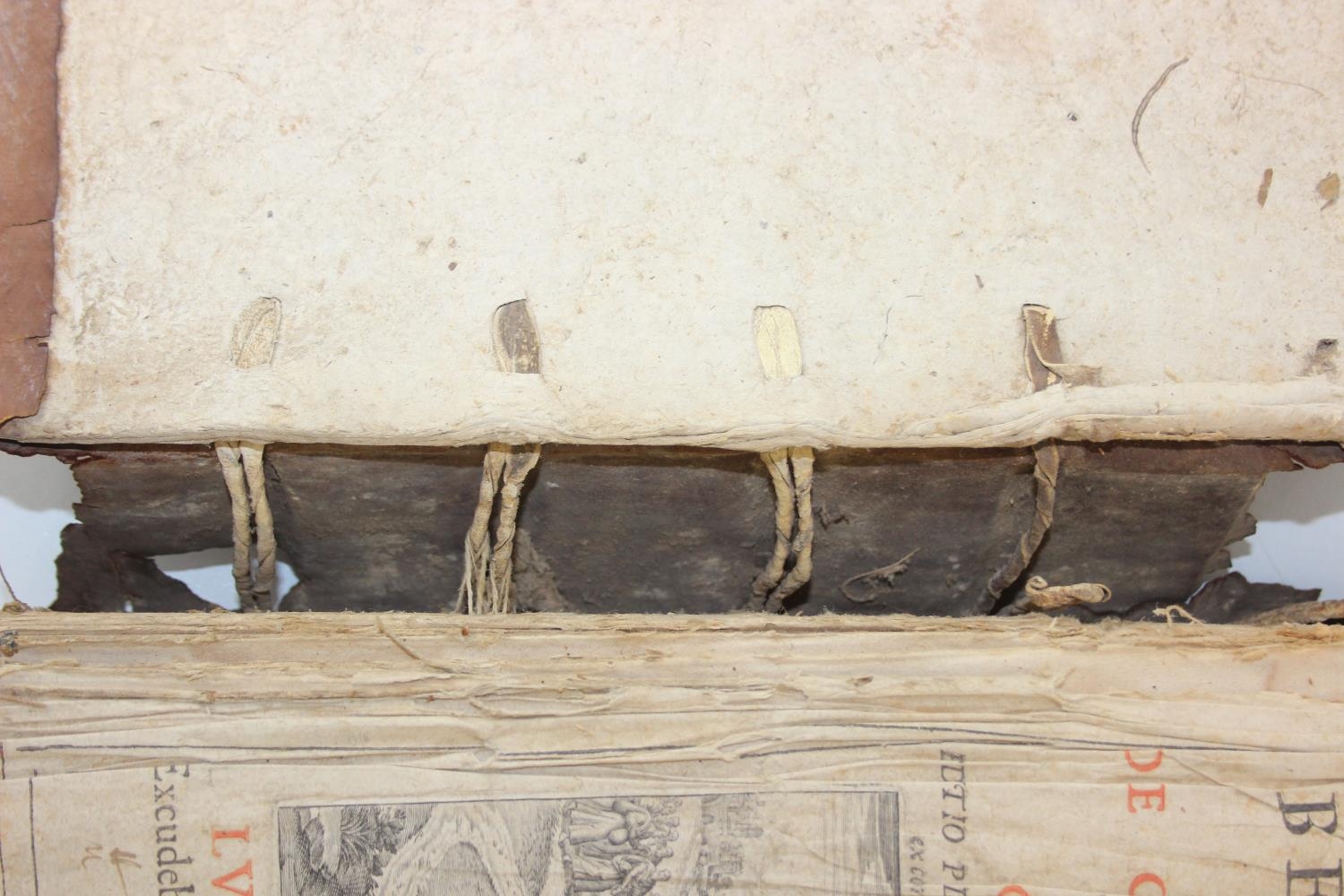 1620 edition of 'Dispvtationvm Roberti Bellarmini Politiani, S.R.E. Cardinalis, de Controversiis Christianae Fidei' [Disputation of Robert Bellarmine, Society of Jesus Cardinal, on the Controversies of the Christian Faith]; original full leather binding including front tooling, but with damages, hand cut pages, appears complete