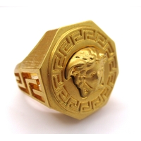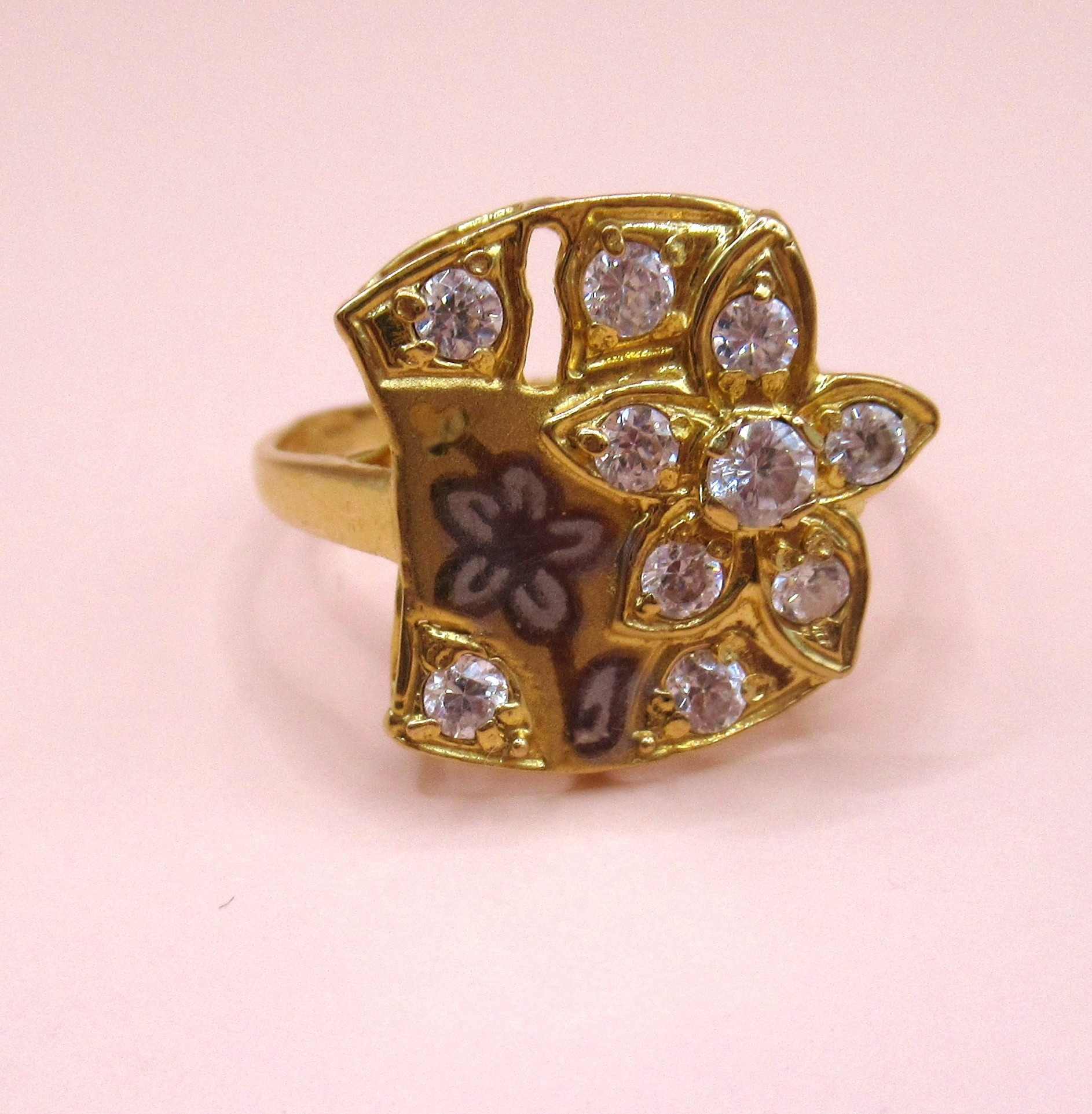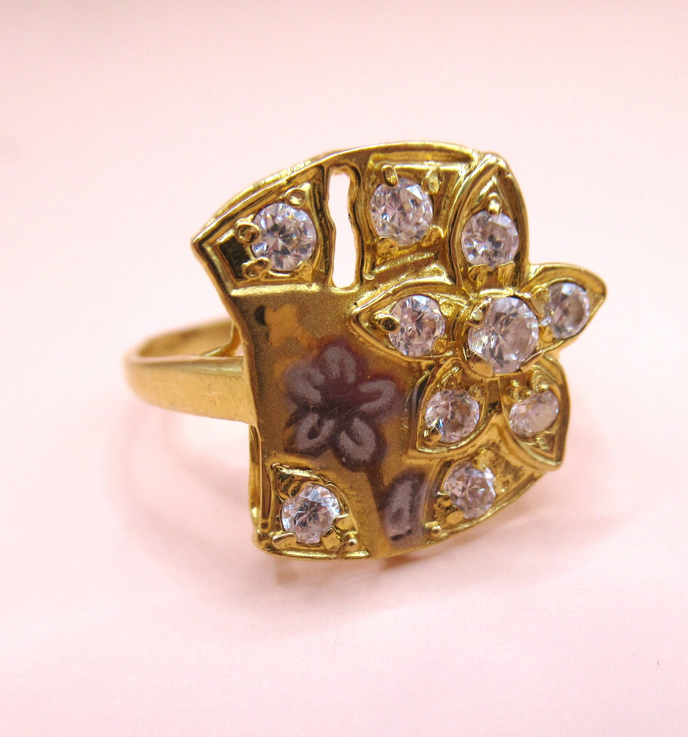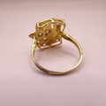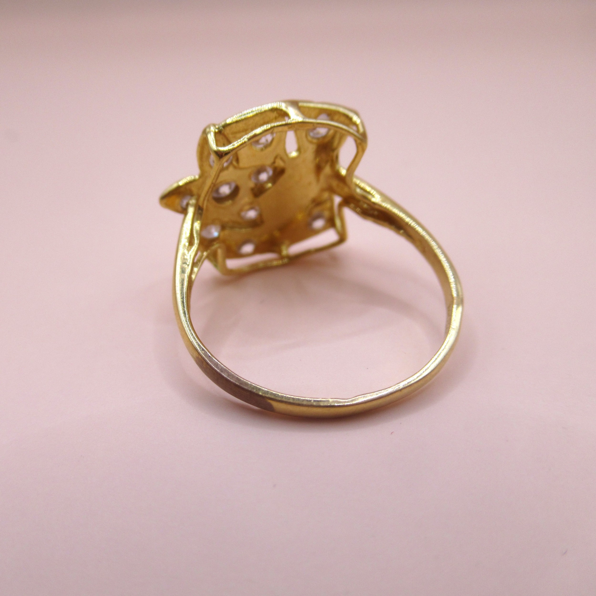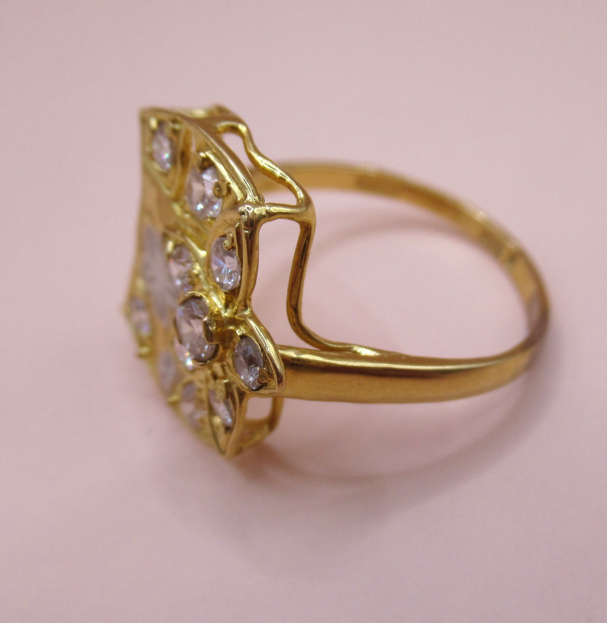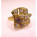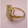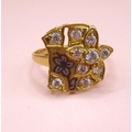 Yellow gold dress ring having unusual floral design set with glass, marked 875, size 'O', 3.3g