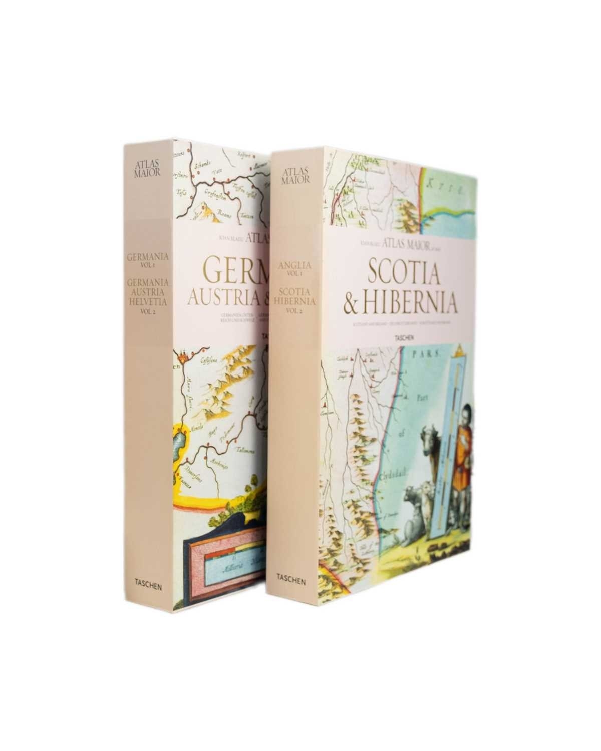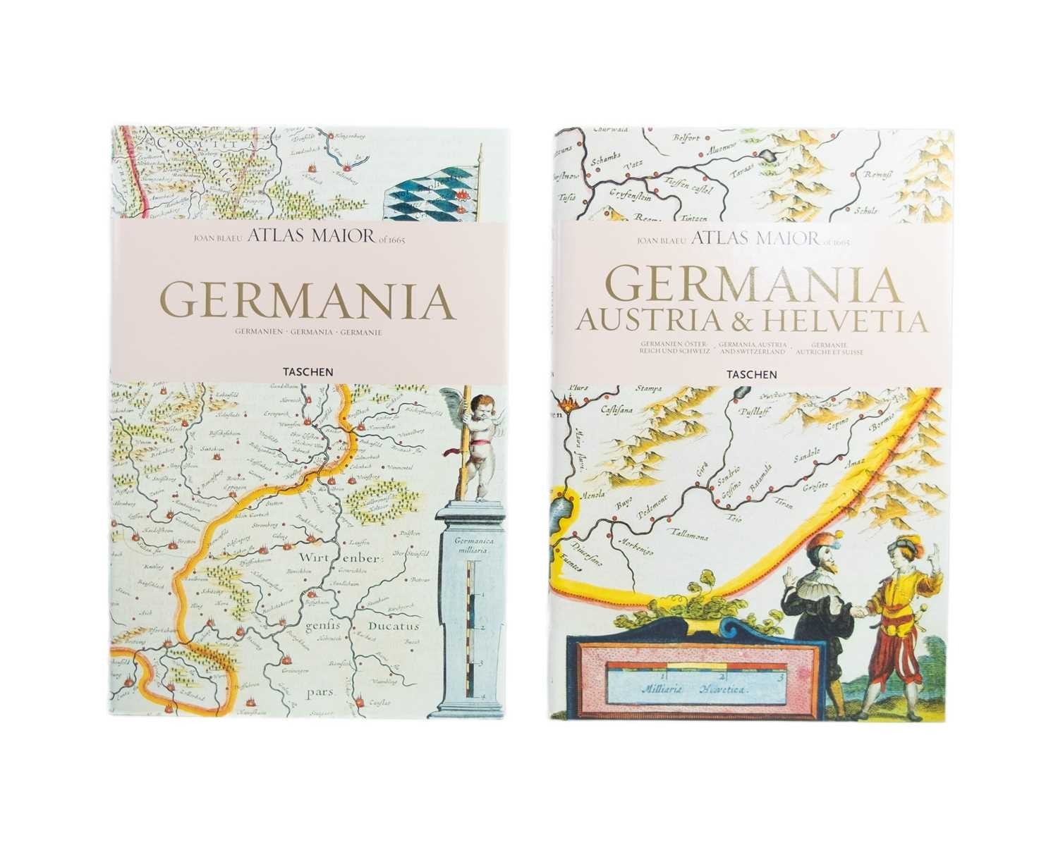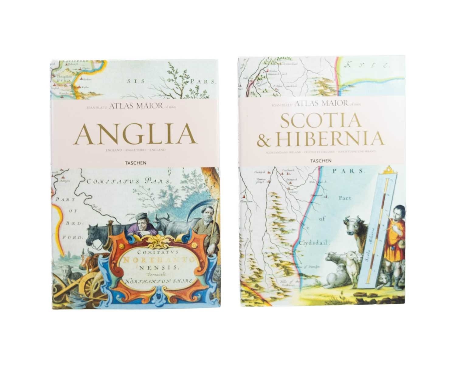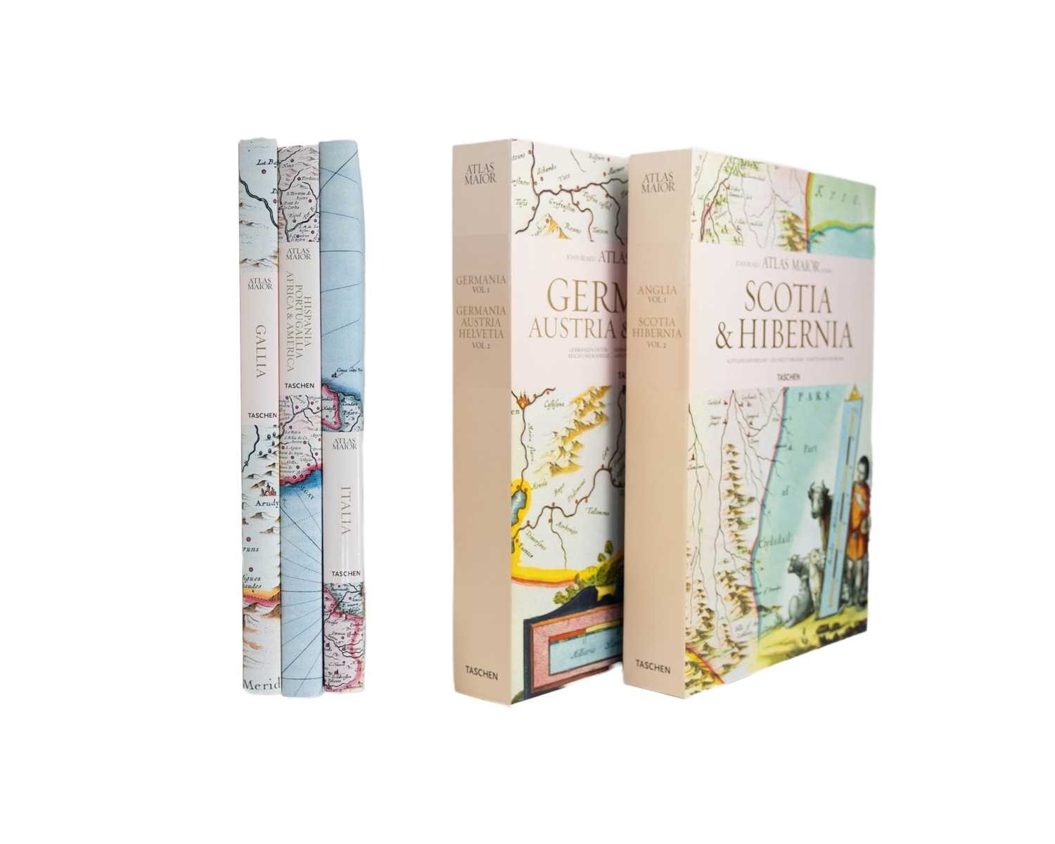 (Atlas) Joan Blaeu Atlas Maior of 1665 Seven volumes comprising 'Italia', 'Hispania Portugallia, Africa & America', 'Gallia', 'Scotia & Hibernia', ' Anglia', 'Germania, Austria & Helvetia' and 'Germania', with unclipped djs, original boards and thoroughly illustrated, Taschen, Germany 2006, with French, English and German translations, all vg. (7)