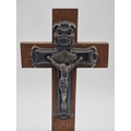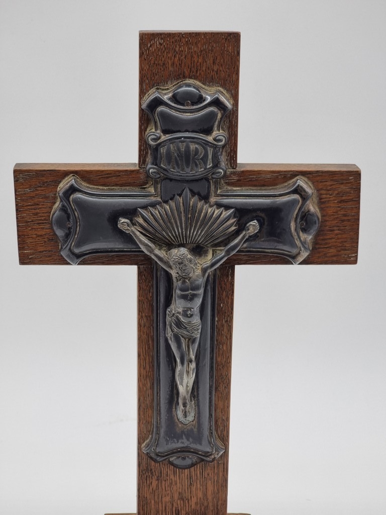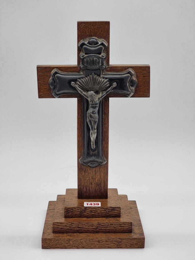 An oak and electroplate mounted Corpus Christi, 40cm high.
