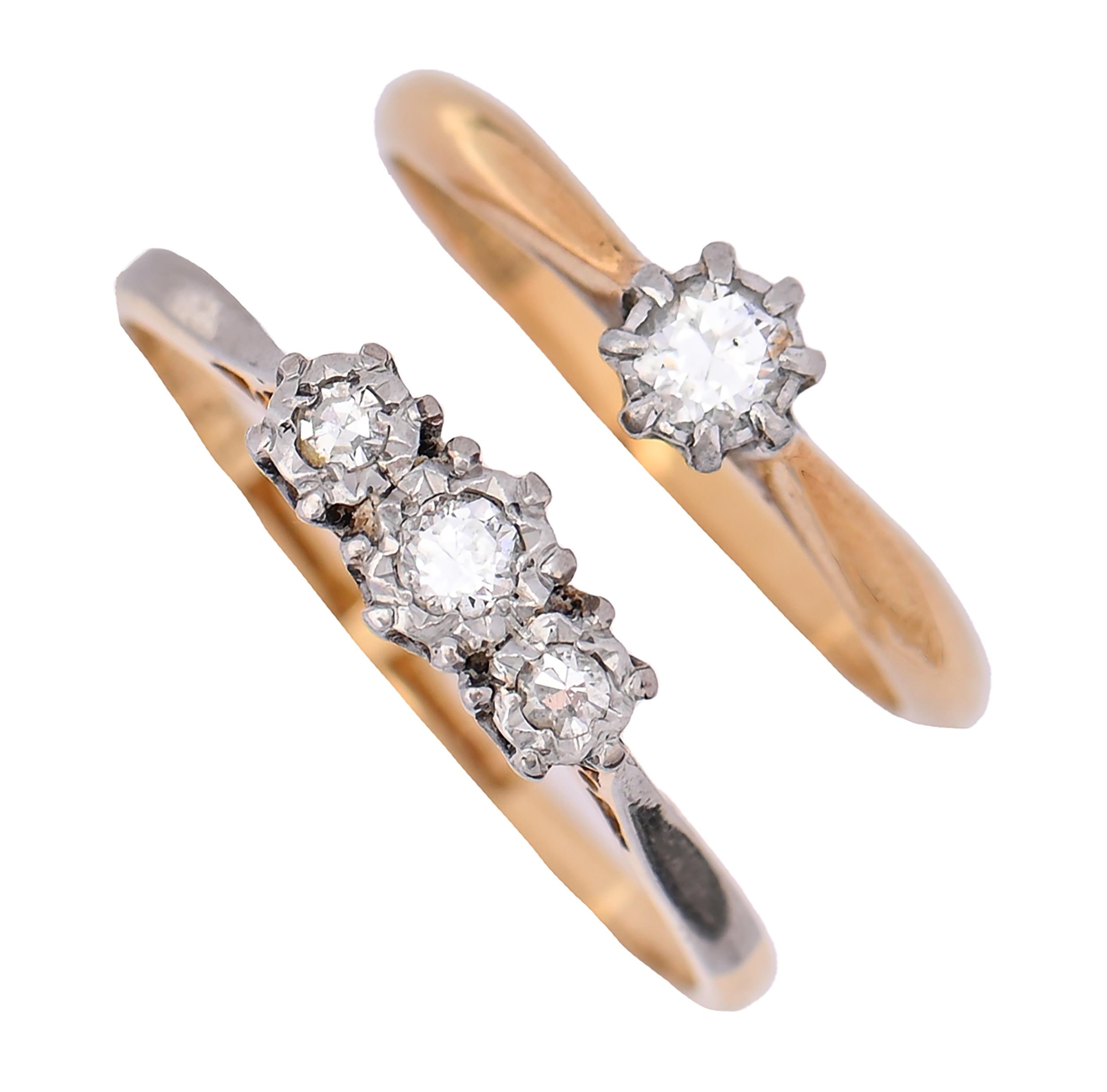 A diamond solitaire ring and a diamond three stone ring, each with gold hoop marked 18ct PLAT, 3.4g, size H and N