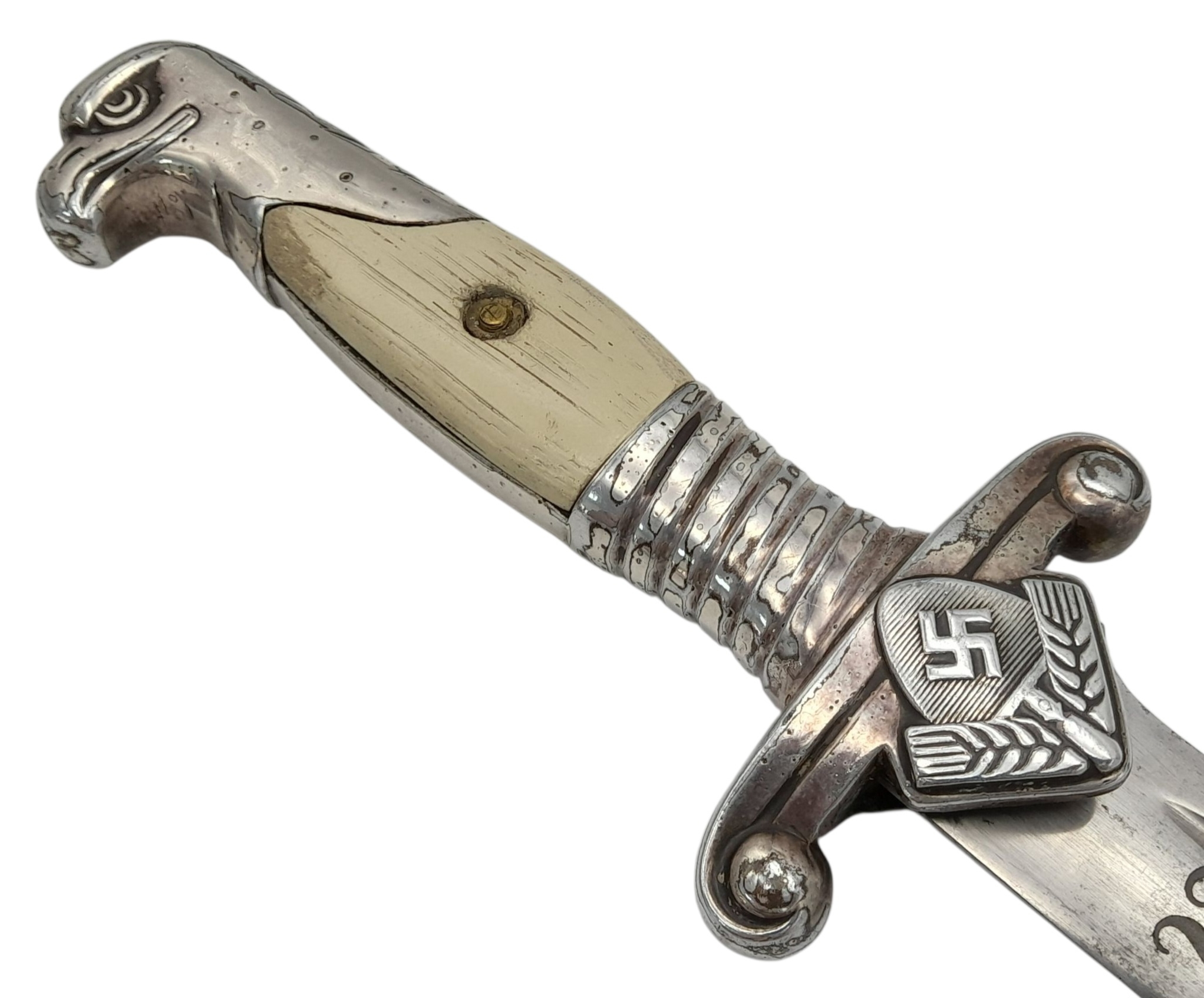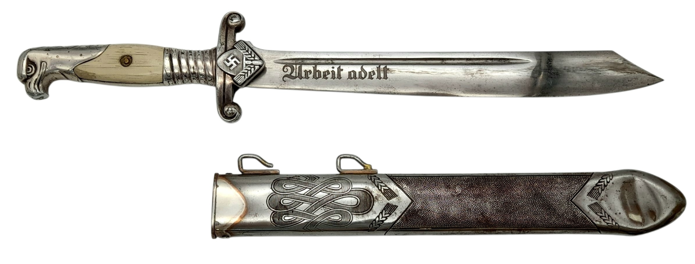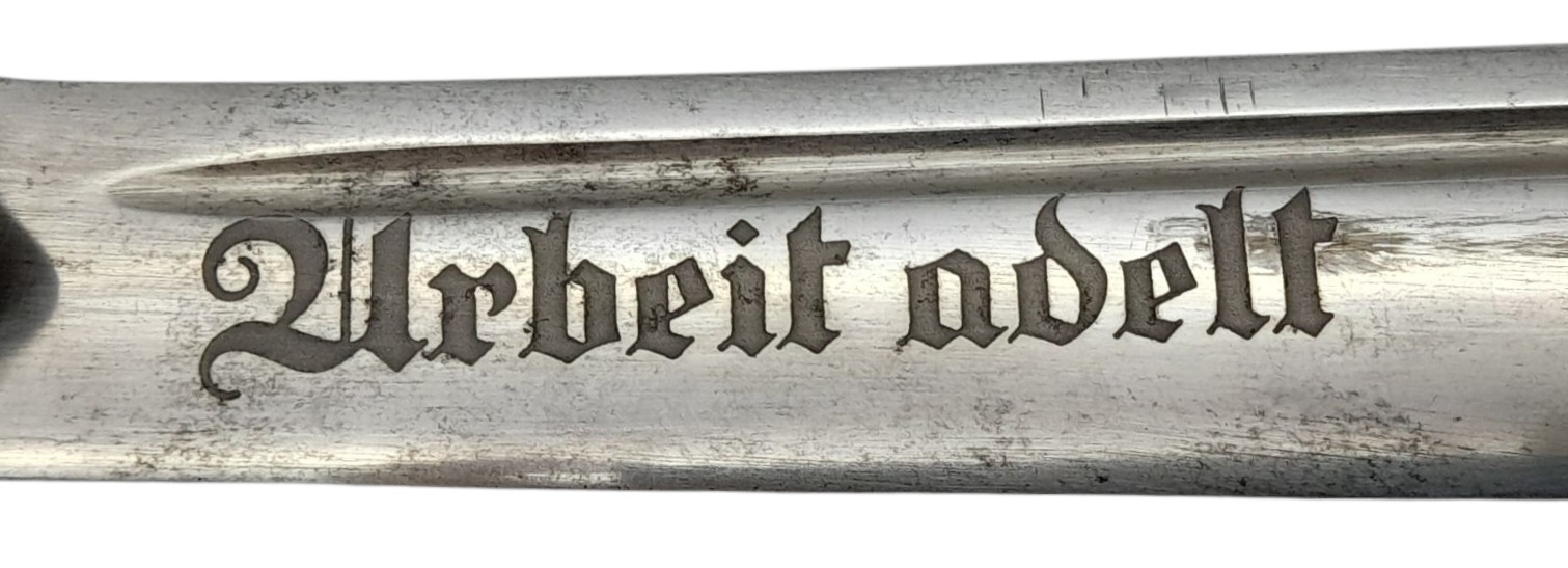 Original Third Reich 1937 Model Arbeits Dienst Leader's Dagger. Maker Eickhorn. All 100% original apart from the replacement Wooden grips. The scabbard is quite worn with a couple of dents. UK Mainland Shipping Only.