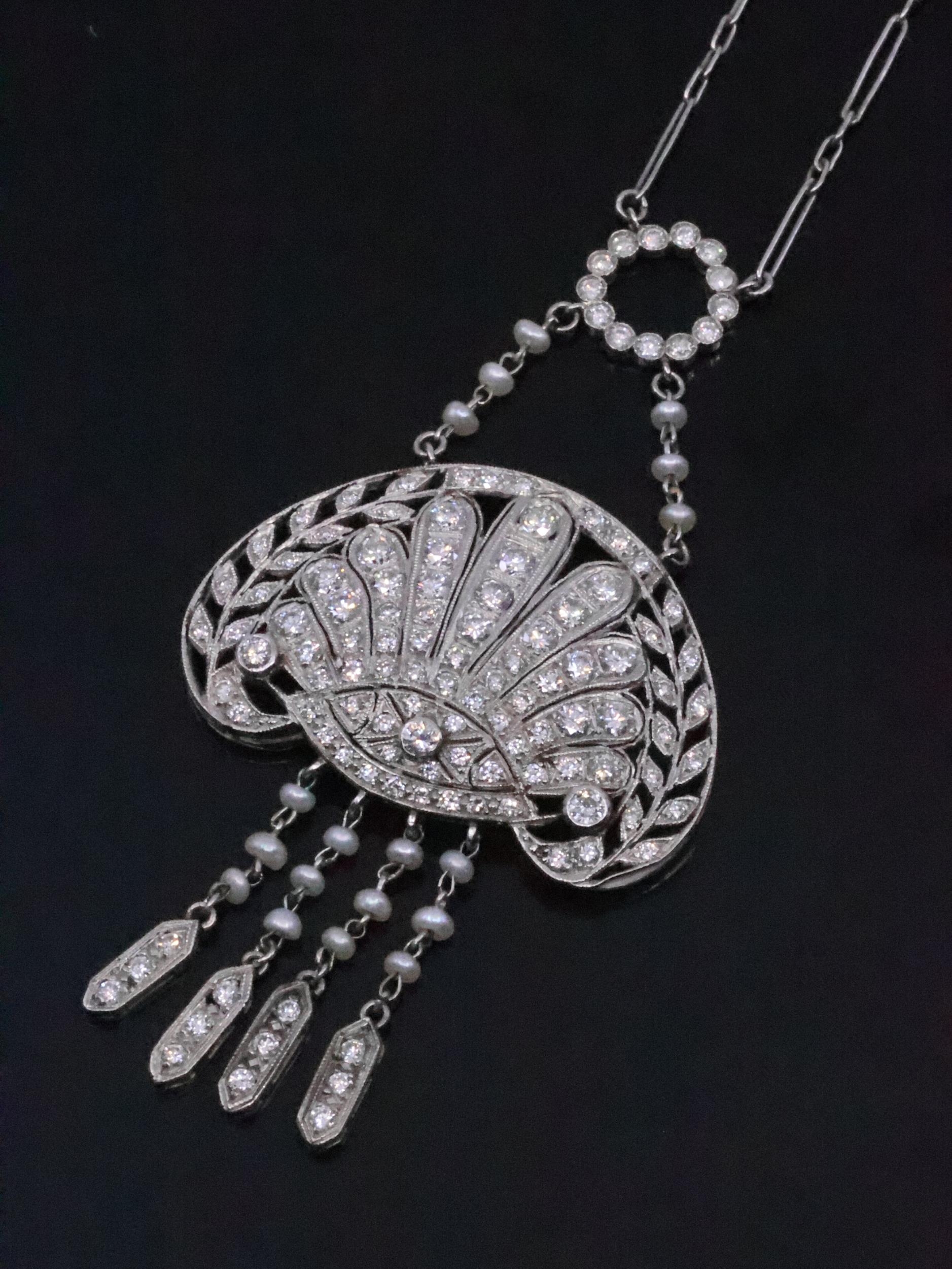 A fine diamond & pearl set necklace with a copy of an insurance valuation which states it is set in platinum and valued at £5,400 (sterling) dated Dec 2008