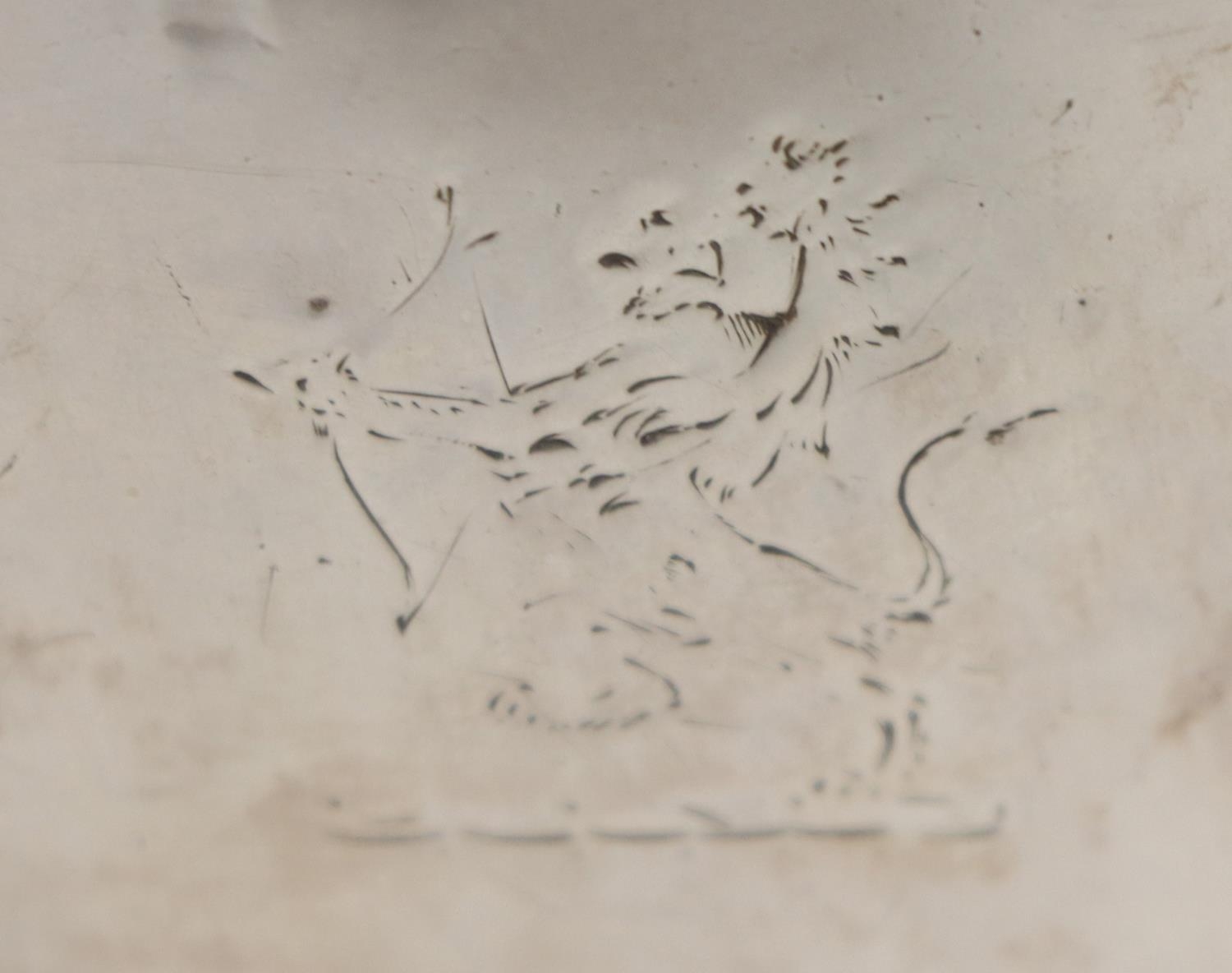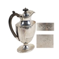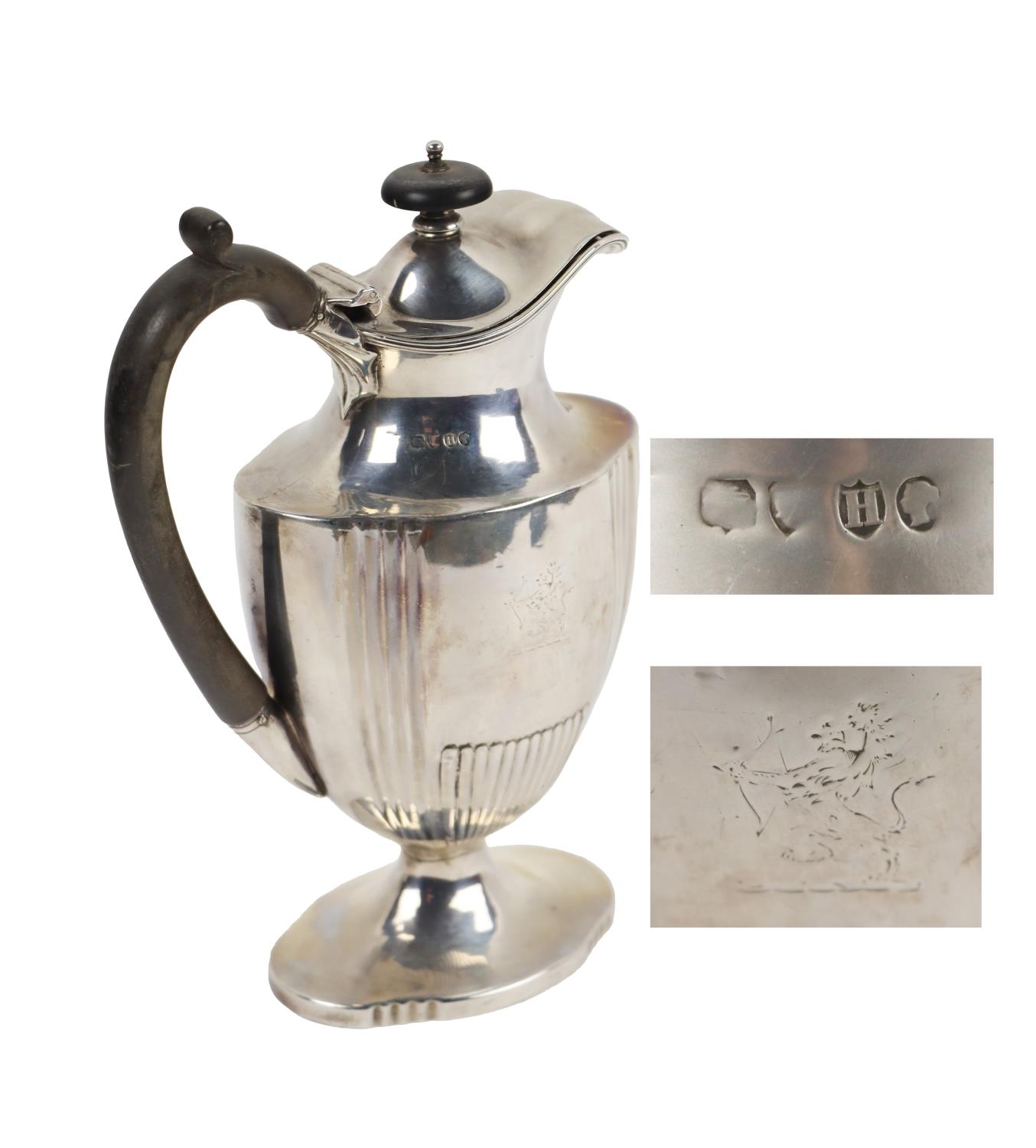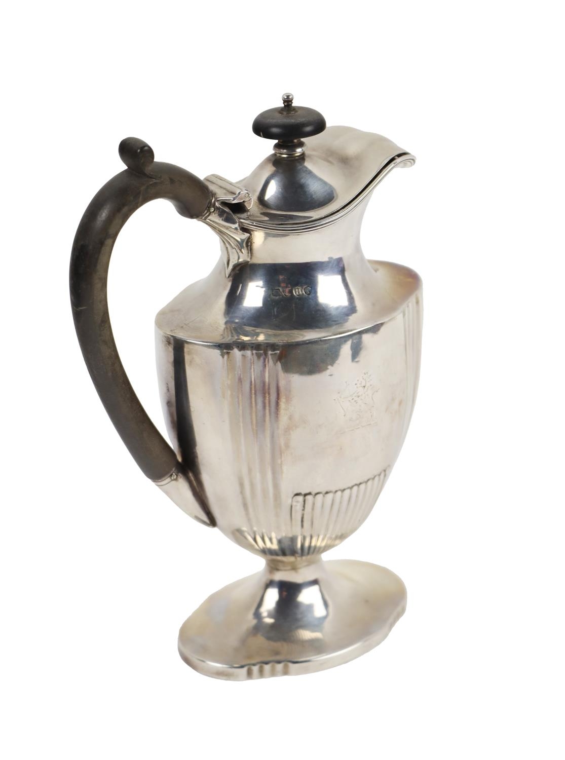 An attractive Victorian Coffee Pot, of ewer design with ebonised finial on hinged lid, with wooden handle, engraved with crest, hallmarked London, c. 1883, B.G.?, approx. 21cms (8 1/2"), 12 ounces. (1)