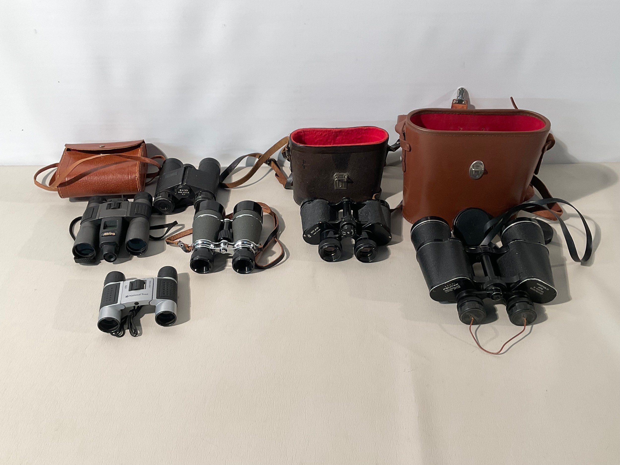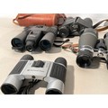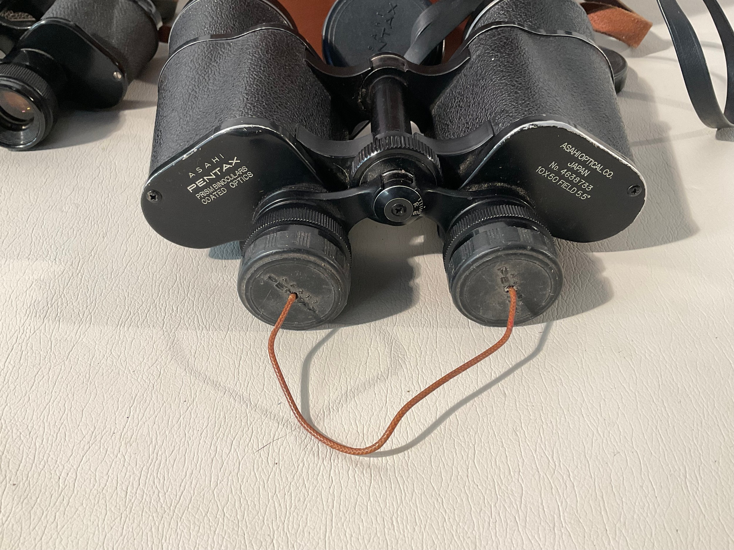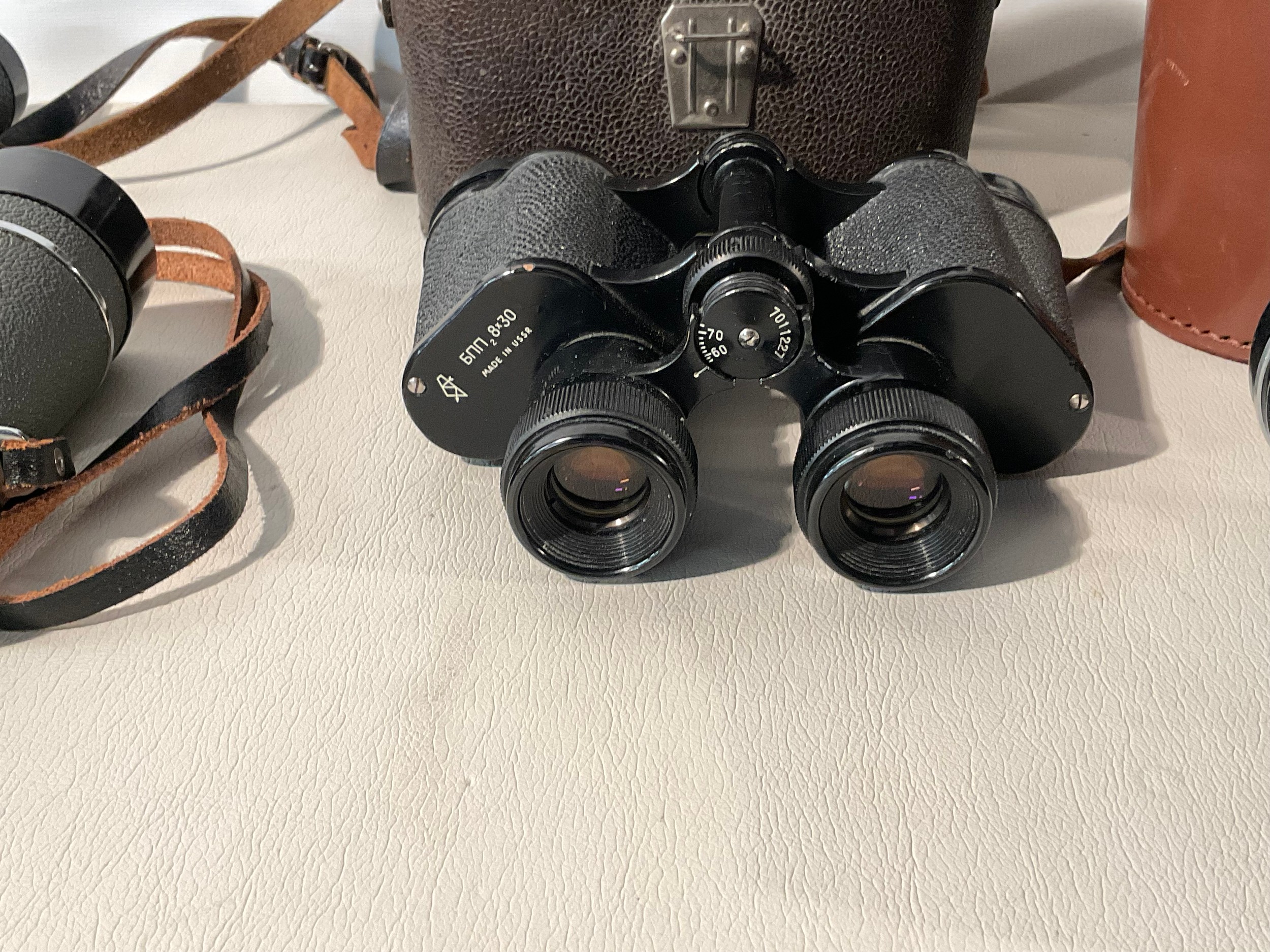 BOX TO INCLUDE VINTAGE BINOCULARS TO INCLUDE RUSSINA 8 X 30, PENTAX JAPANES 10 X 50