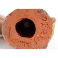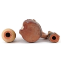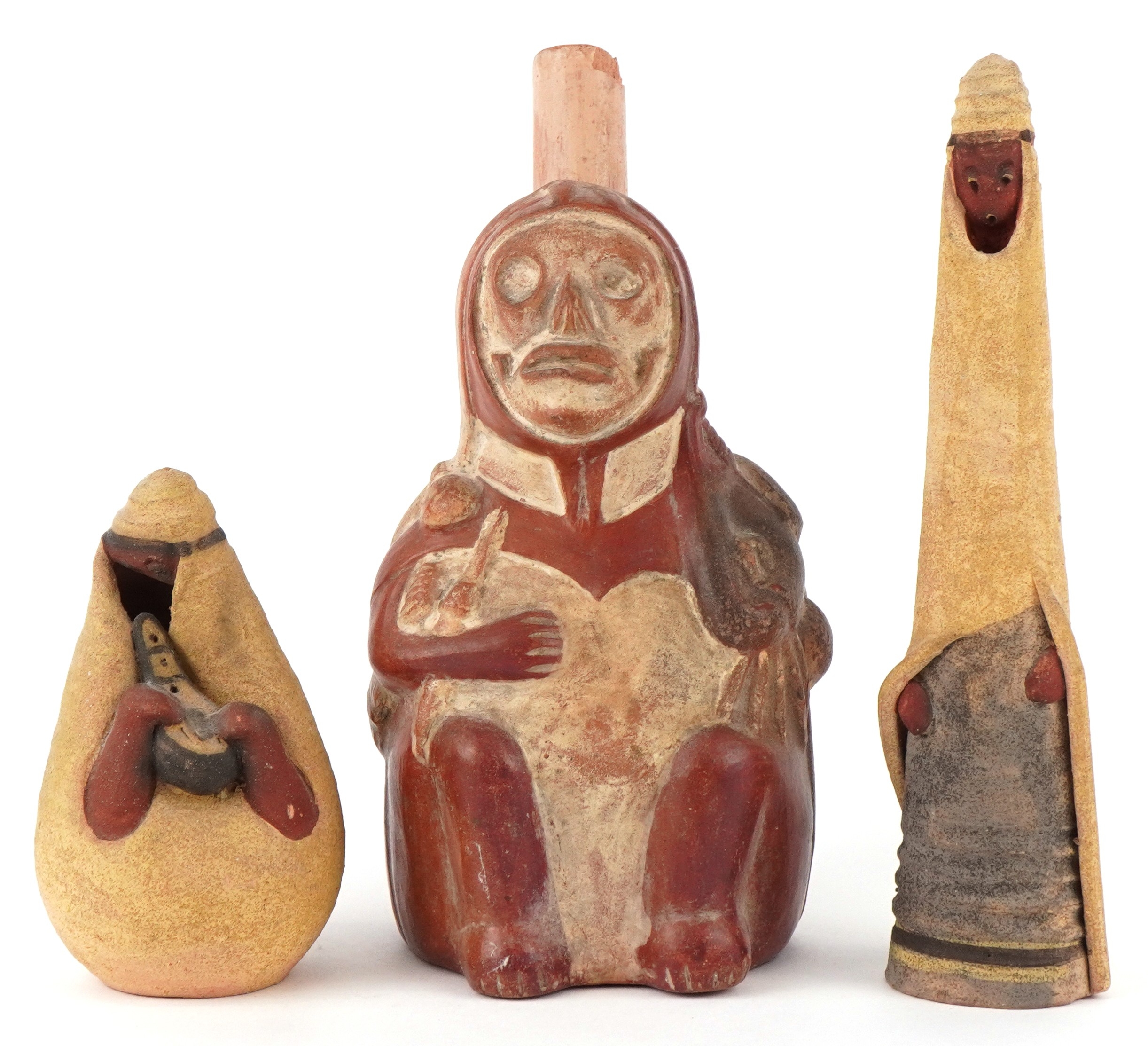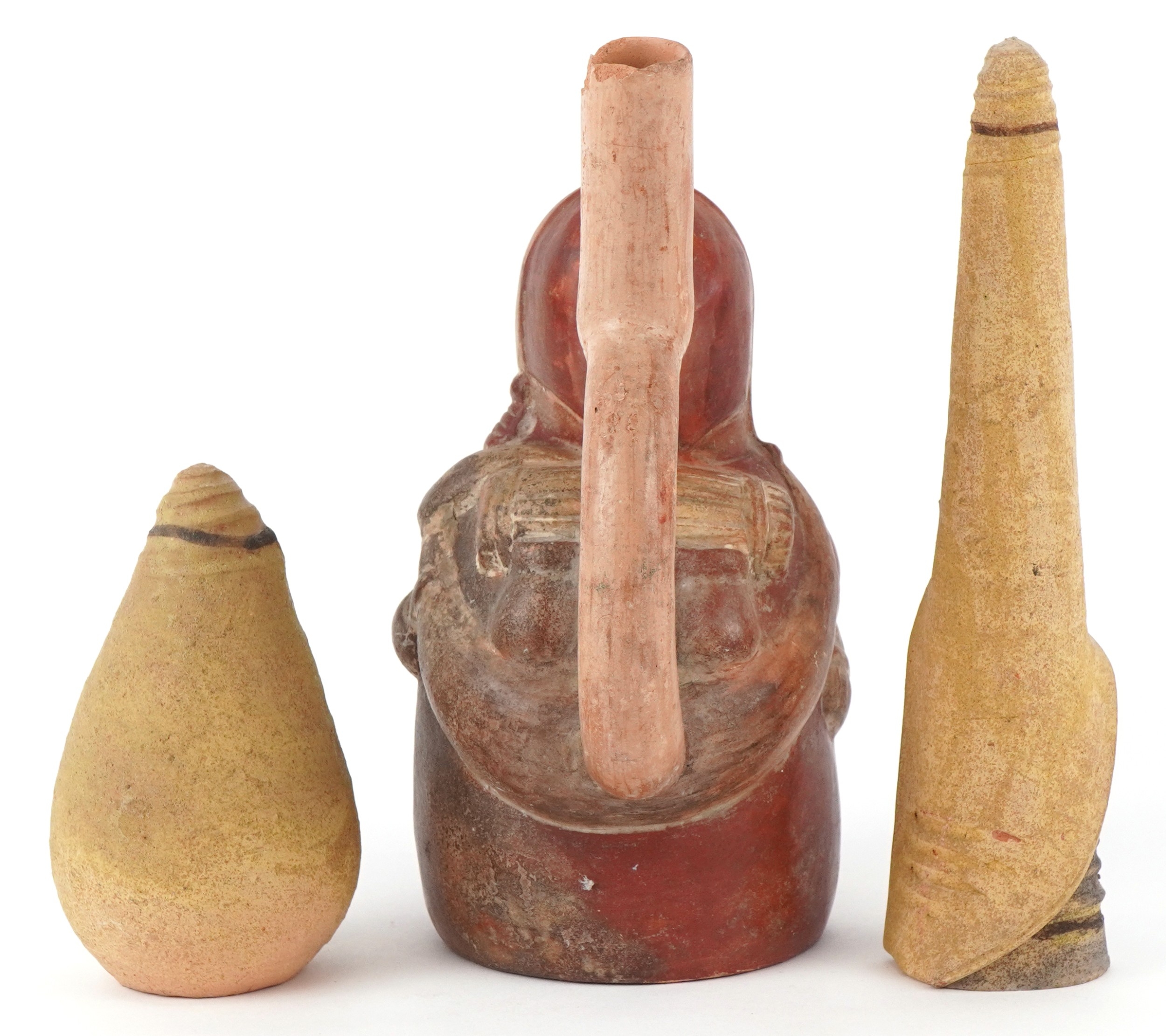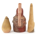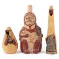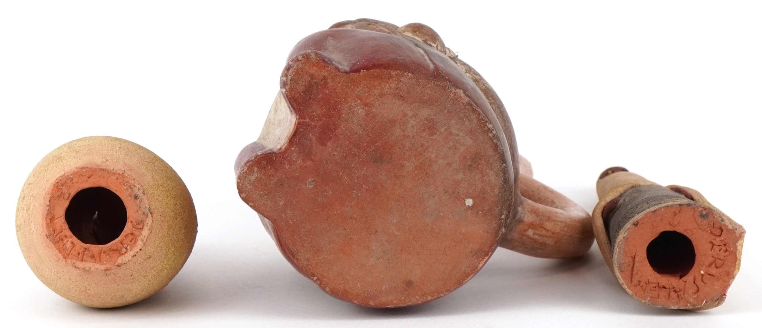 Two Middle Eastern pottery figures inscribed Jerusalem to the bases together with a stirrup spout vessel, the largest 23cm high.