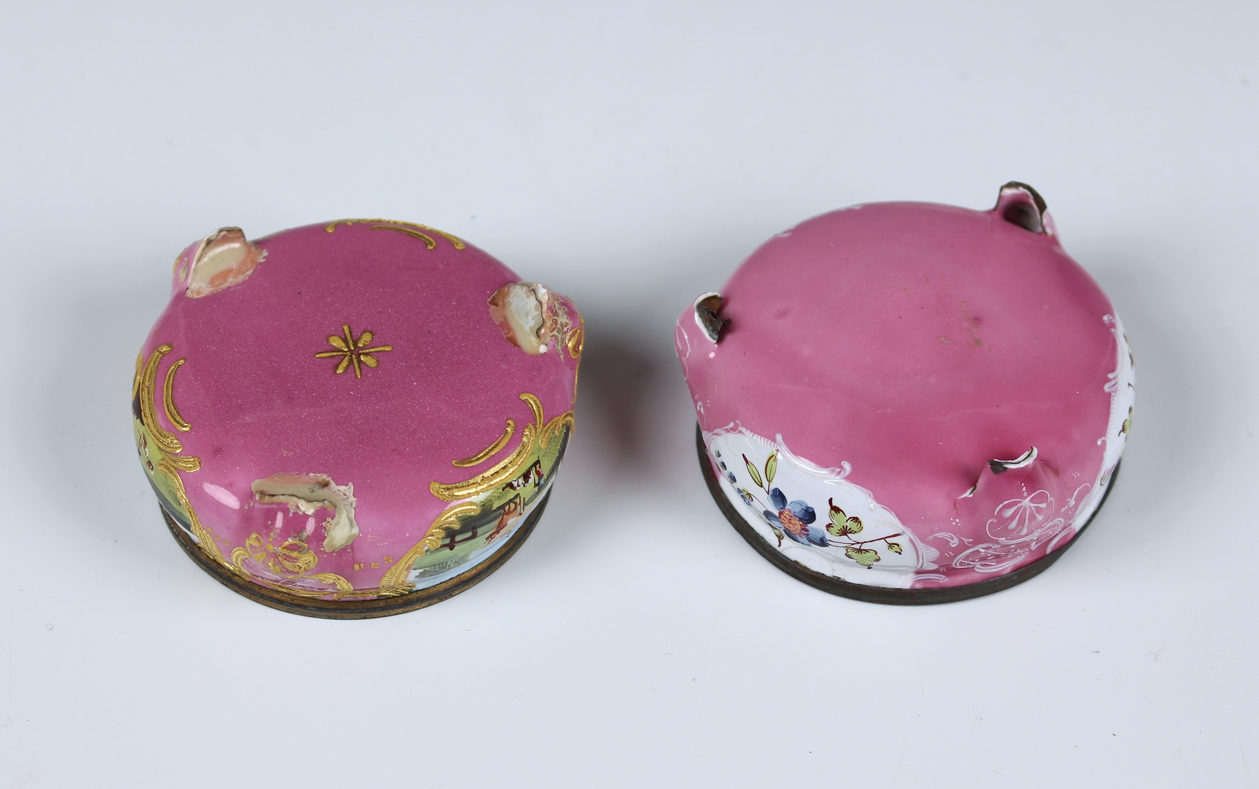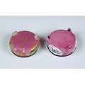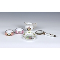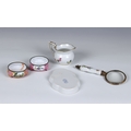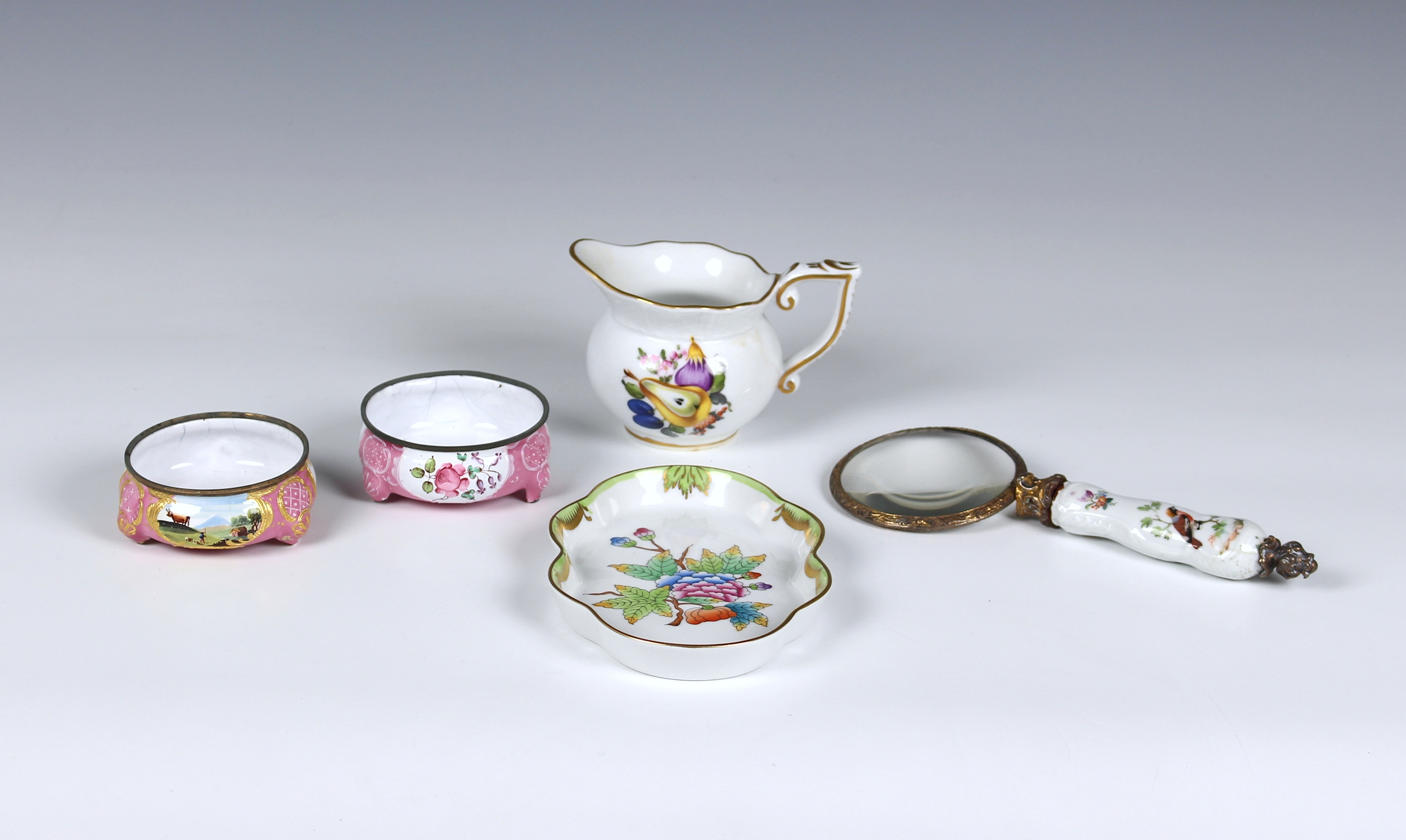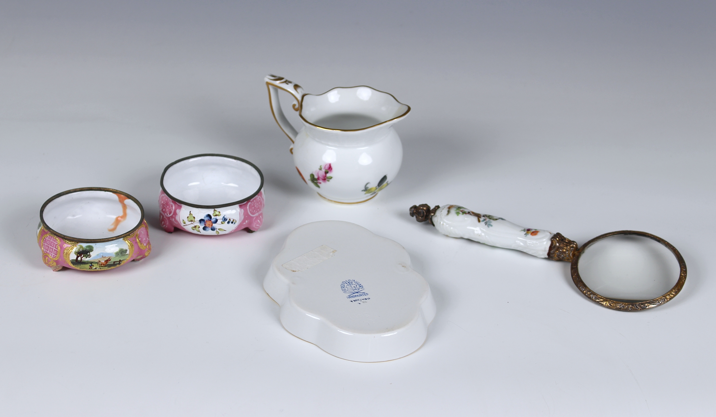 Two pieces of Herend porcelain comprising a small 455 cream jug painted with fruit, 6.7cm. high; and a small lobed tray in Queen Victoria pattern, 13.6cm. long; together with two 19th century style enamel salts; and a porcelain and gilt metal magnifying glass, 18cm. long. (5) *Herend: good condition with No faults. - Salts: Corrosion to metal rims. both with damage to the bottom of the feet. - Magnifier: glaze cracks and Several Small hairlines to handle.