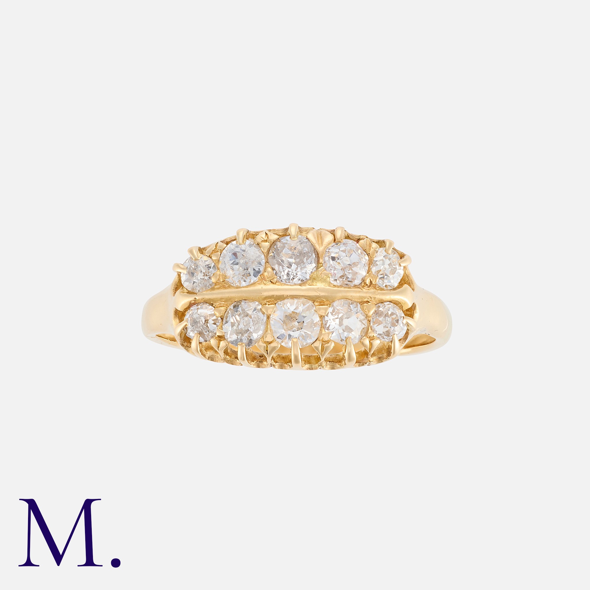 An Old Cut Diamond Ring in yellow gold, comprising two rows of graduated old cut diamonds totalling approximately 0.90cts. Unmarked but tests indicate 18 carat gold.