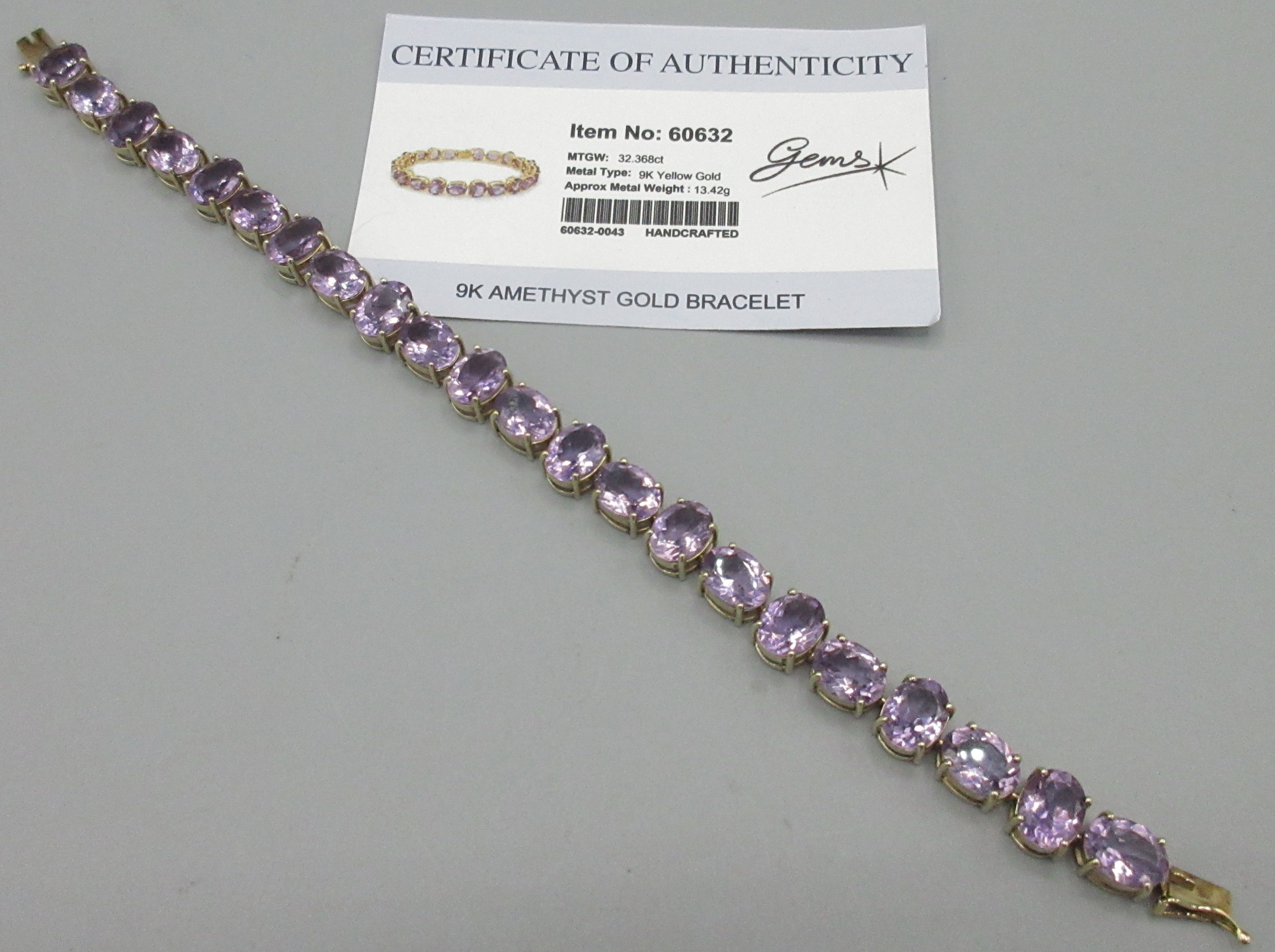 9ct yellow gold amethyst bracelet, stamped 375, L20cm, 20.0g