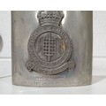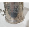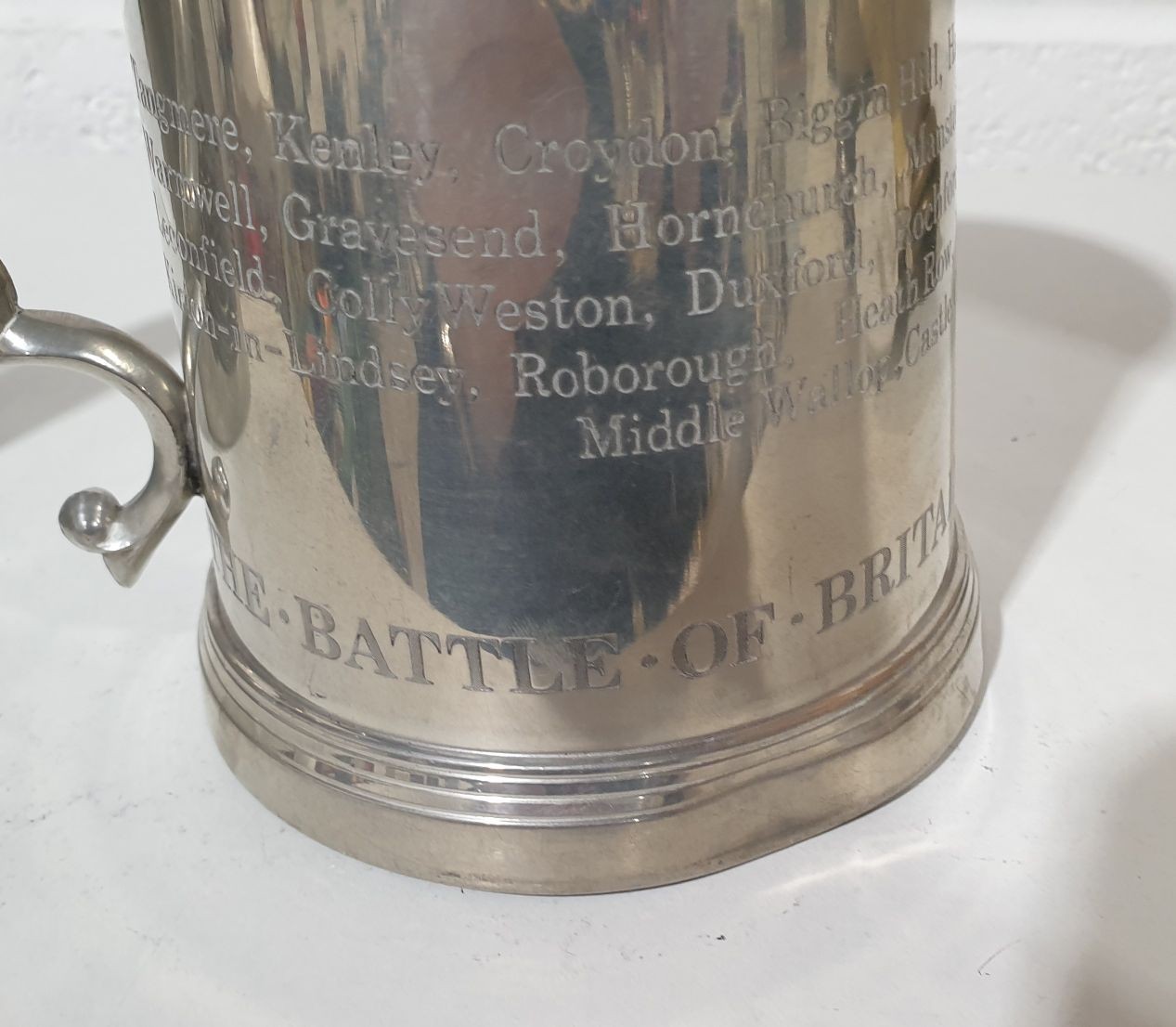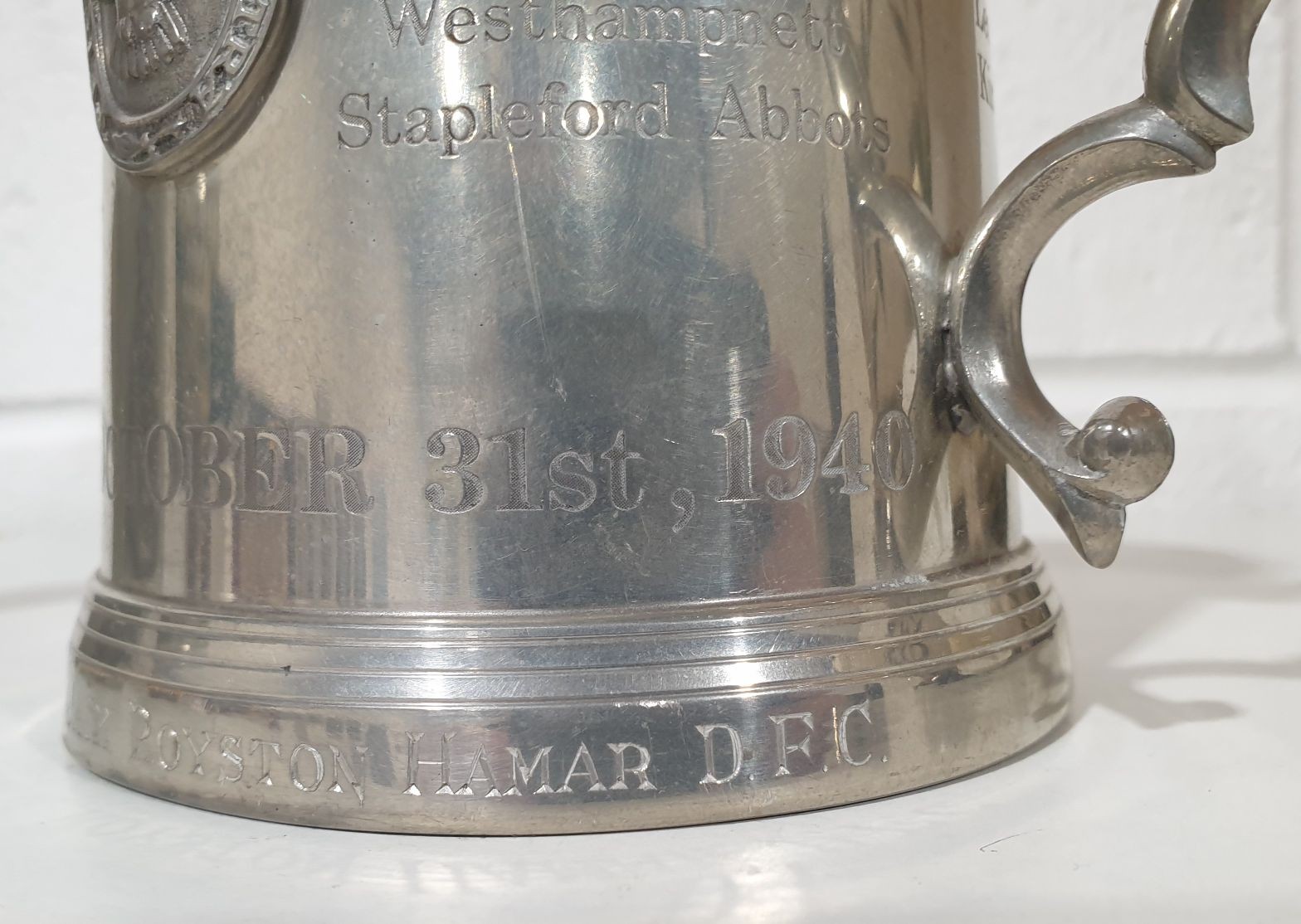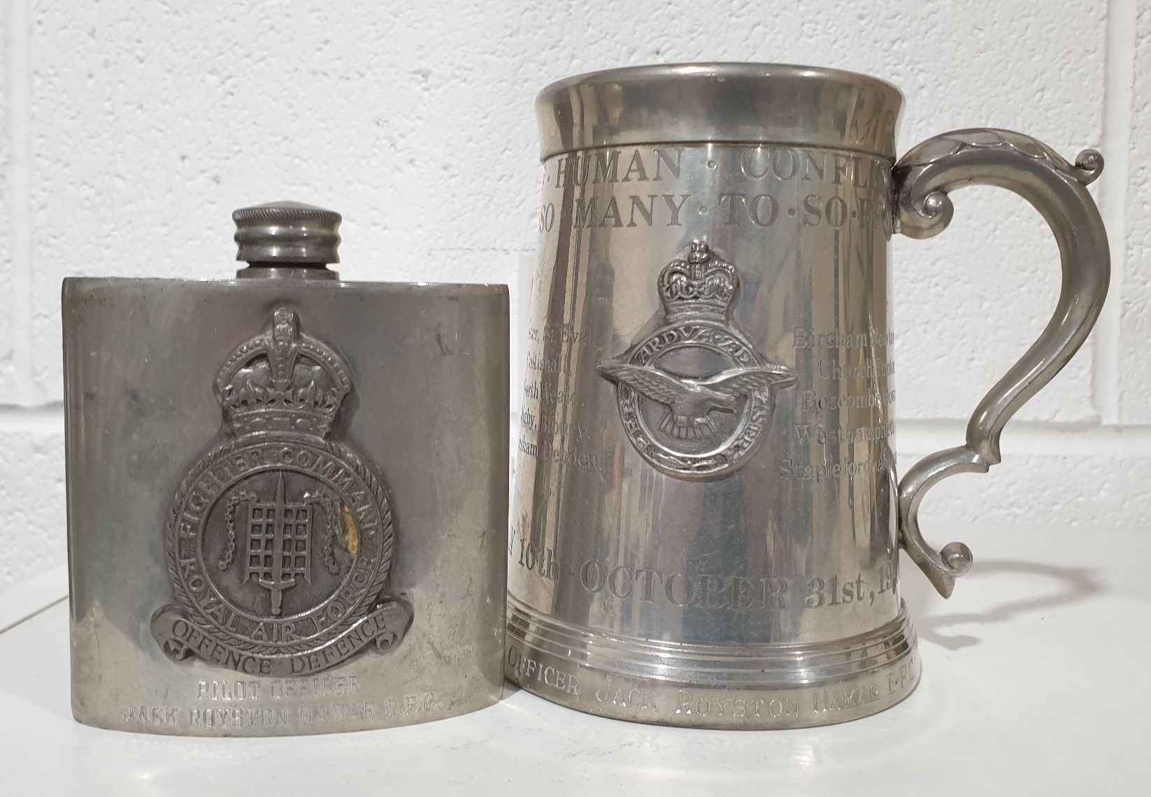 A pewter tankard commemorating the Battle of Britain engraved with the name of "Pilot Officer Jack Royston Hamar, DFC, A/F, height 5.5" together with a pewter hip flask bearing the RAF Fighter Command insignia and engraved with same.
