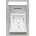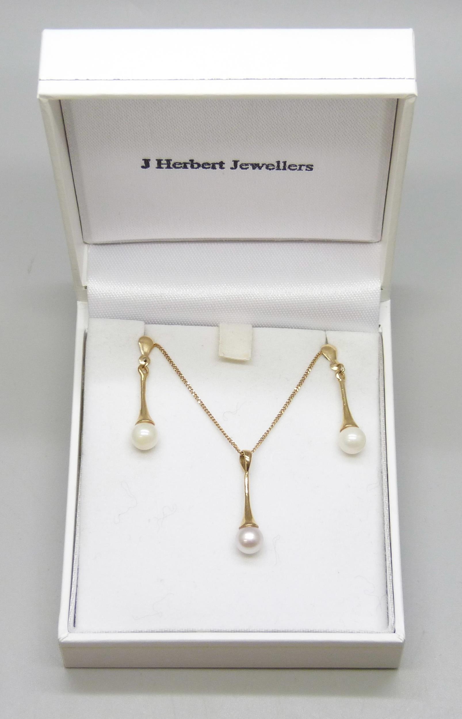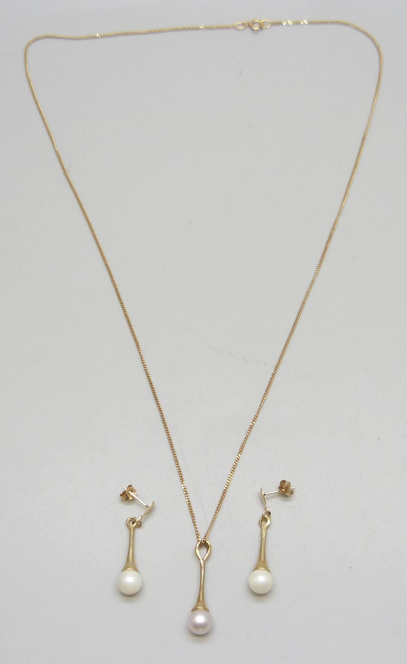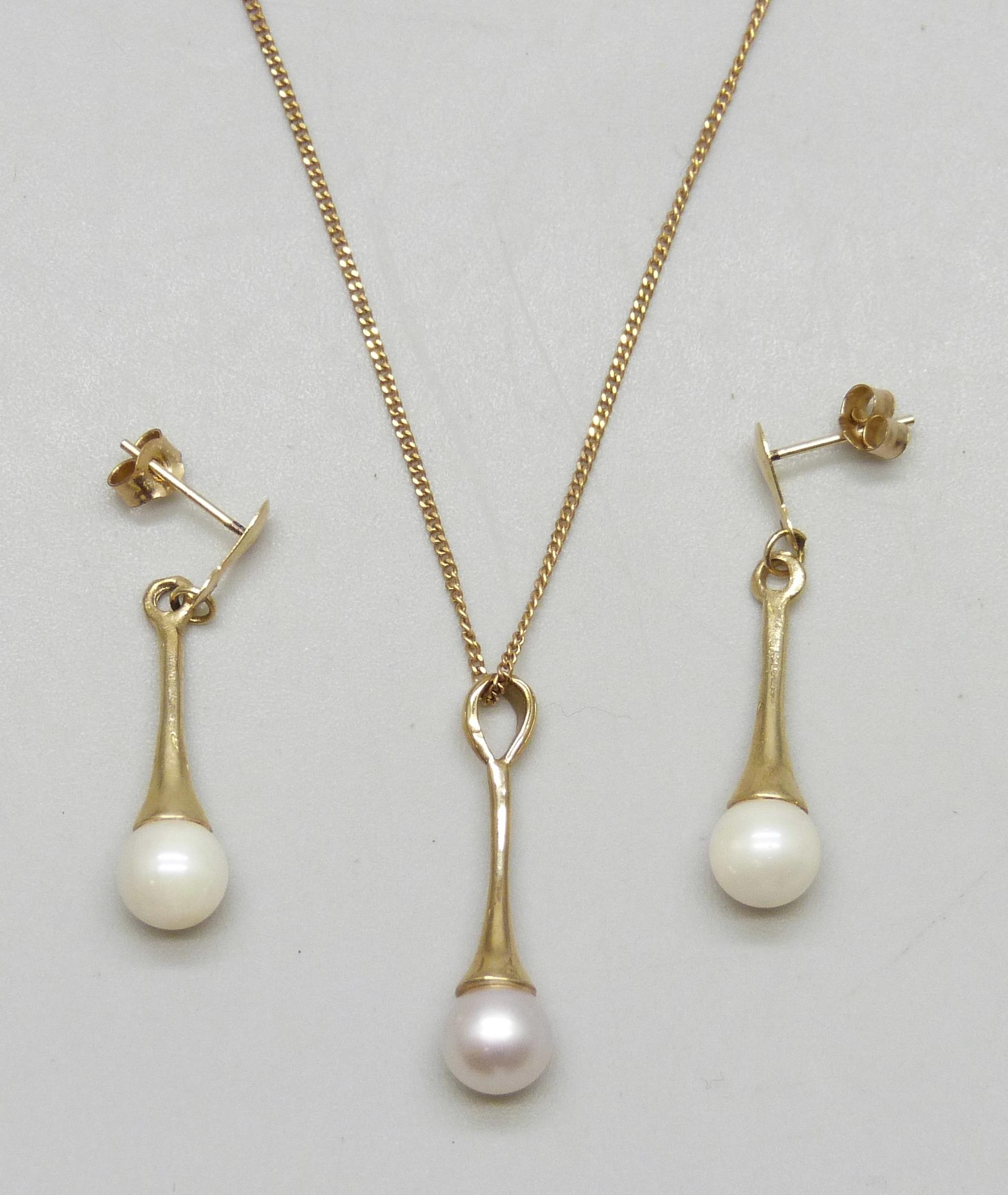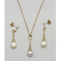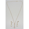 A 9ct gold chain with a yellow metal cultured pearl drop pendant, 2.2cm, and a pair of matching yellow metal earrings, 3.3g total weight