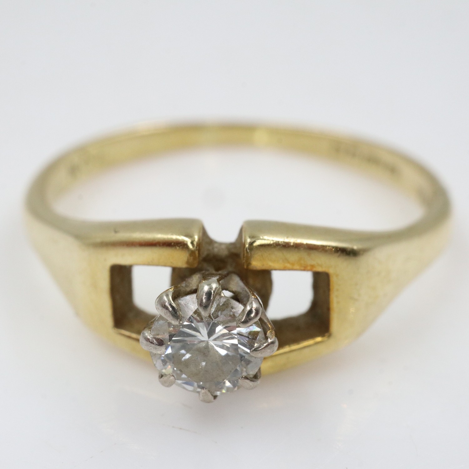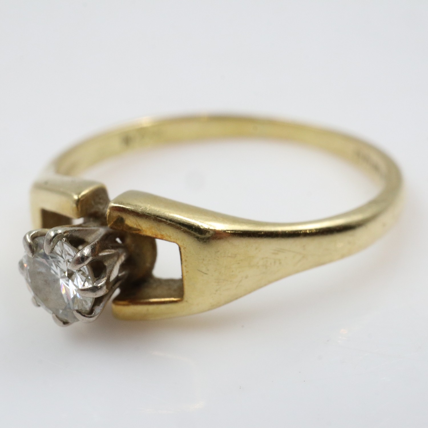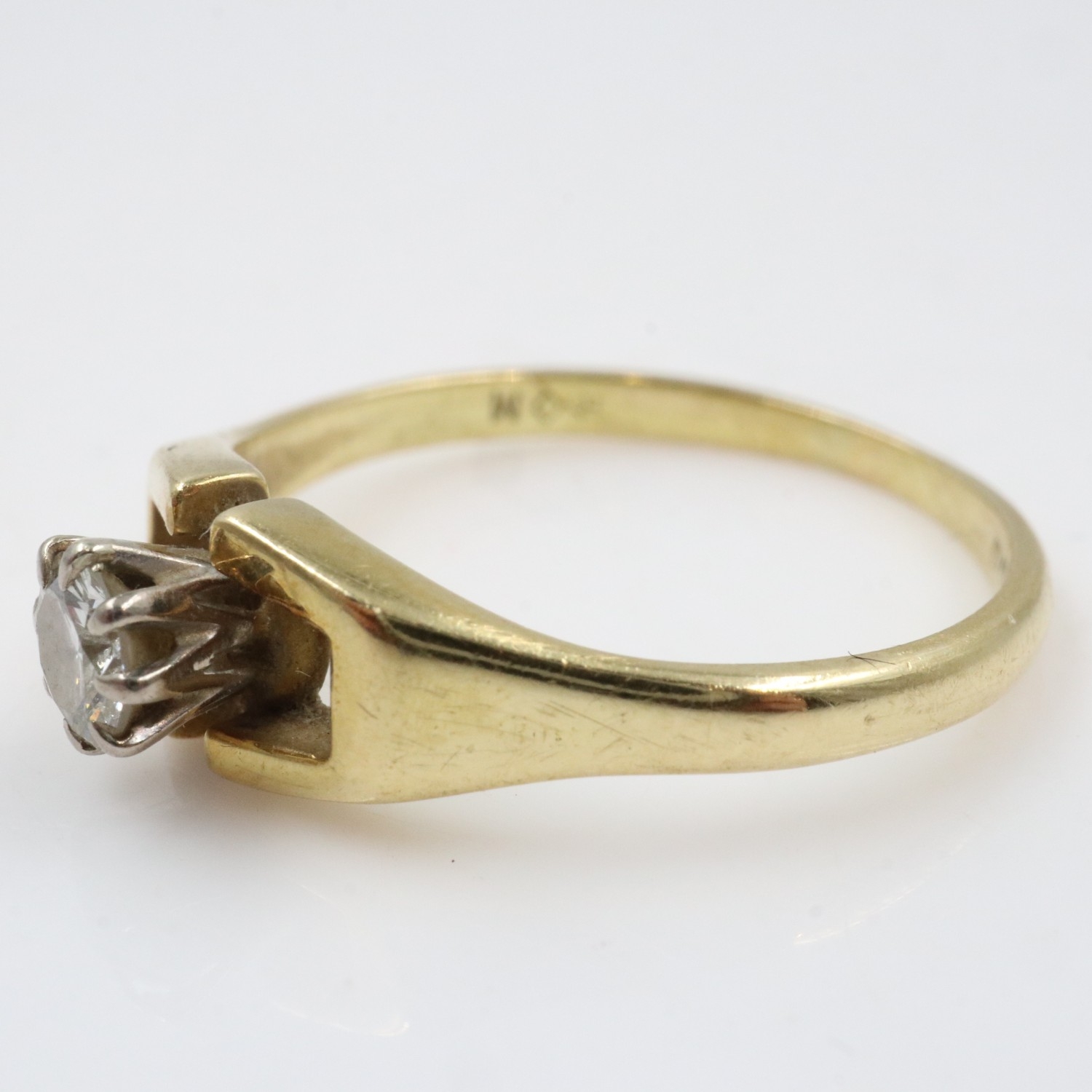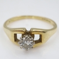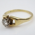 Contemporary 18ct gold solitaire ring set with a round-cut diamond in a raised claw setting, size N/O, 2.7g. UK P&P Group 0 (£7+VAT for the first lot and £1+VAT for subsequent lots)