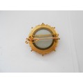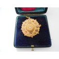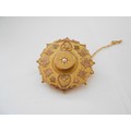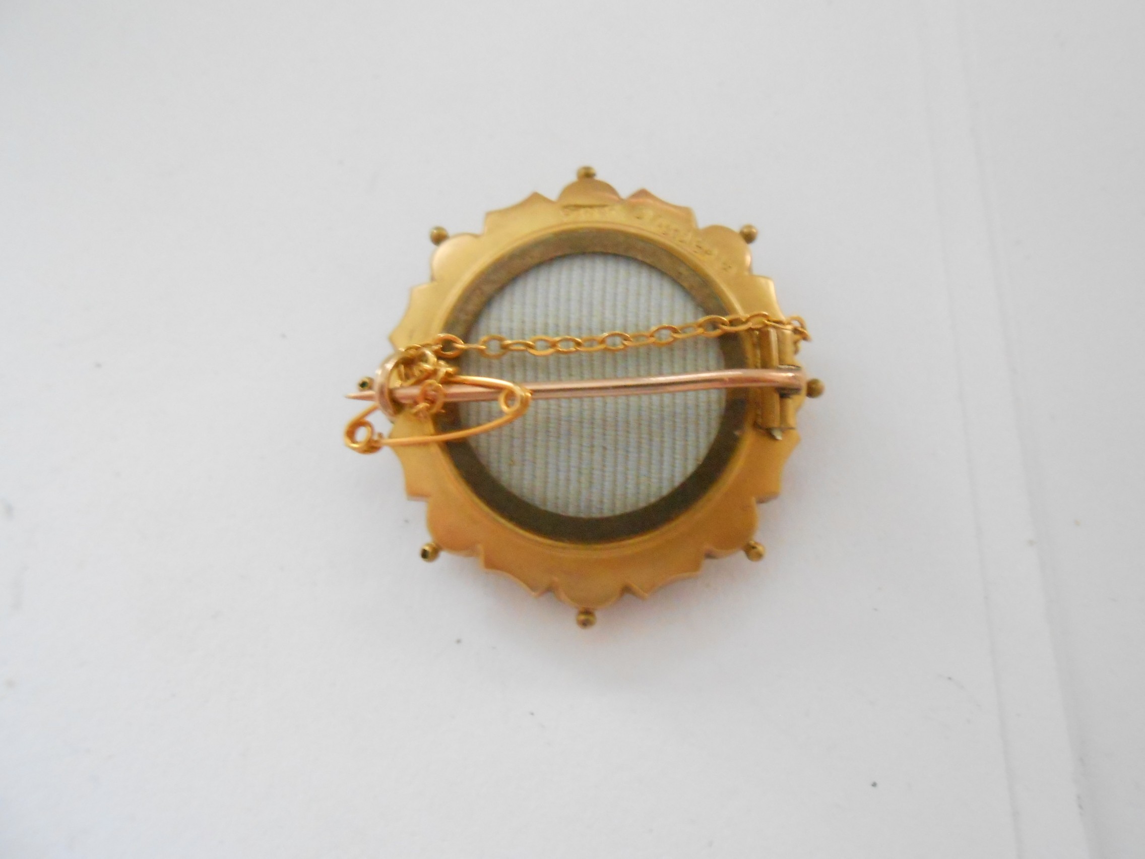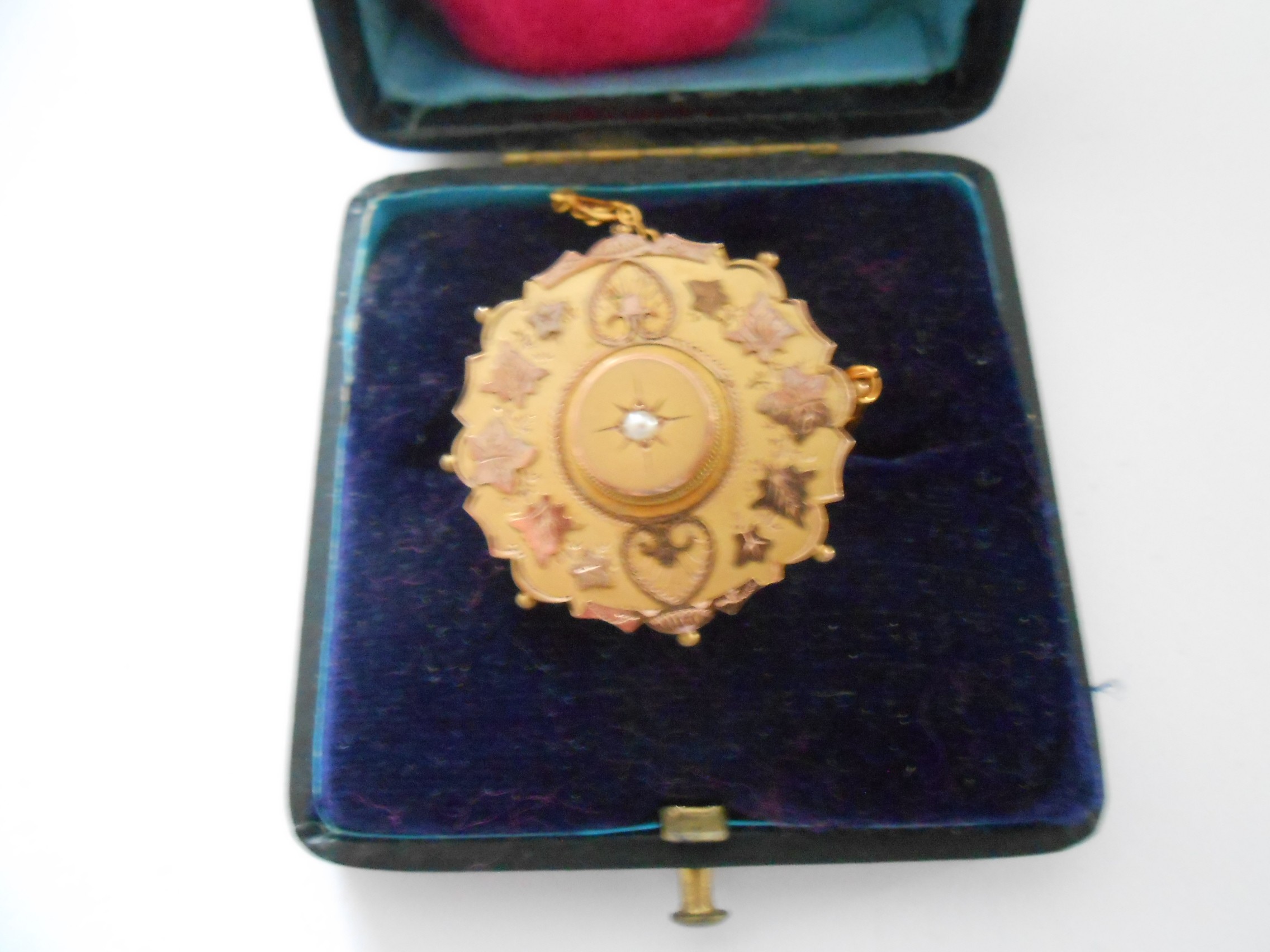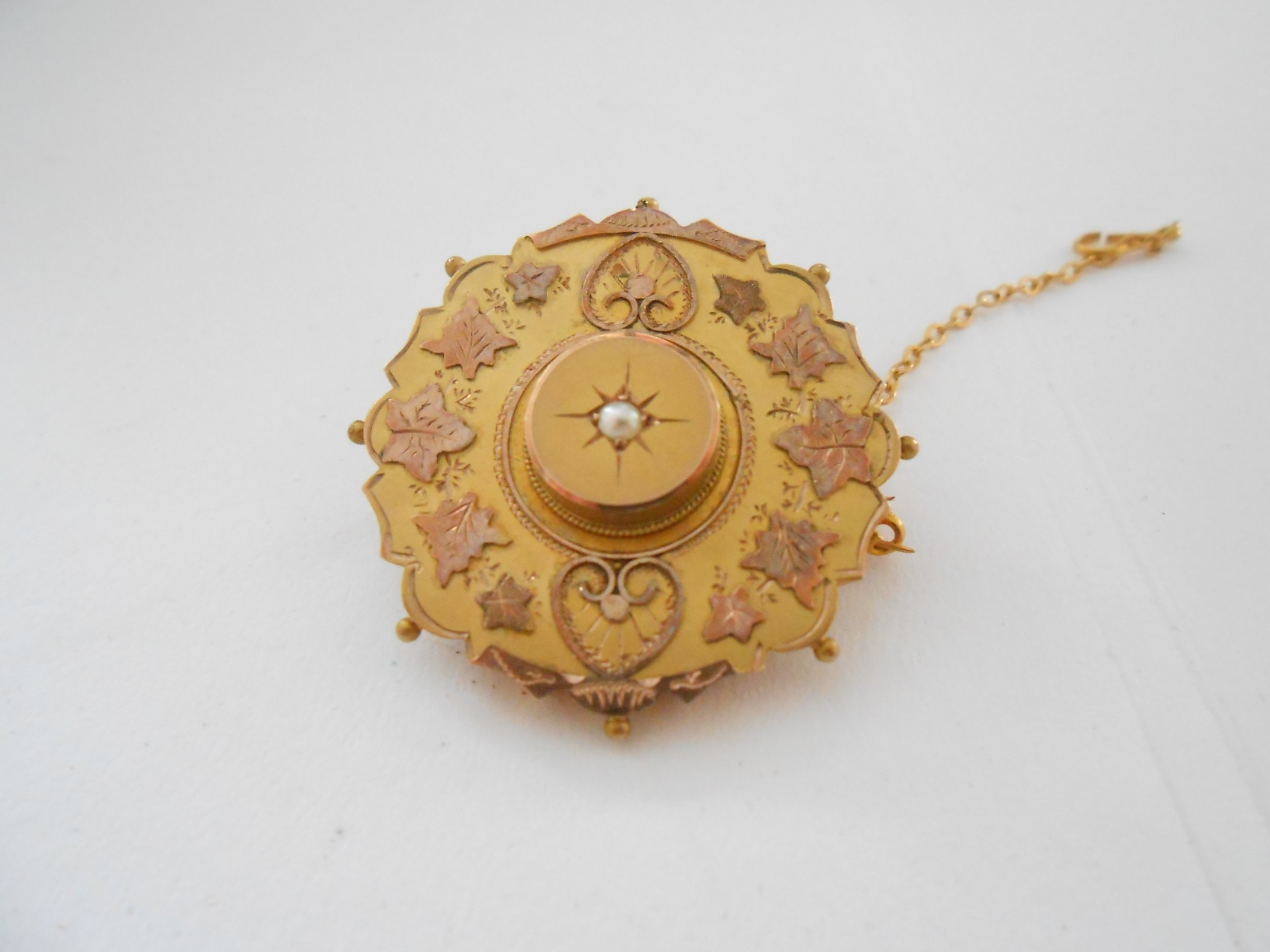 A 9ct. gold brooch of target form, the centre set pearl and two 9ct. gold charms in the form of a heart and a dolphin