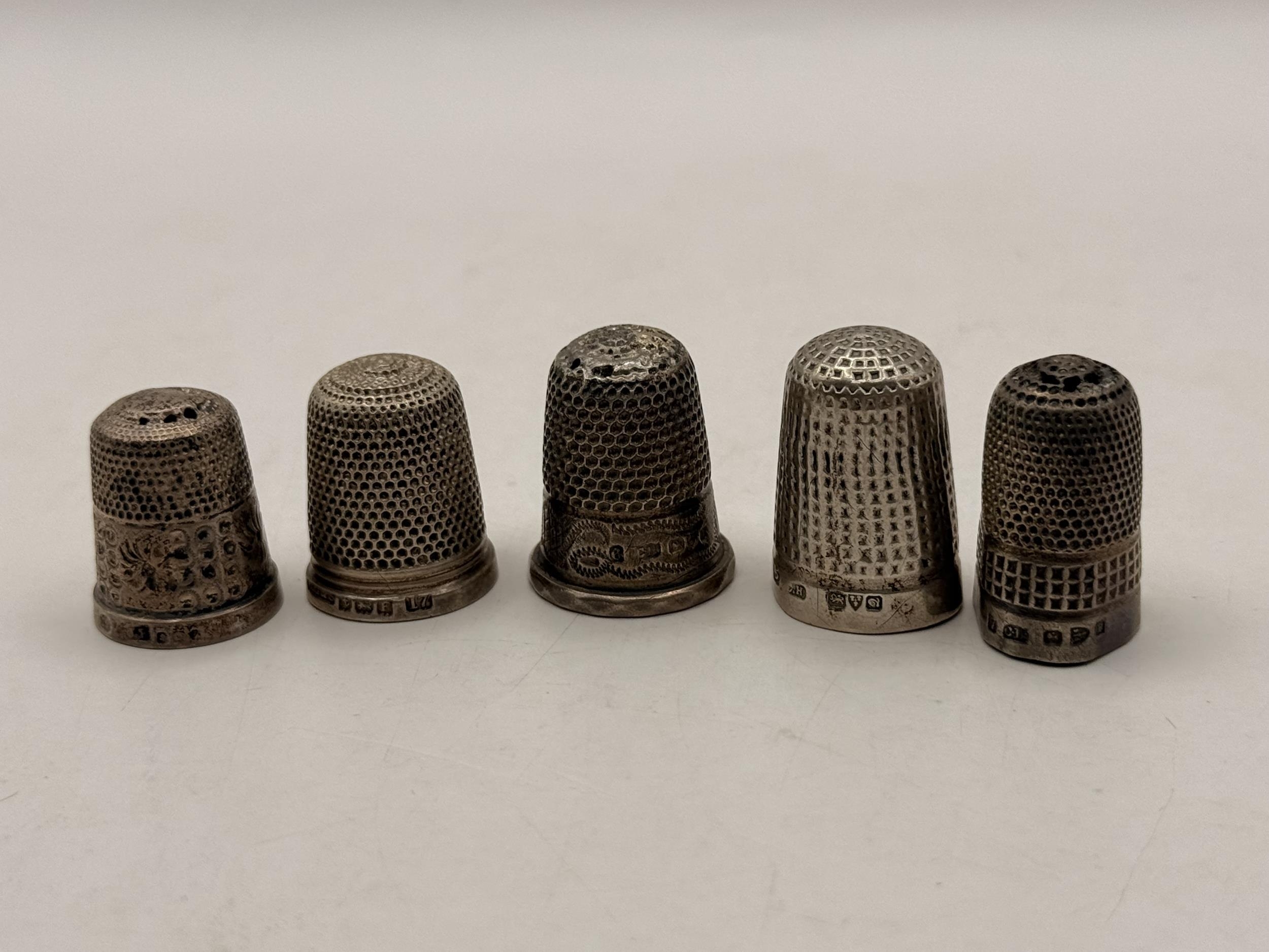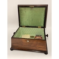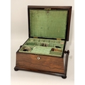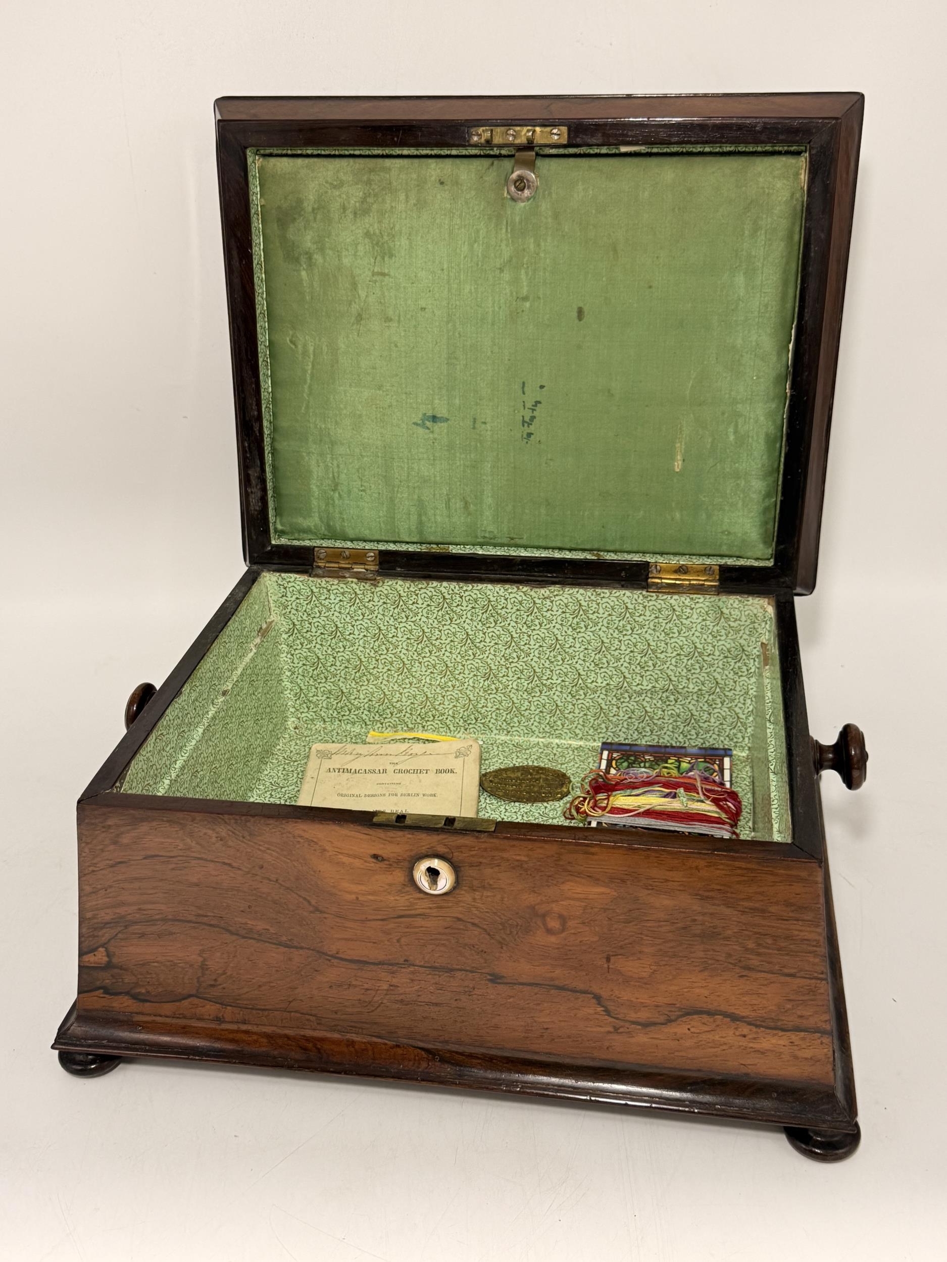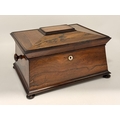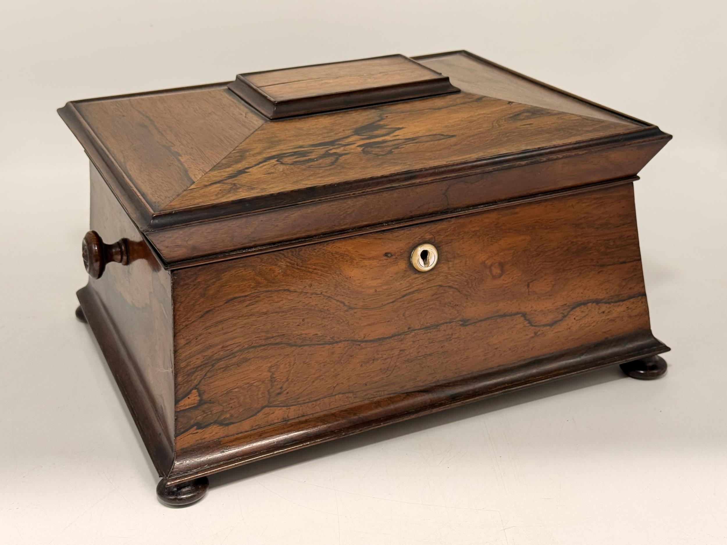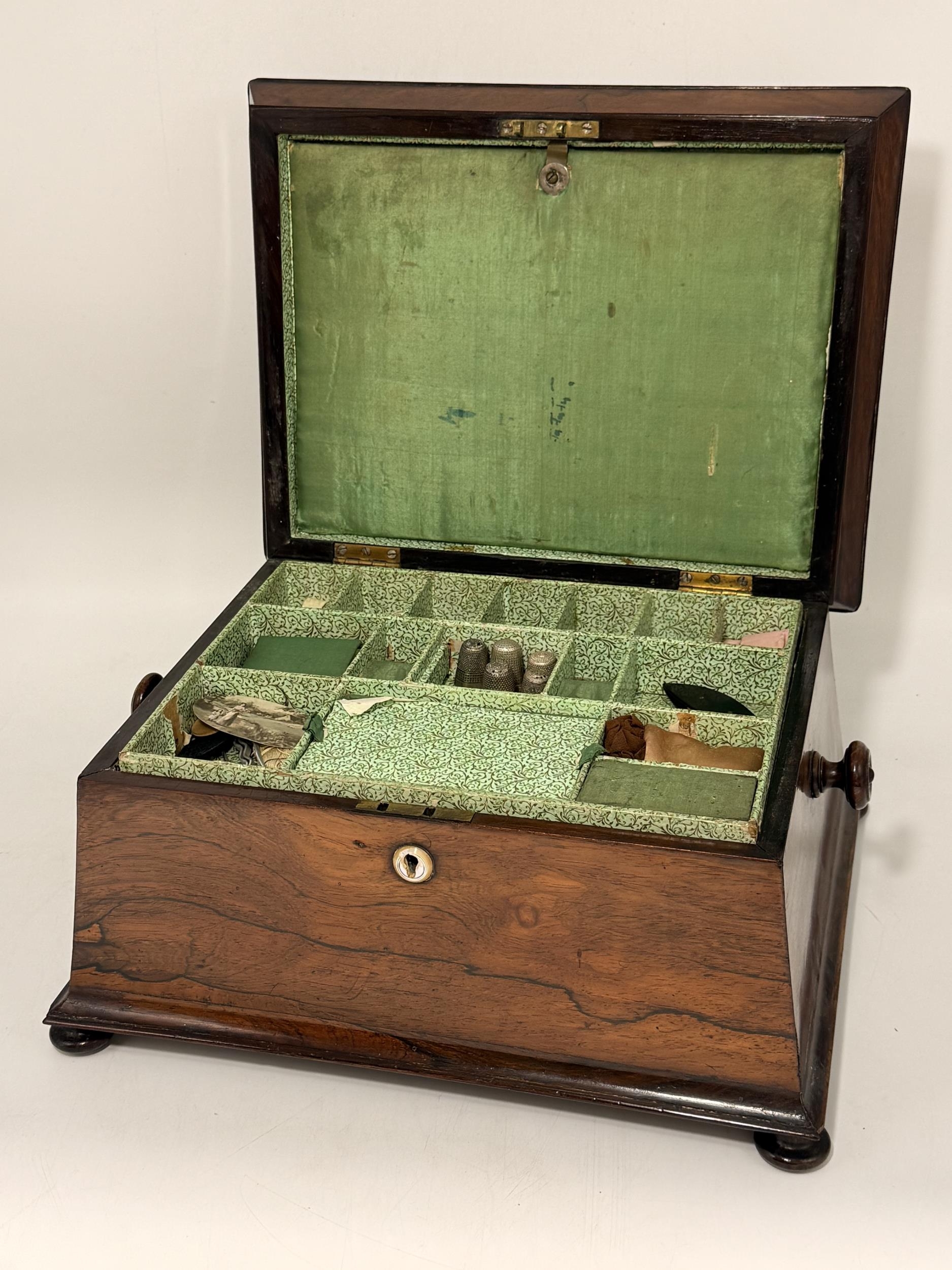 A 19th Century tabletop work box, sarcophagus form with hinged cover and turned knob handles, the lift-out tray with various sewing accoutrements including five silver thimbles (three by Charles Horner, Chester; one by Henry Griffith & Sons Ltd, Birmingham; and one by James Fenton, Birmingham), raised on four flattened bun feet. 20cm high, 36cm wide, 29cm deep