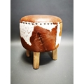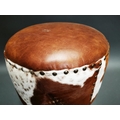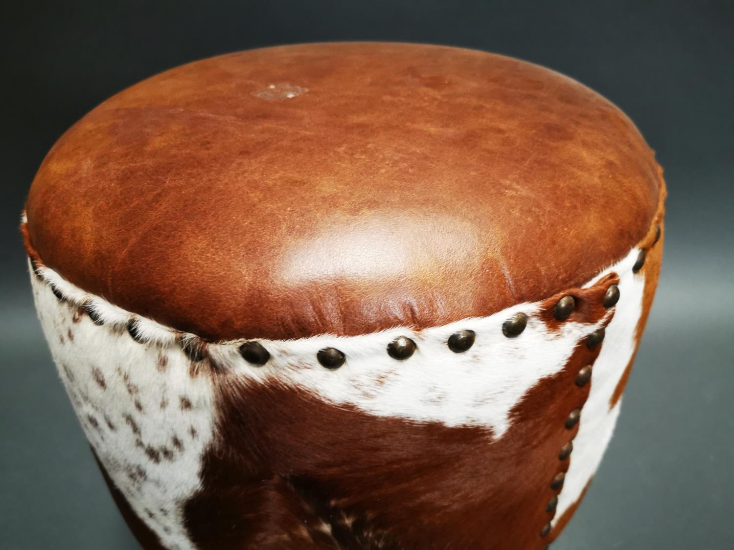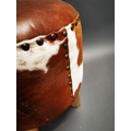 Vintage leather foot stool on turned wooden legs {44 cm H x 36 cm Dia.}.