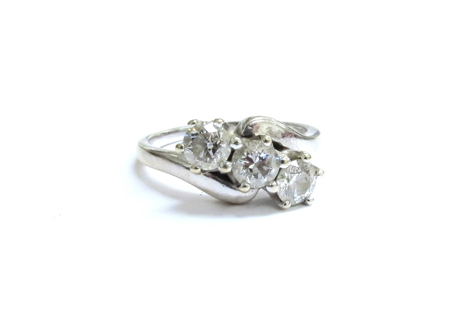 An 18ct white gold three stone diamond crossover ring, 1ct approx total. Size M, 4.4g