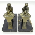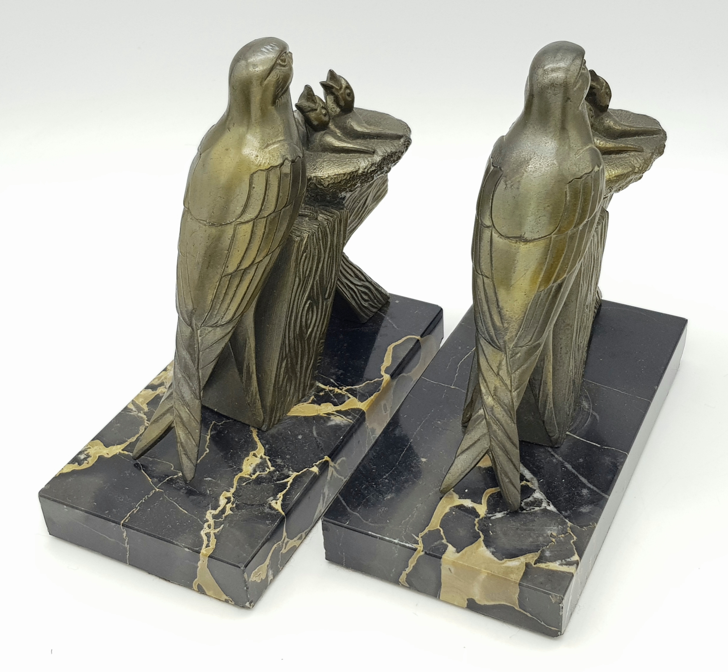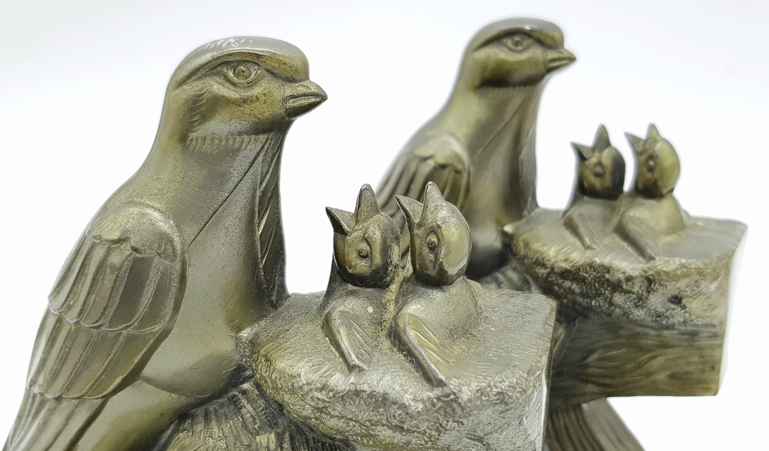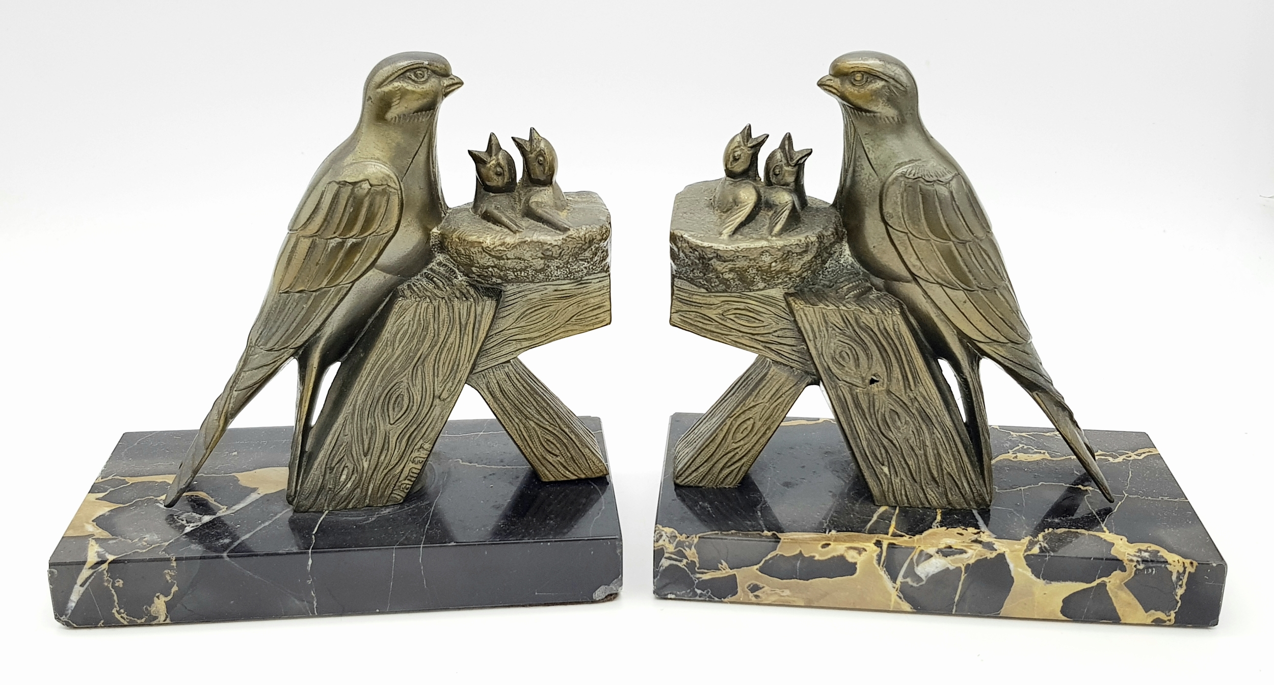 A TRULY SUPERB RARE PAIR OF ART DECO BRONZE BOOKENDS. WONDERFUL QUALITY AND DETAIL FEATURING A MOTHER BIRD FEEDING HER YOUNG IN A NEST. SIGNED JAMAR 1920S/30S. ON AN ITALIAN MARBLE BASE. IN VERY GOOD ANTIQUE CONDITION.