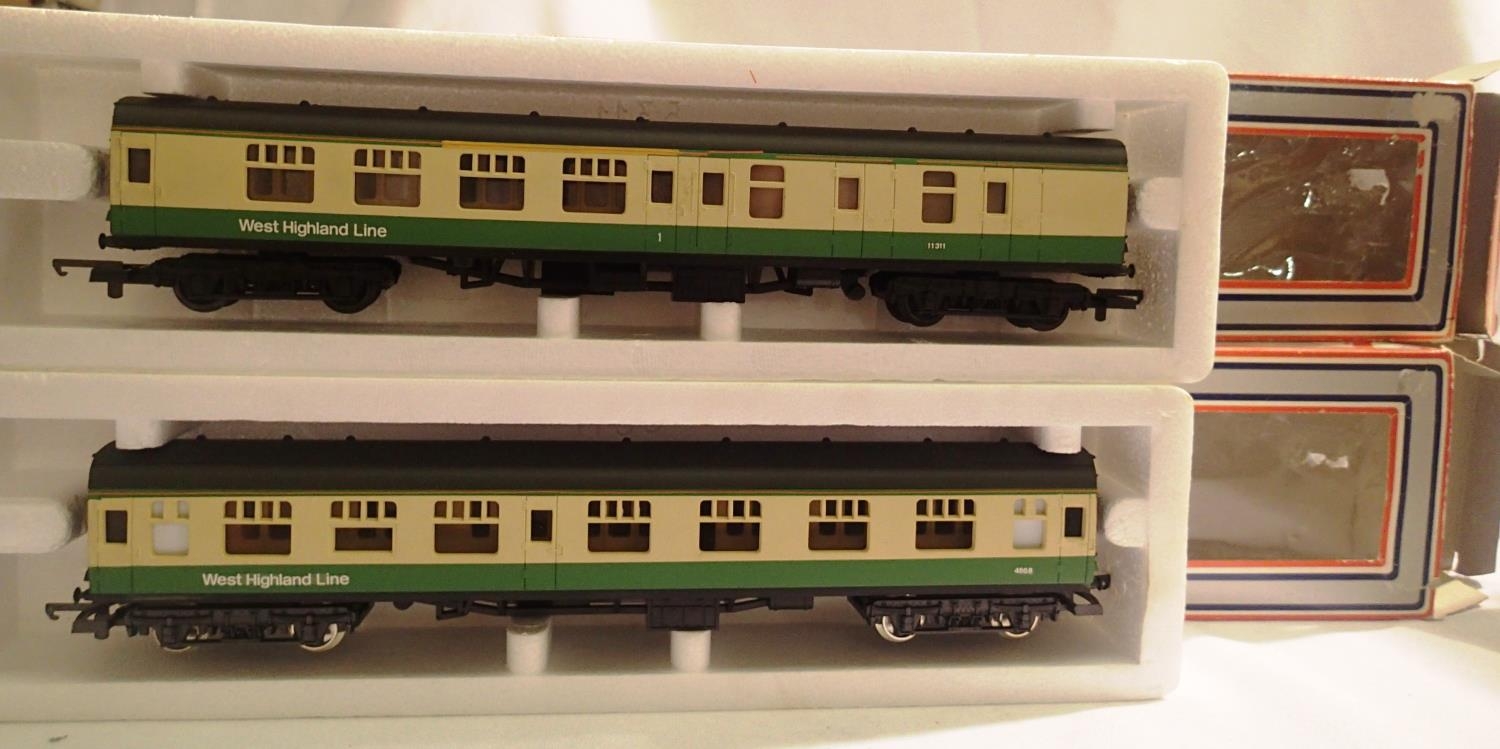 OO scale Lima West Highland Line, green and cream coaches, composite and brake end, both in excellent - near mint condition, boxes are fair. P&P Group 1 (£14+VAT for the first lot and £1+VAT for subsequent lots)