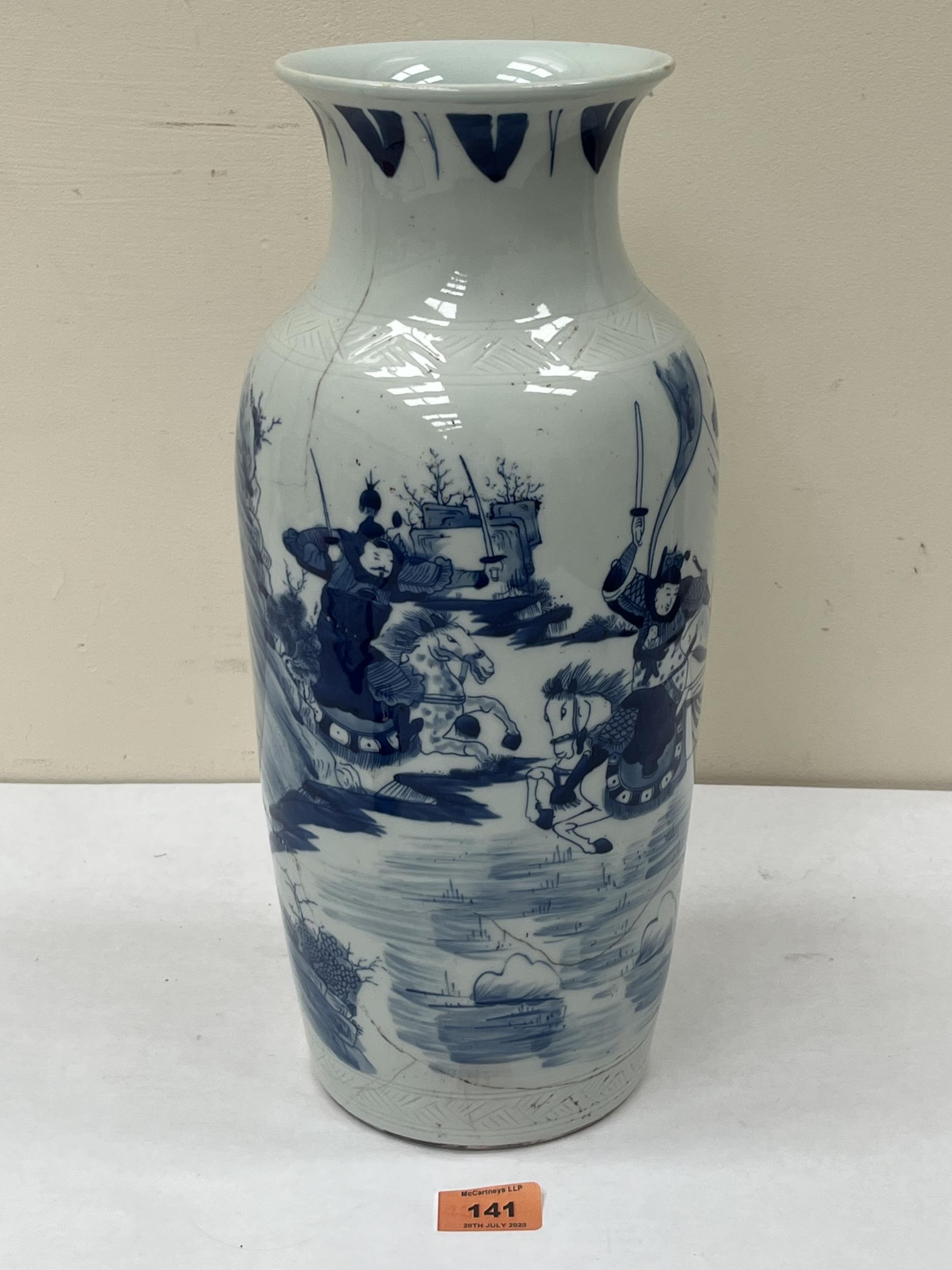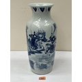 A Chinese blue and white decorated vase. 15' high. Extensive cracks.