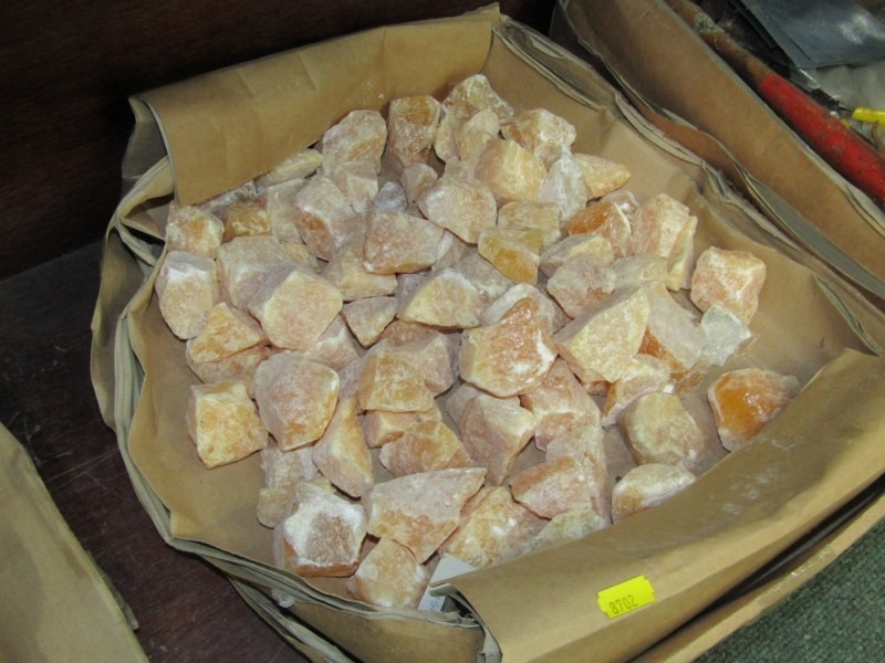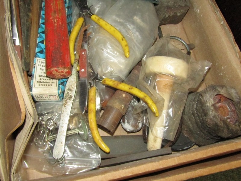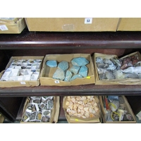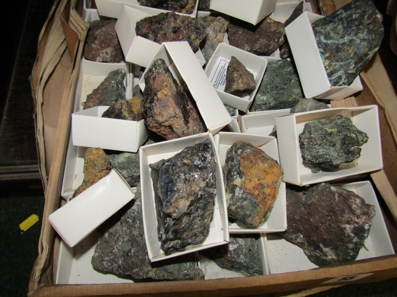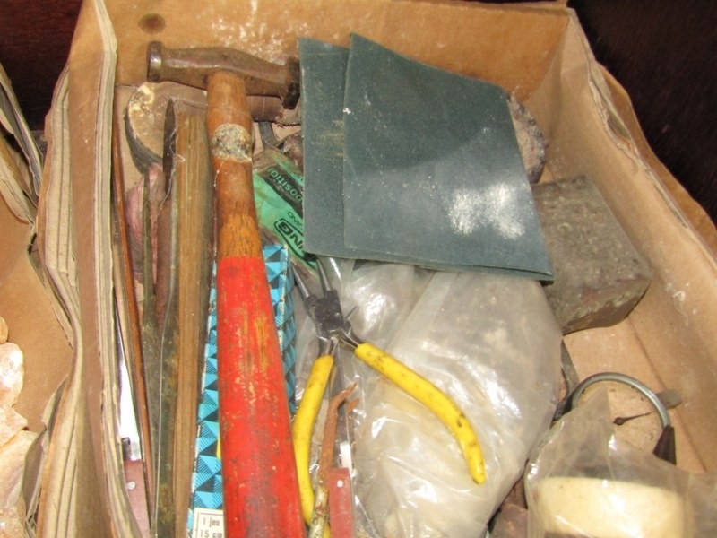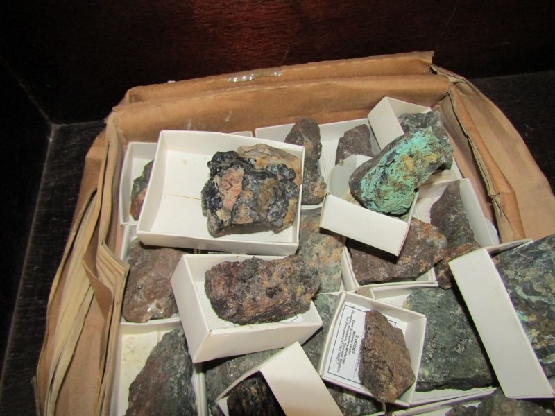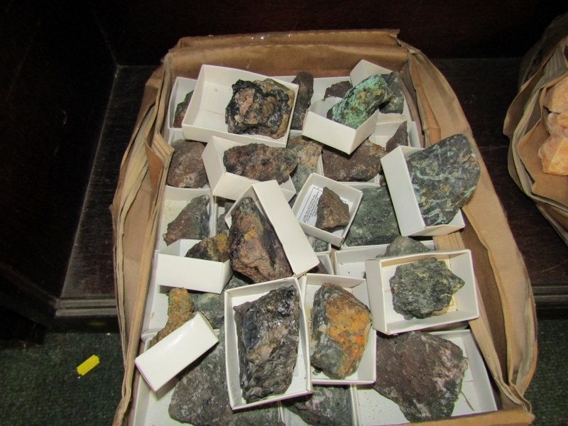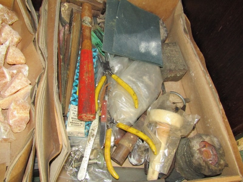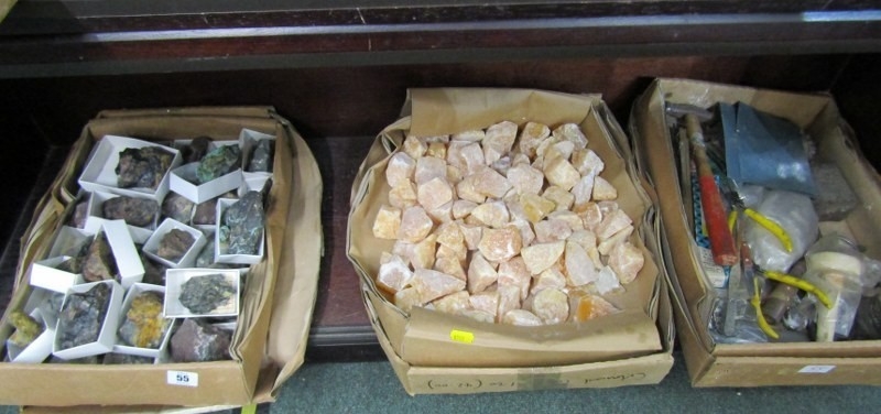 TWO BOXED OF MINERALS, including orange calcite together with a box of tools