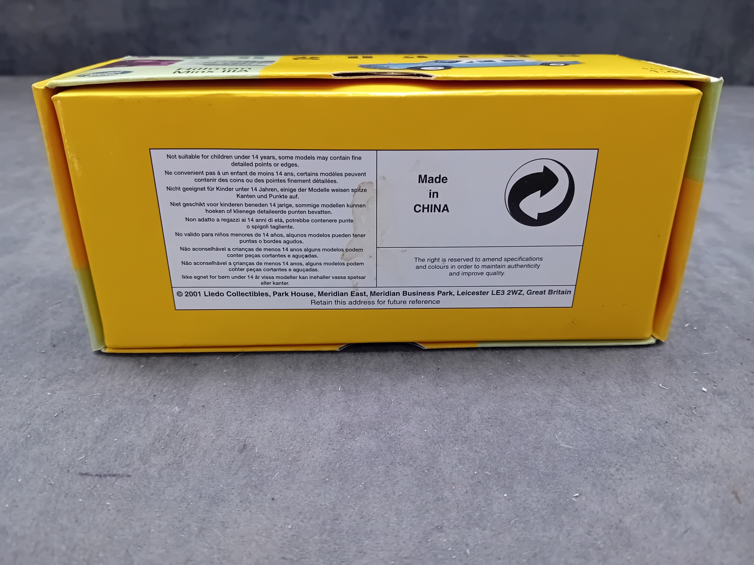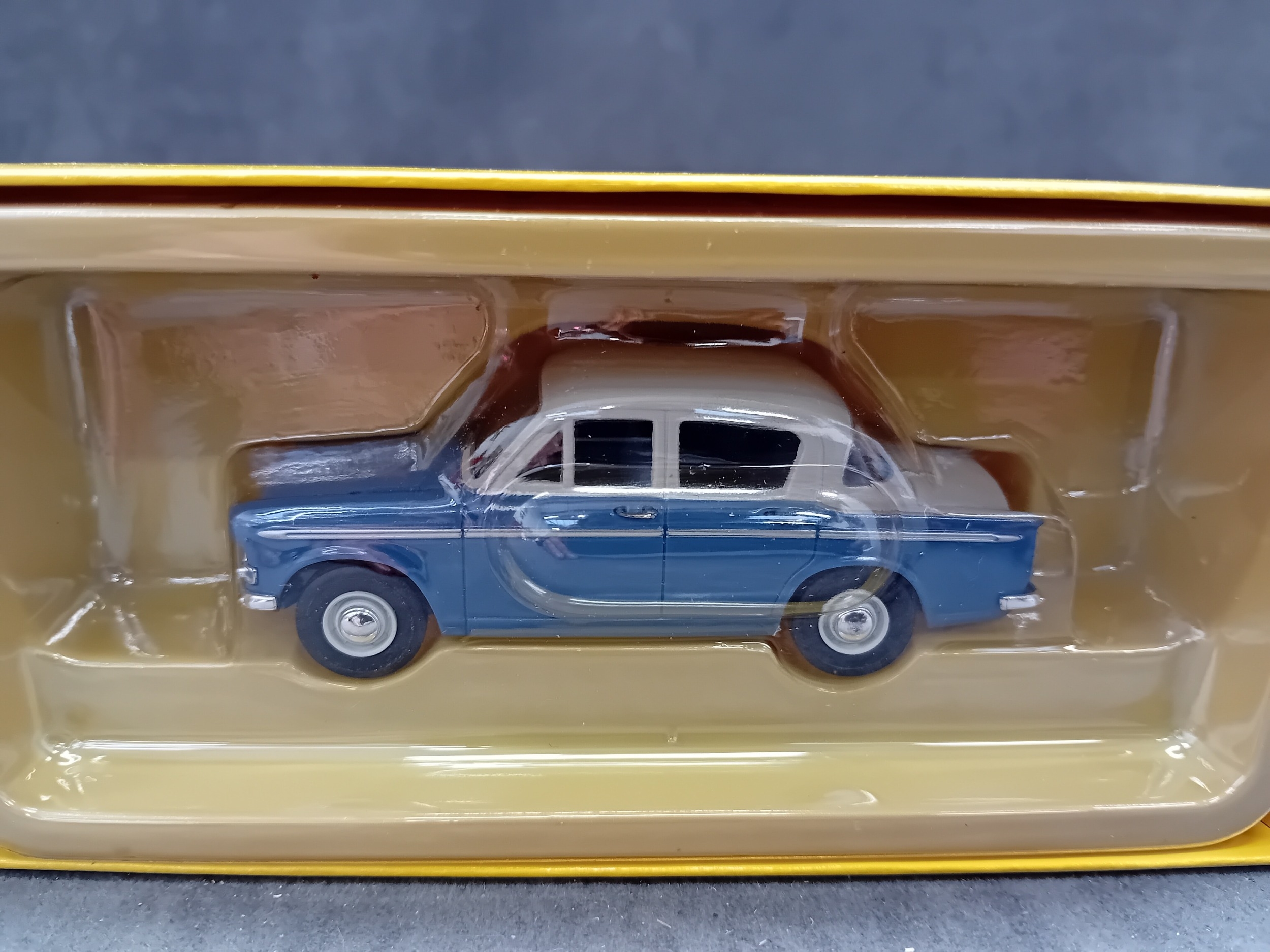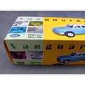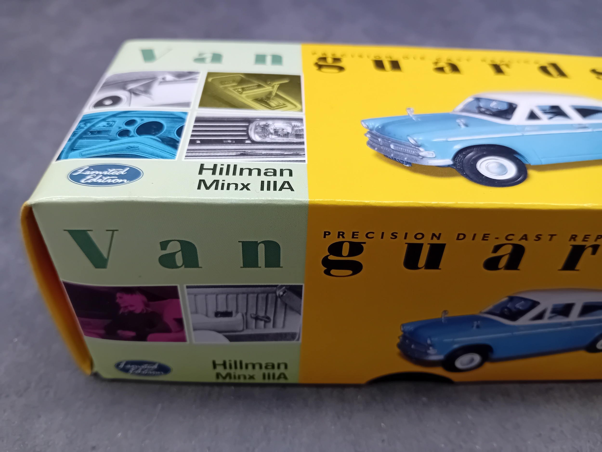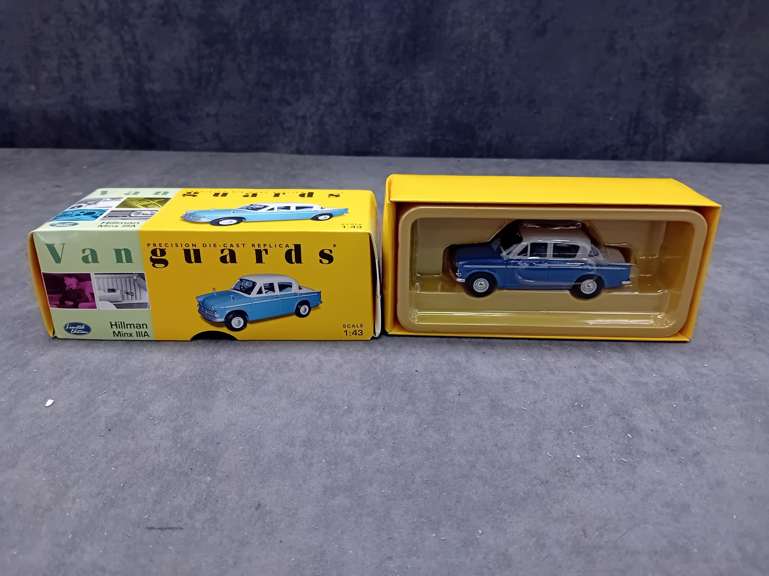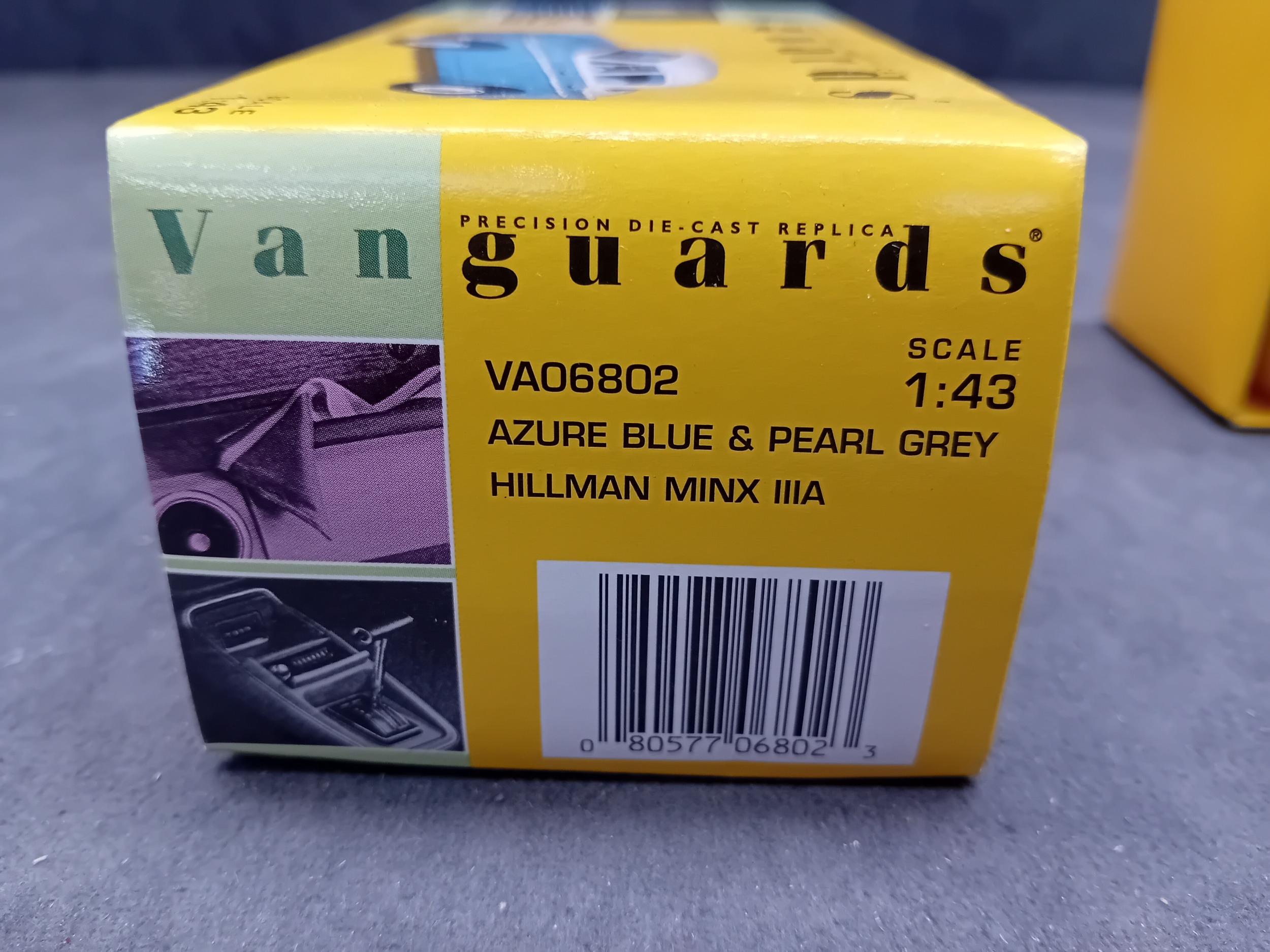 A Vanguards VA06802 Hillman Minx IIIA precision die-cast replica model car, presented in Azure Blue & Pearl Grey at a 1:43 scale. The model is enclosed within a clear plastic blister pack, which is housed inside its original yellow and green cardboard box. The box features "Vanguards" branding, "Limited Edition" text, model number VA06802, a barcode, and is marked "Made in CHINA" with a © 2001 Lledo Collectibles copyright. Various multilingual warnings indicate it is "Not suitable for children under 14 years."