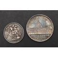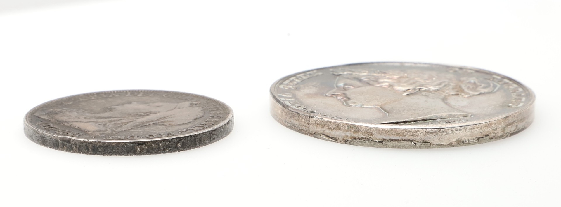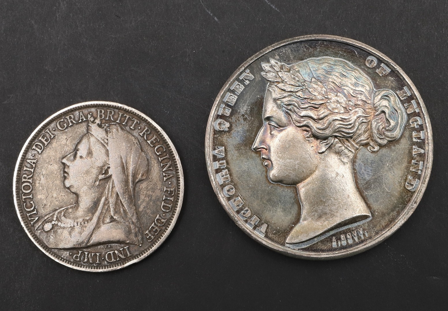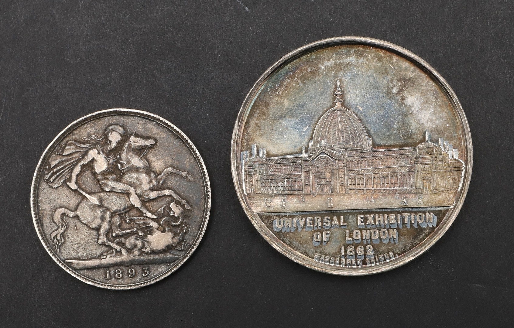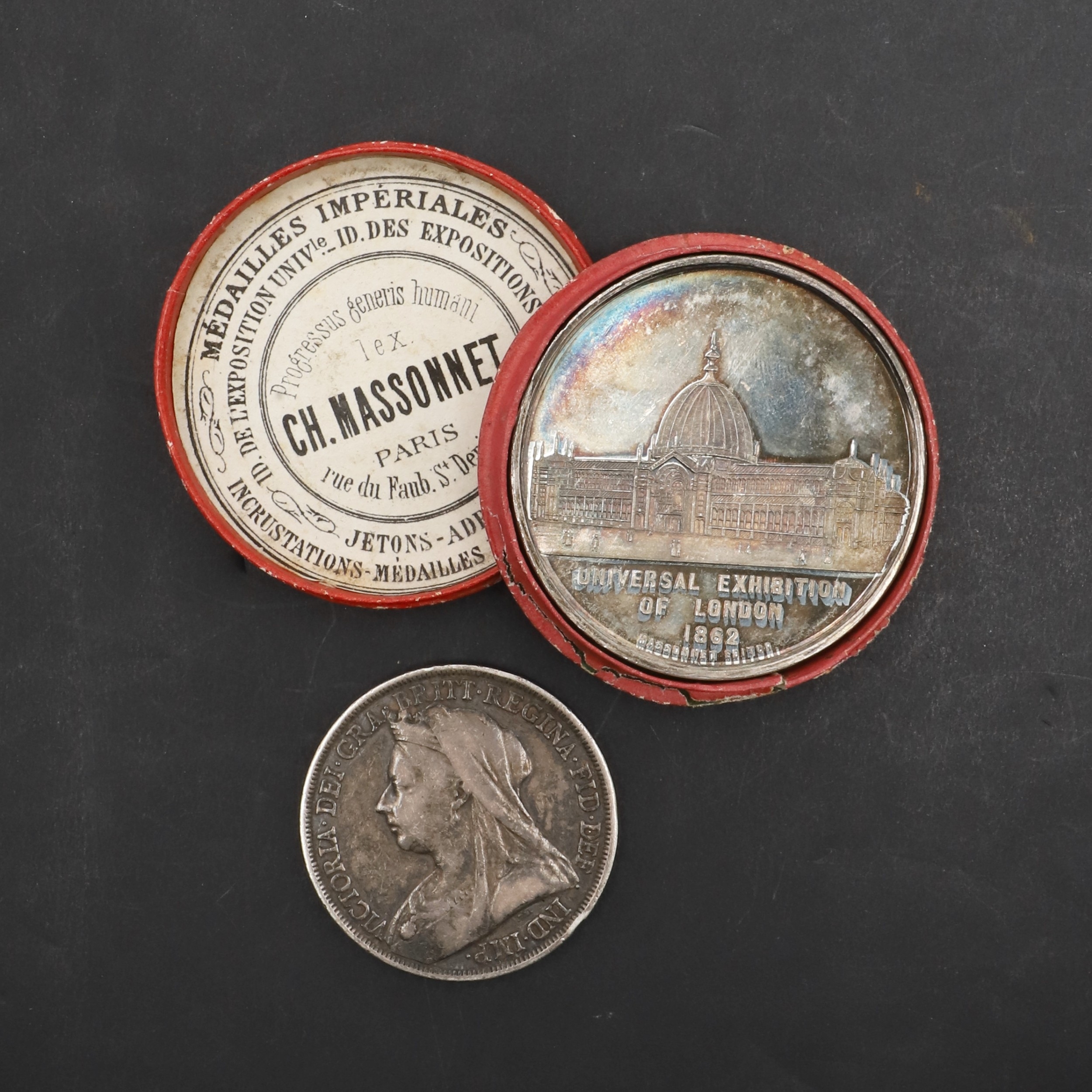 AN 1862 EXHIBITION MEDAL BY MASSONNET OF PARIS AND AN 1893 CROWN. An historic medal commemorating the International Exhibition in London 1862 by CH. Massonnet of Paris, in original Ch Massonnet box of issue. 5cm. And Queen Victoria crown 1893.