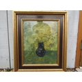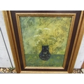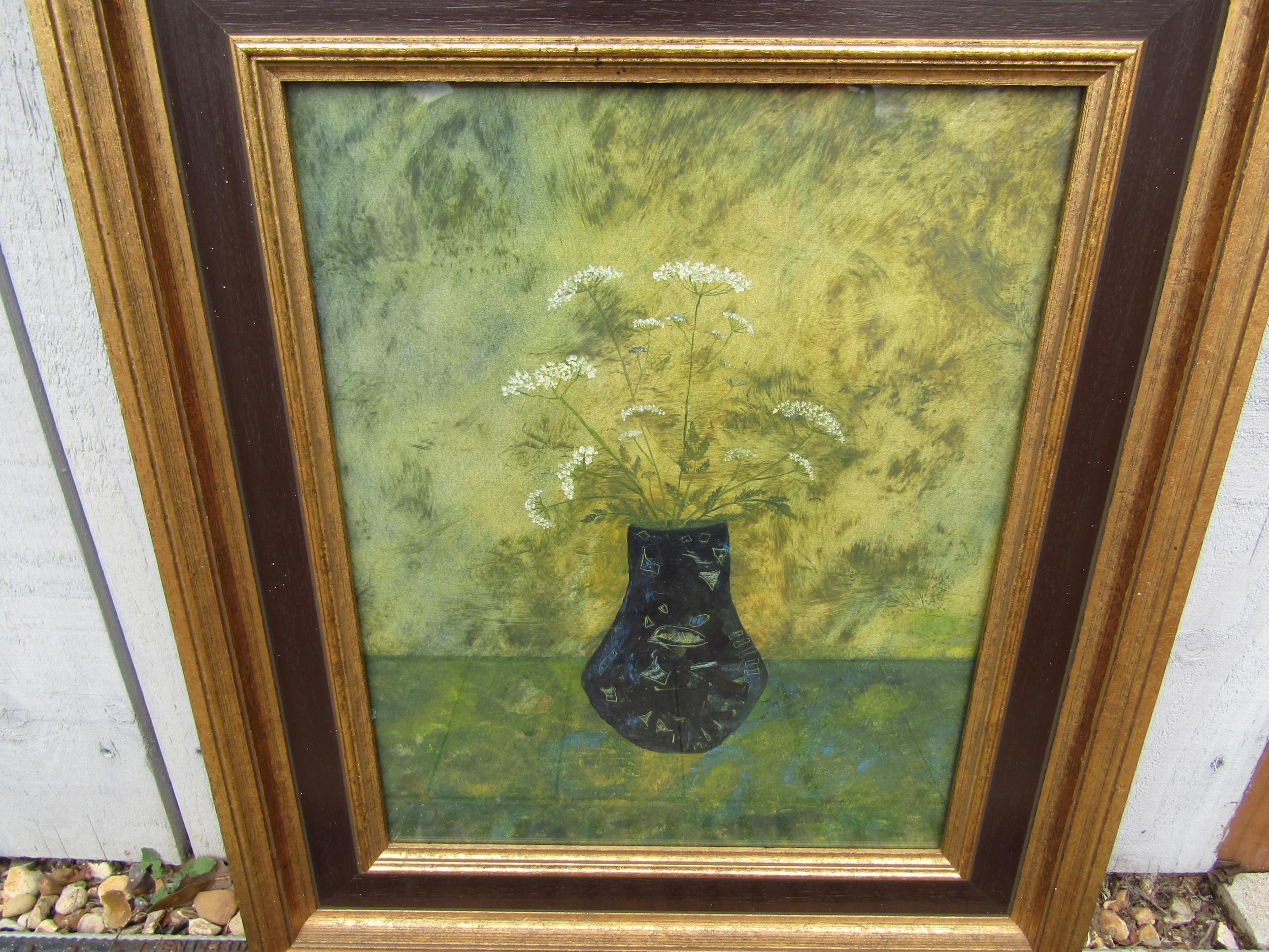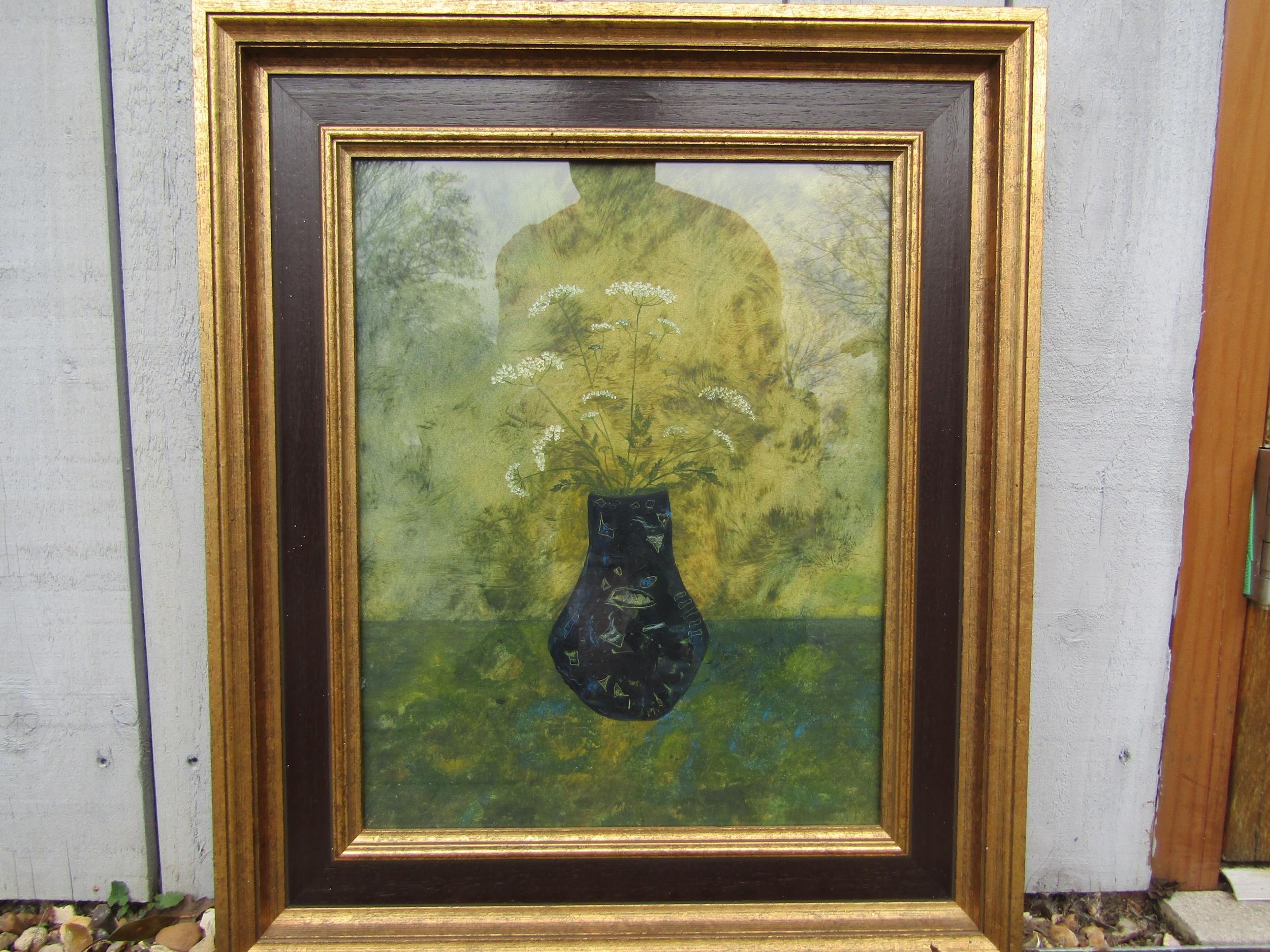 JAN BOND - still life vase of flowers, green background, monogrammed JB 85, 41cm x 32cm
