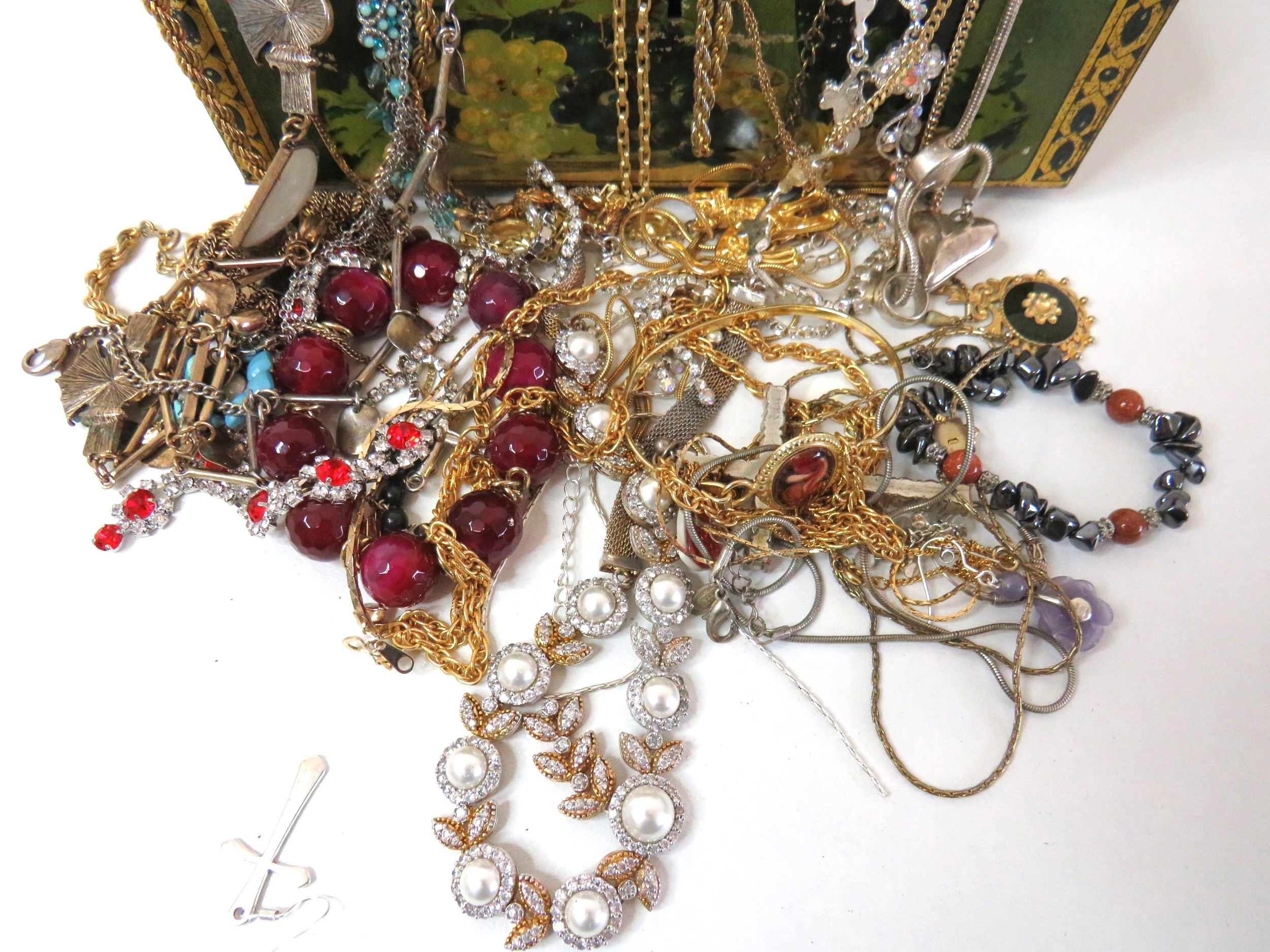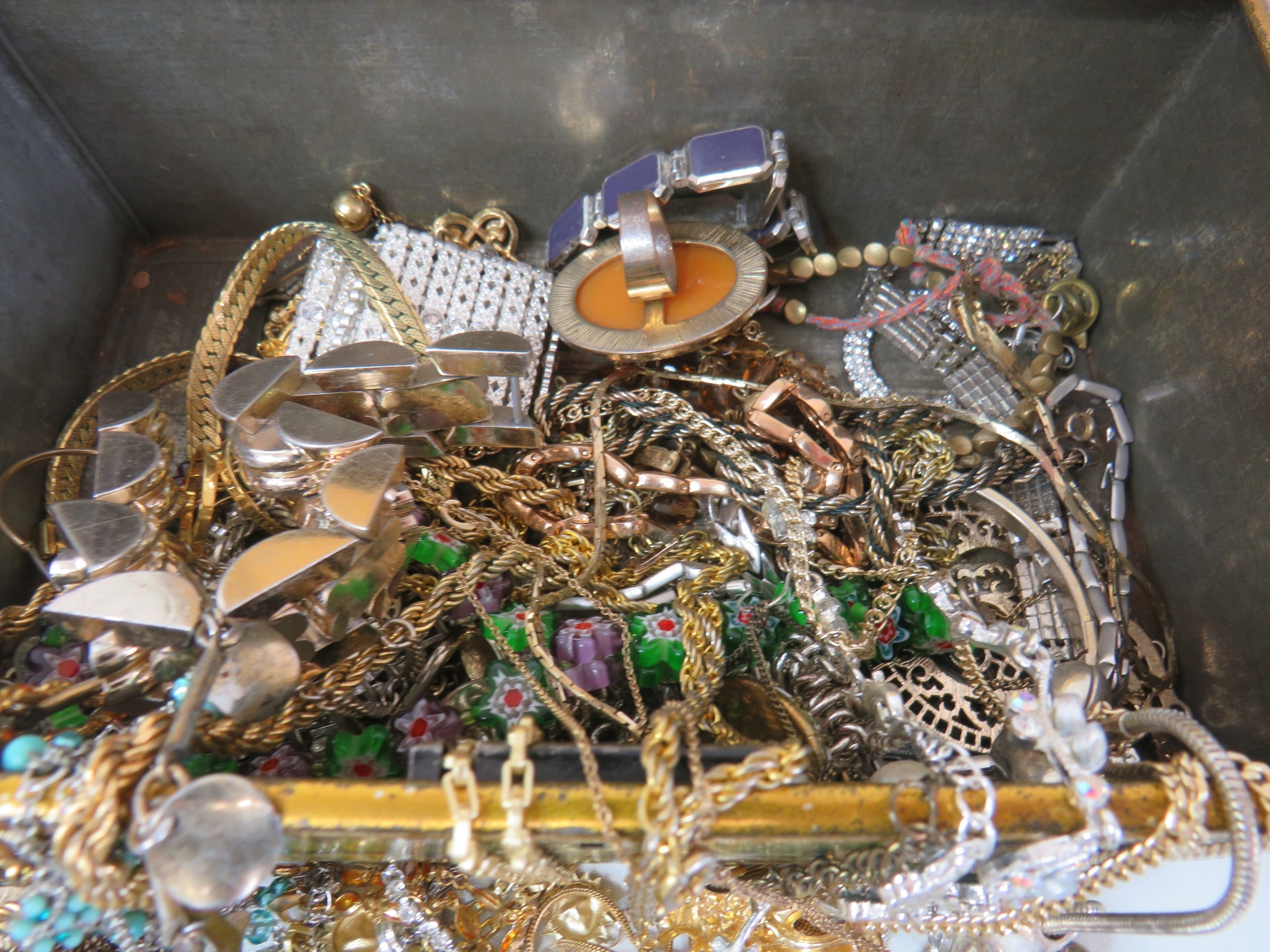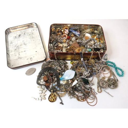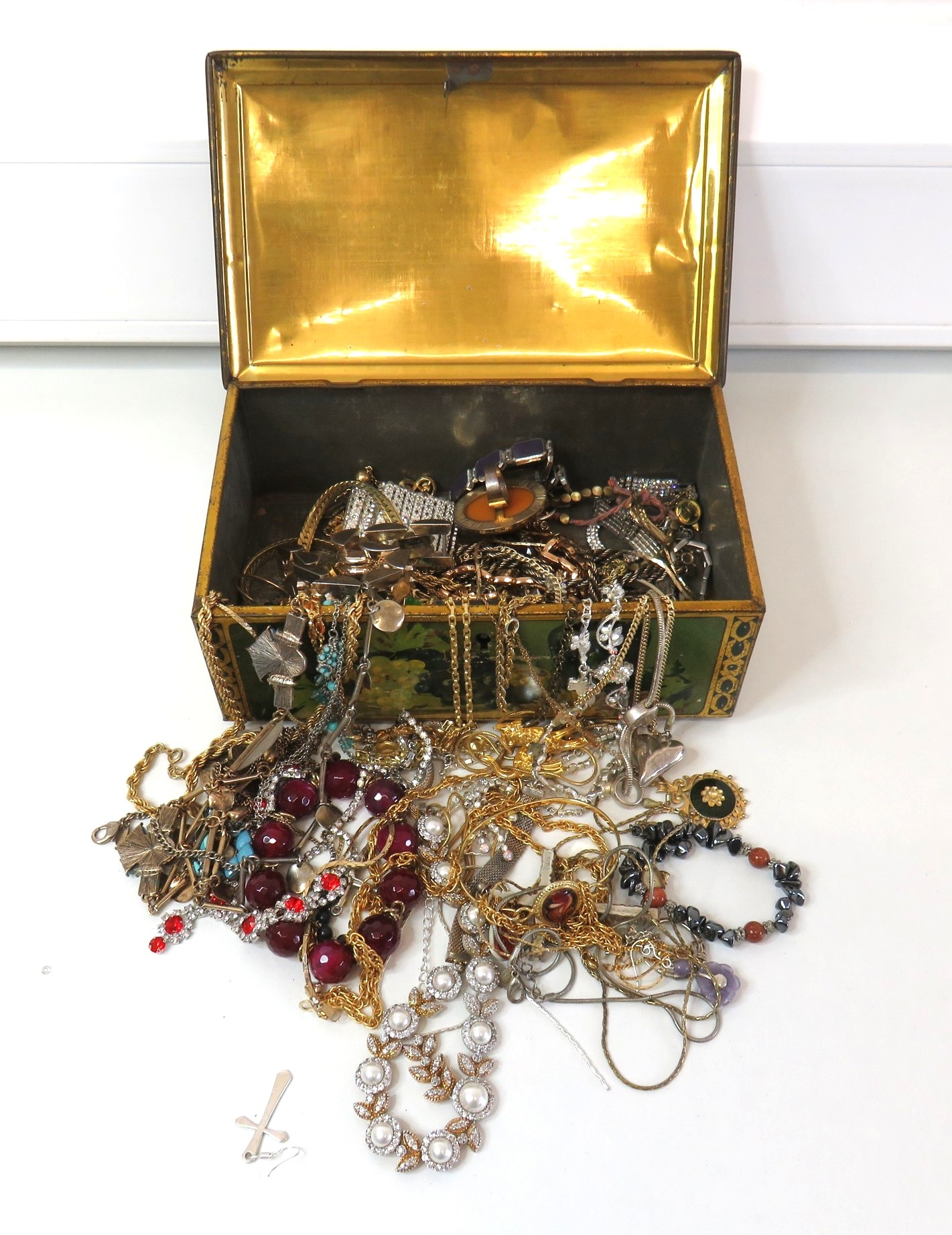 Vintage tin full of jewellery.