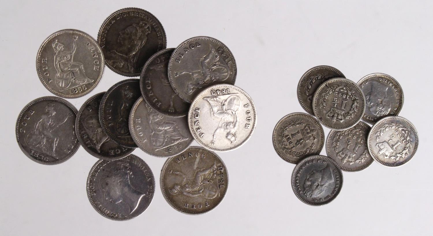 GB Silver Minors: Groats (11) noted 1838 VF, 1839 GVF, 1848/6 VF scratched, 1854 nVF, 1855 GVF/nEF, 1888 toned GEF; and Three-halfpences (7) various WIV and QV, mixed grade.
