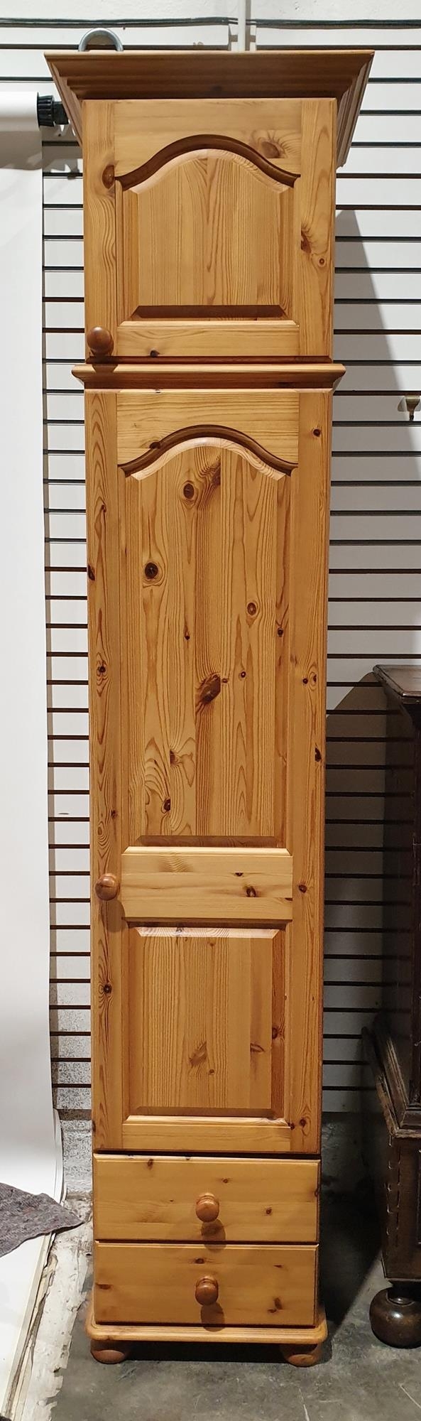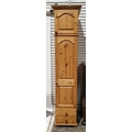 Modern tall pine narrow wardrobe, surmounted with a panelled cupboard and above two short drawers with turned knop handles, approx. 230cm high x 42cm wide x 53cm deep