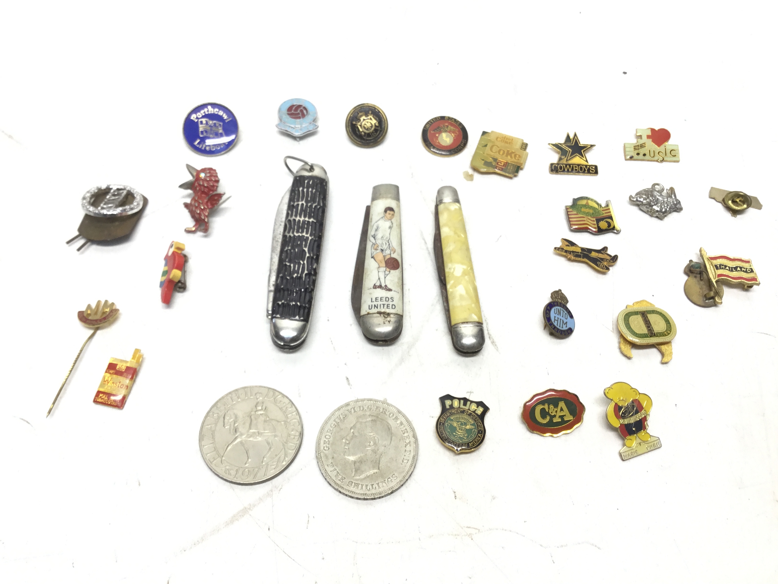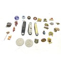 Pin badges including Coventry and Leeds football club, south wales borderers and penknives