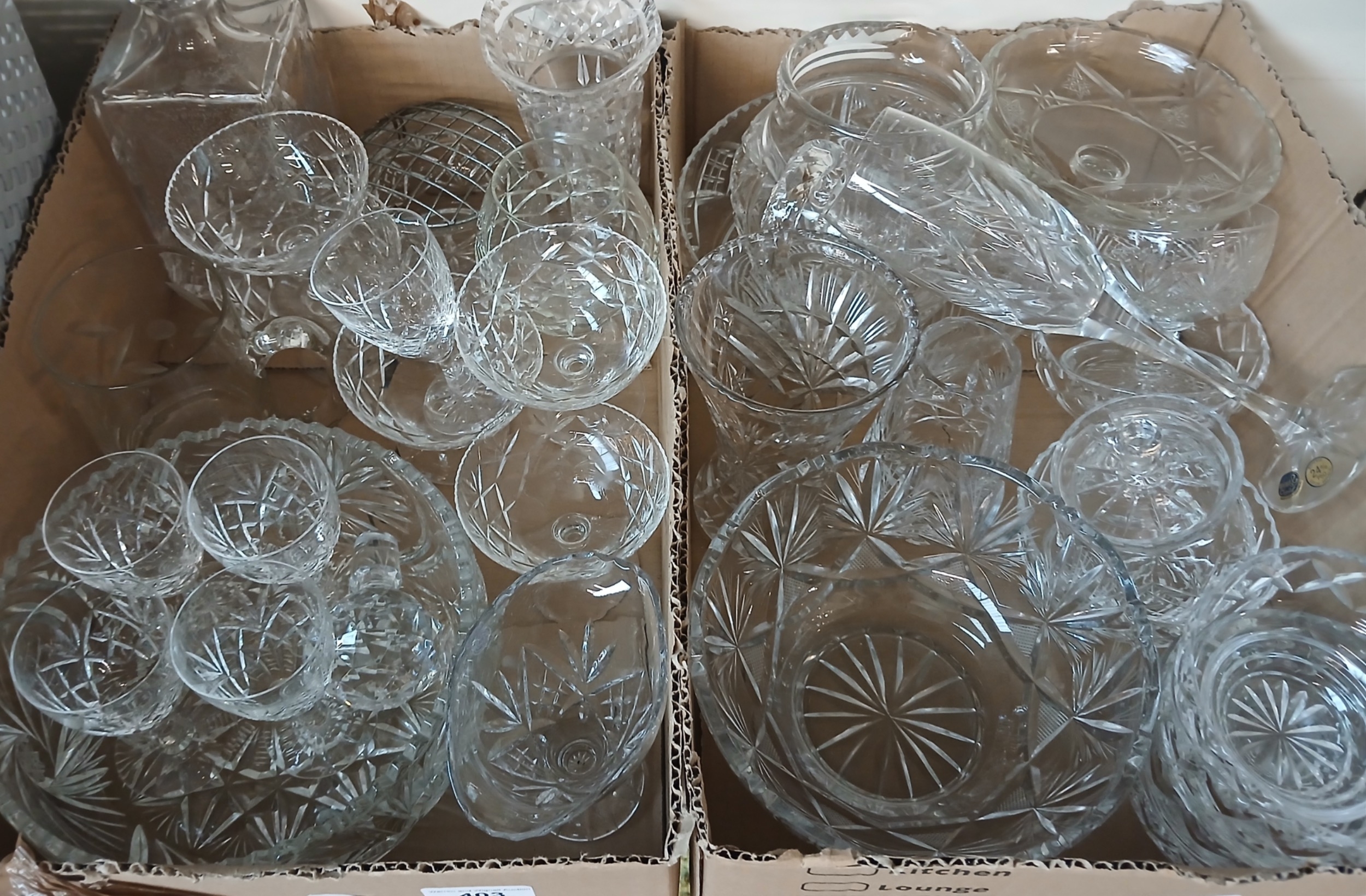 2 boxes of glass ware including drinking glasses, bowls, vases dishes, decanter etc